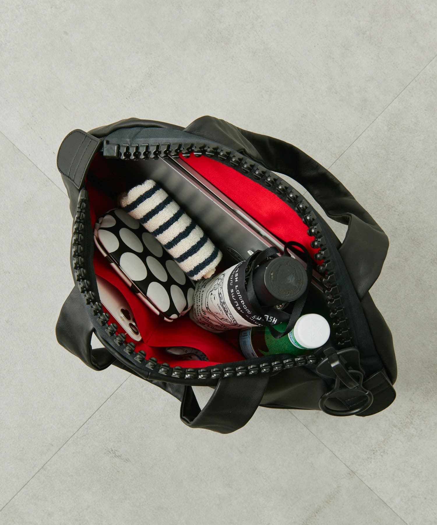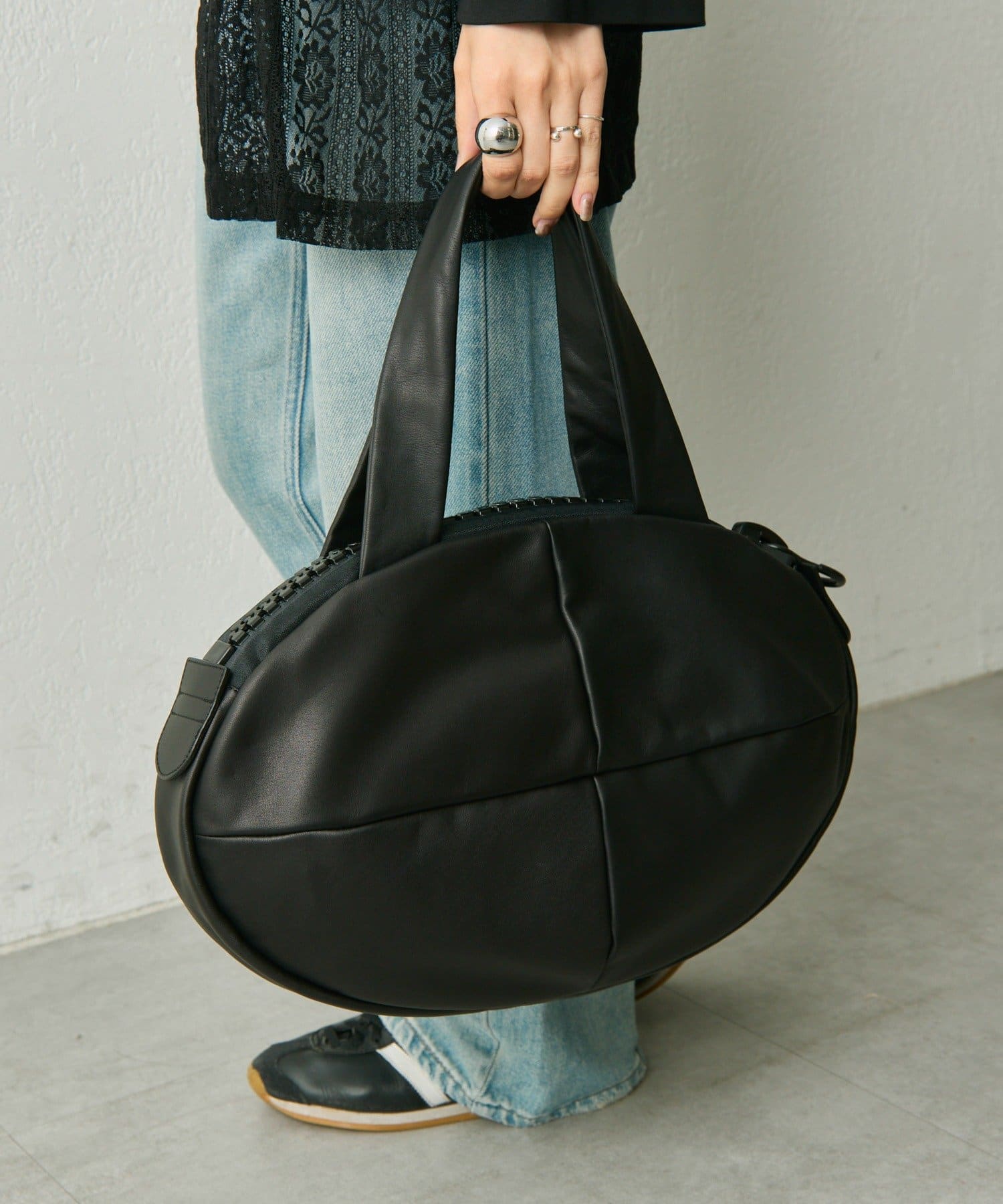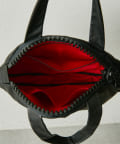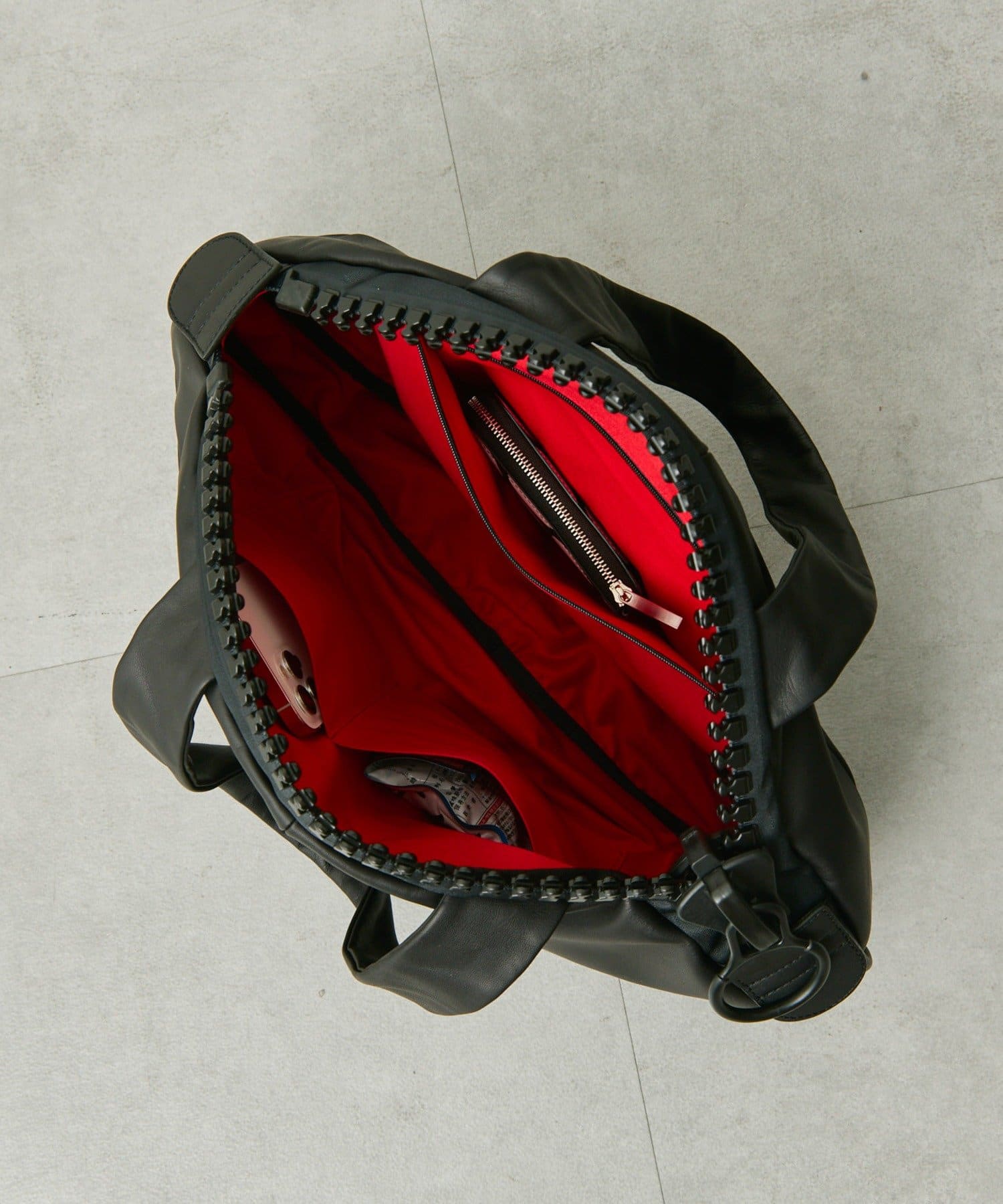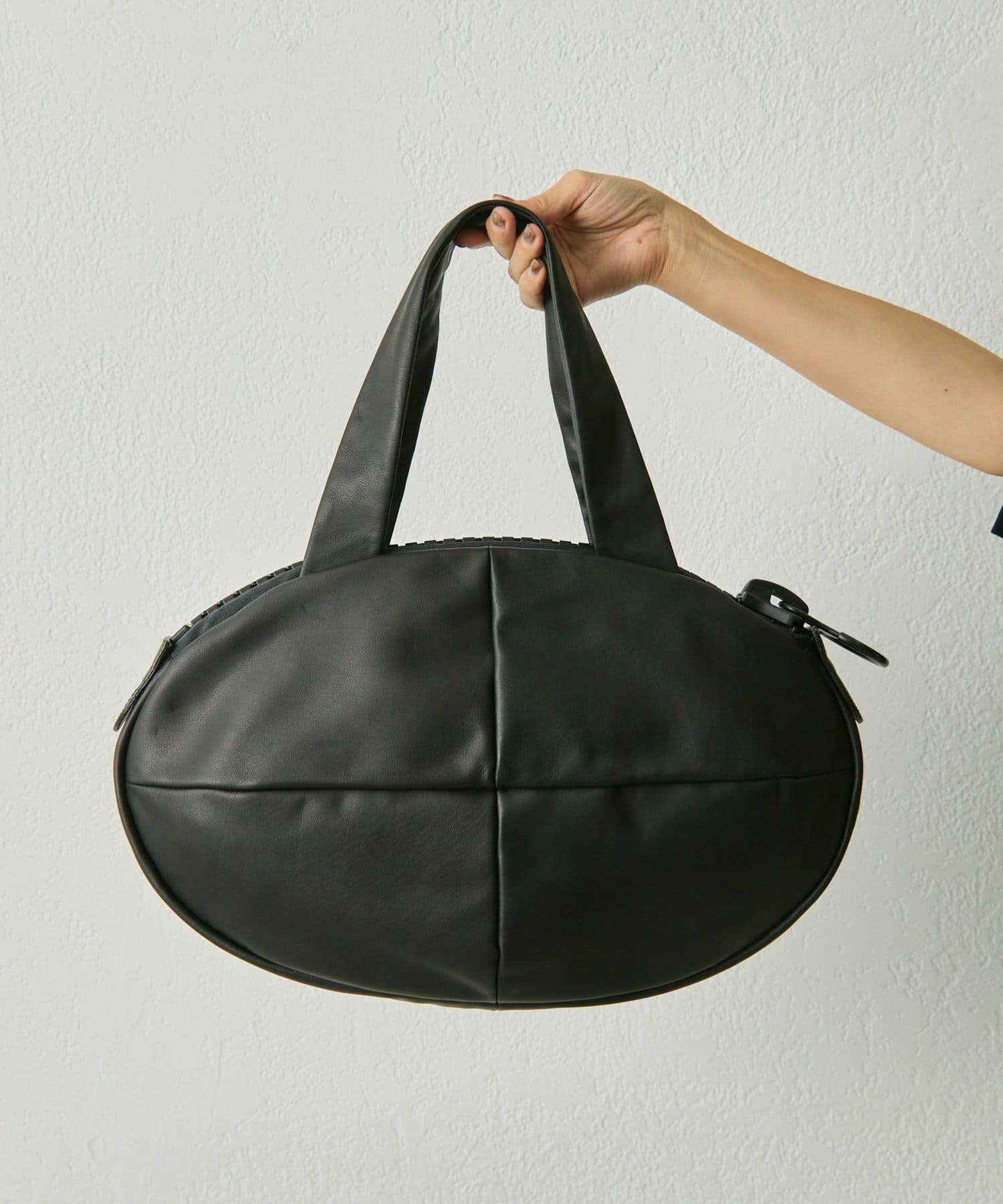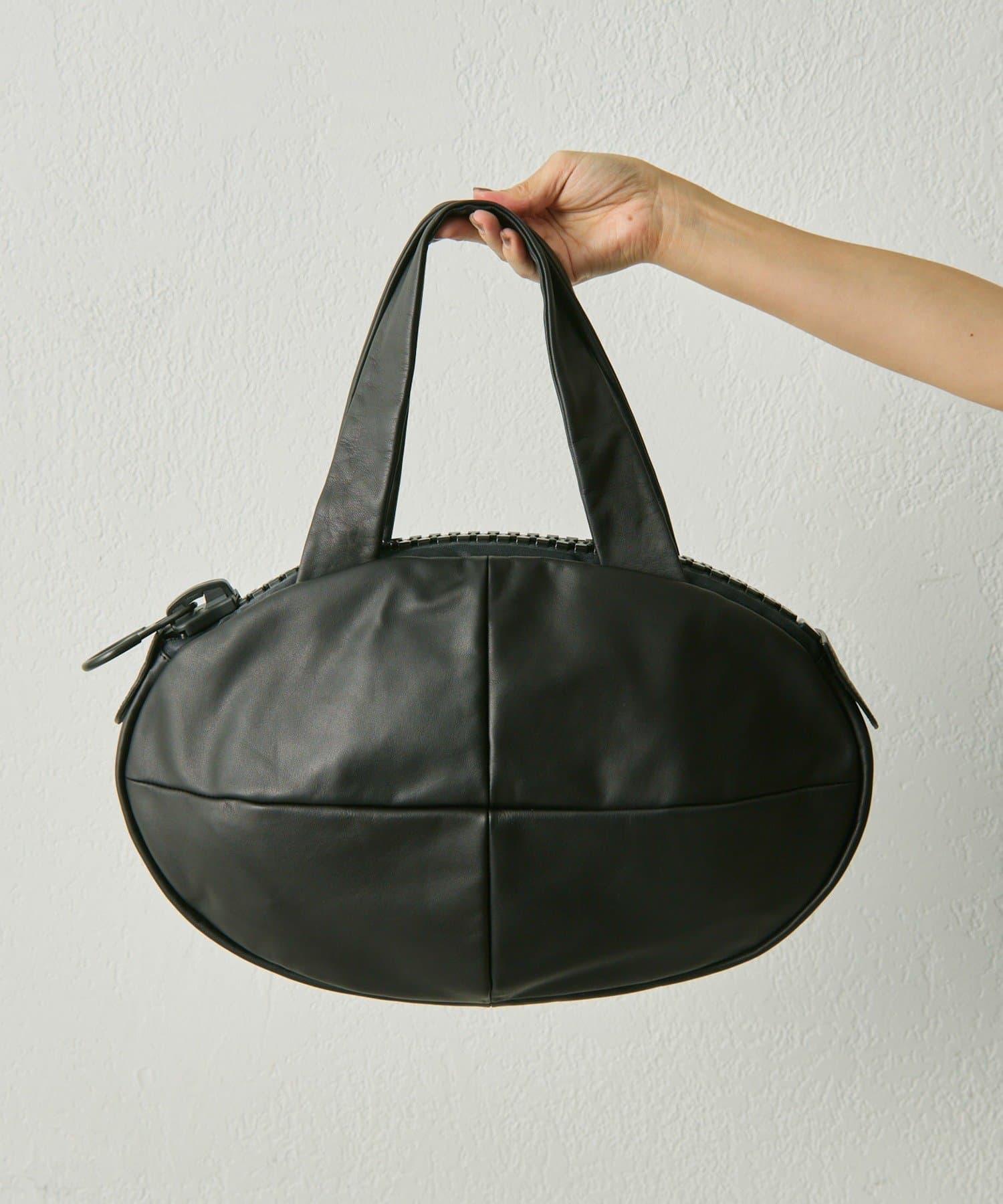 ブランド創設時から続く工業用ビッグファスナー(25bis)を使用した、楕円形状のユニークなレザートートバッグ。