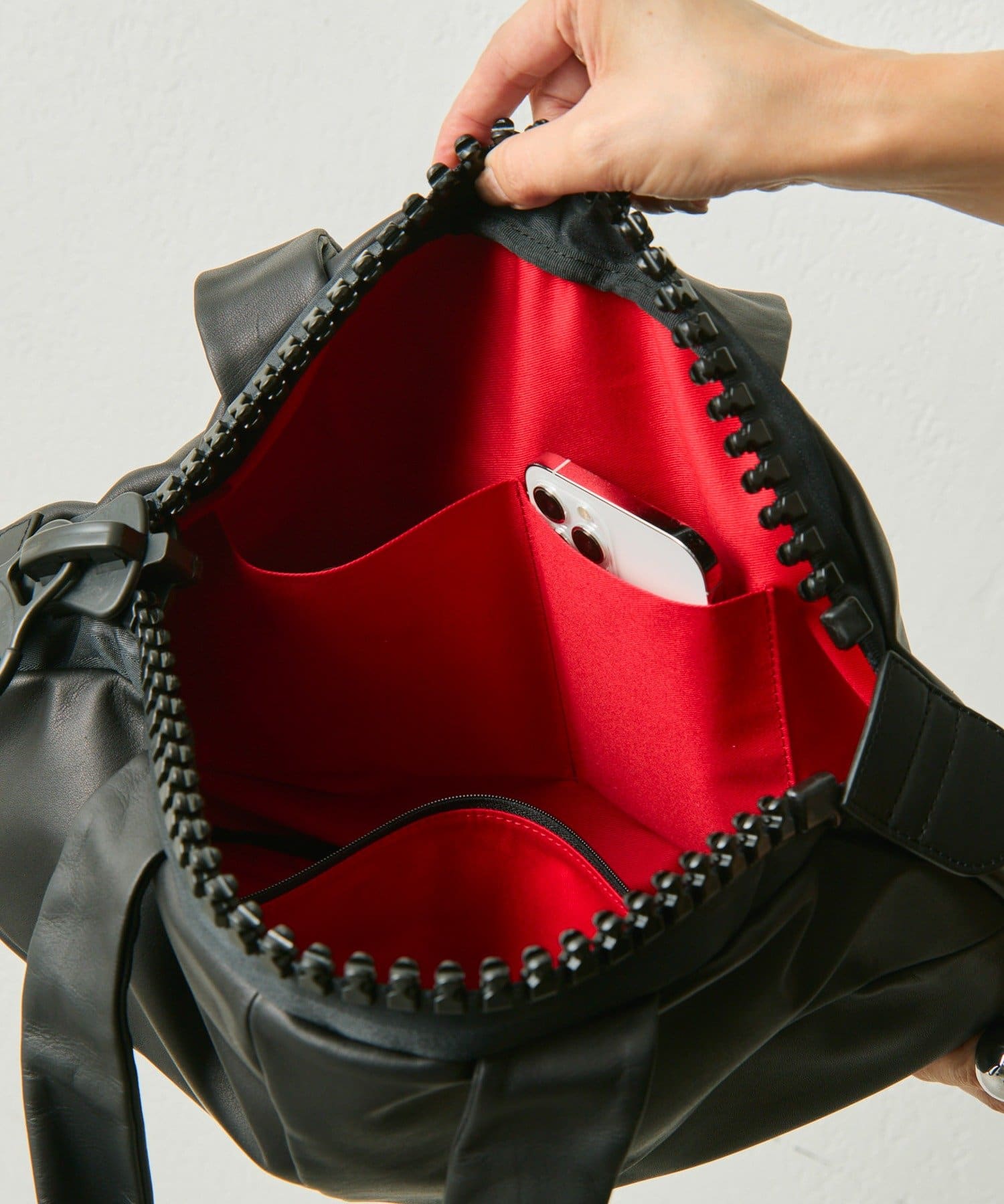 開閉部にはブランドの象徴である大きなファスナーを採用。