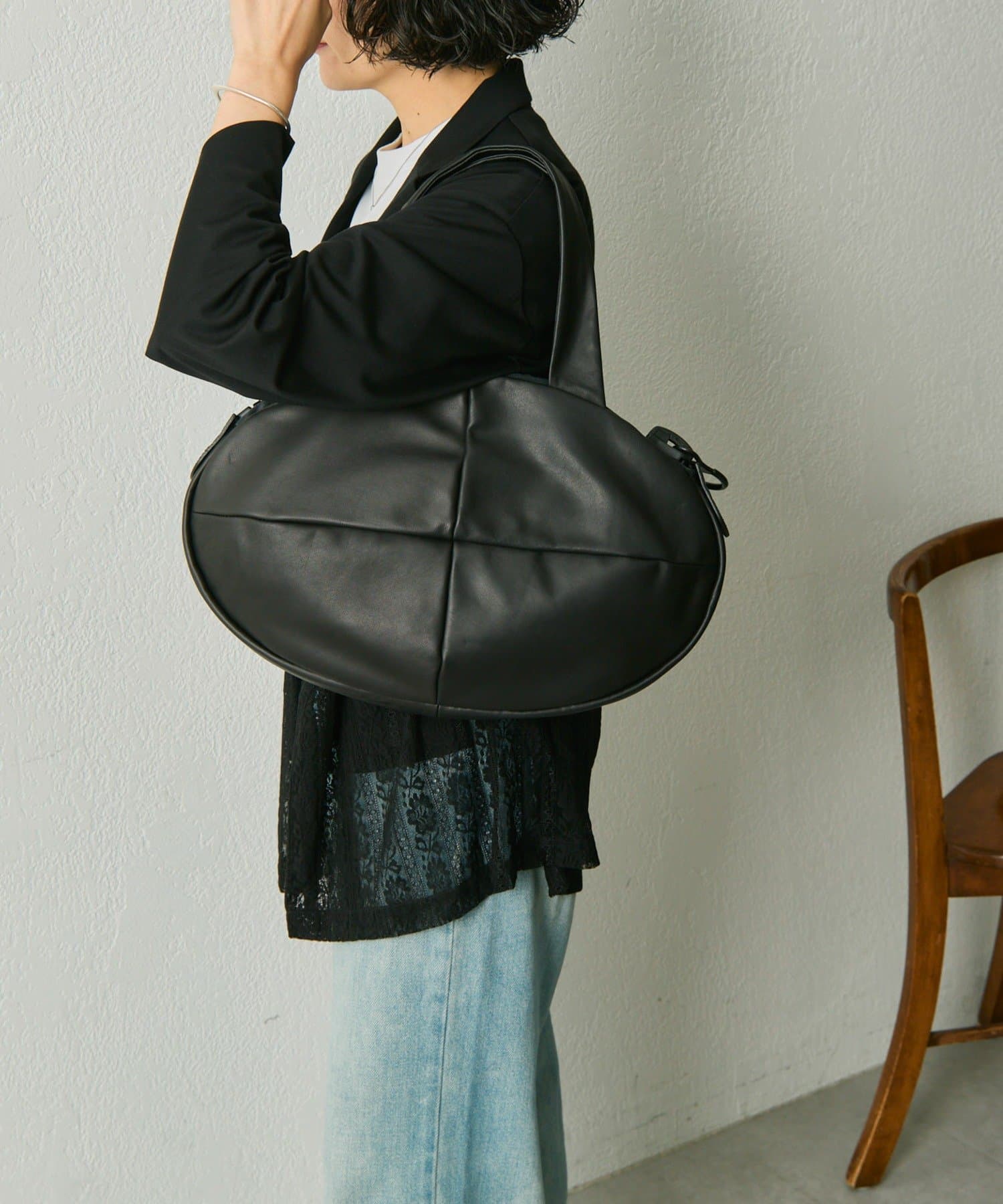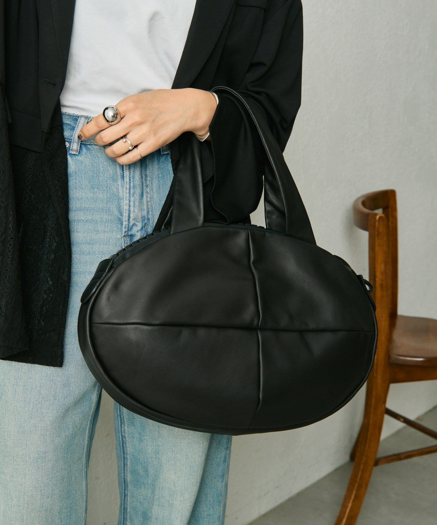 丸く膨らむフォルムは見た目以上の収納力を持ち、A4ファイルやノートPCもすっきり収納可能。