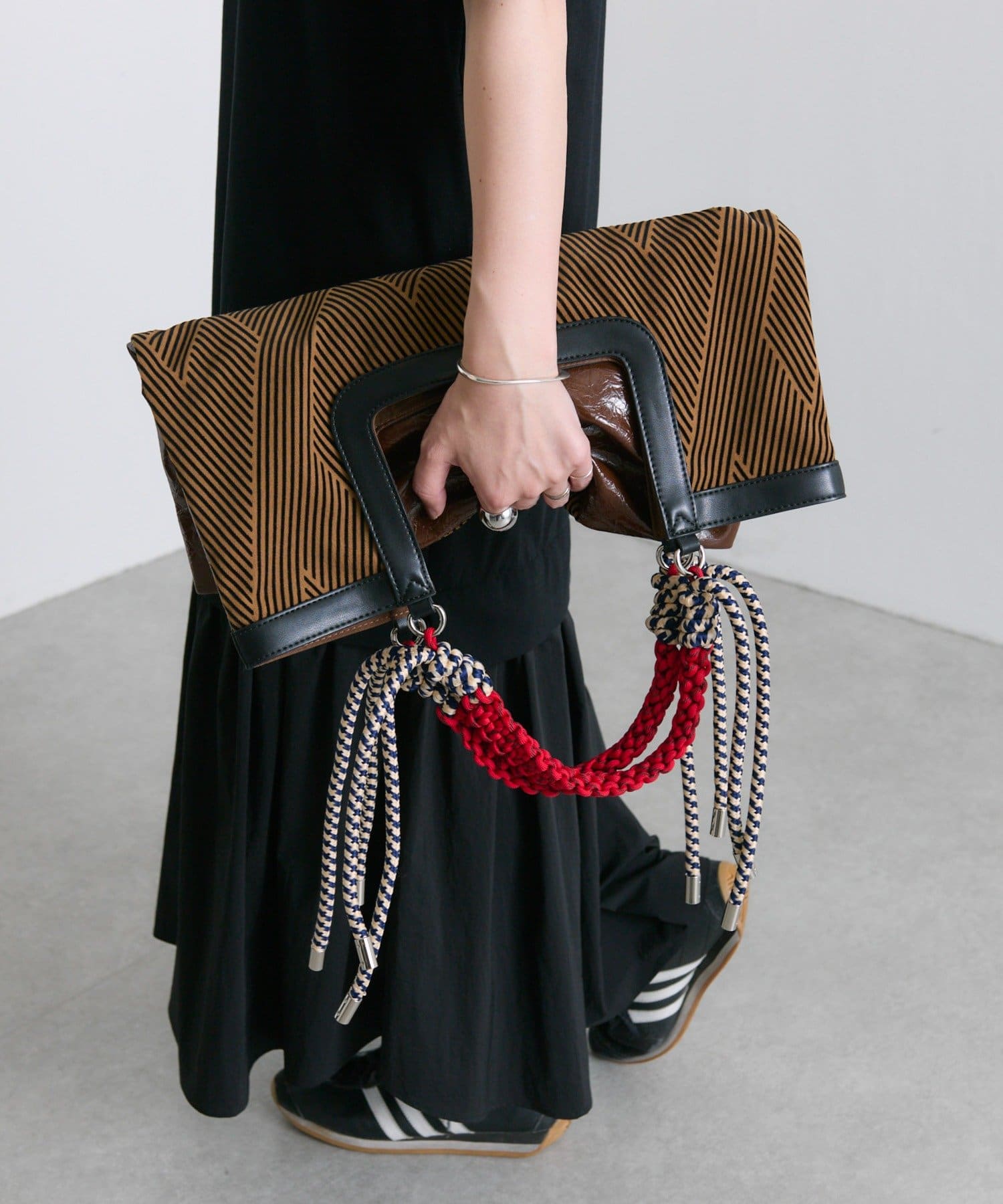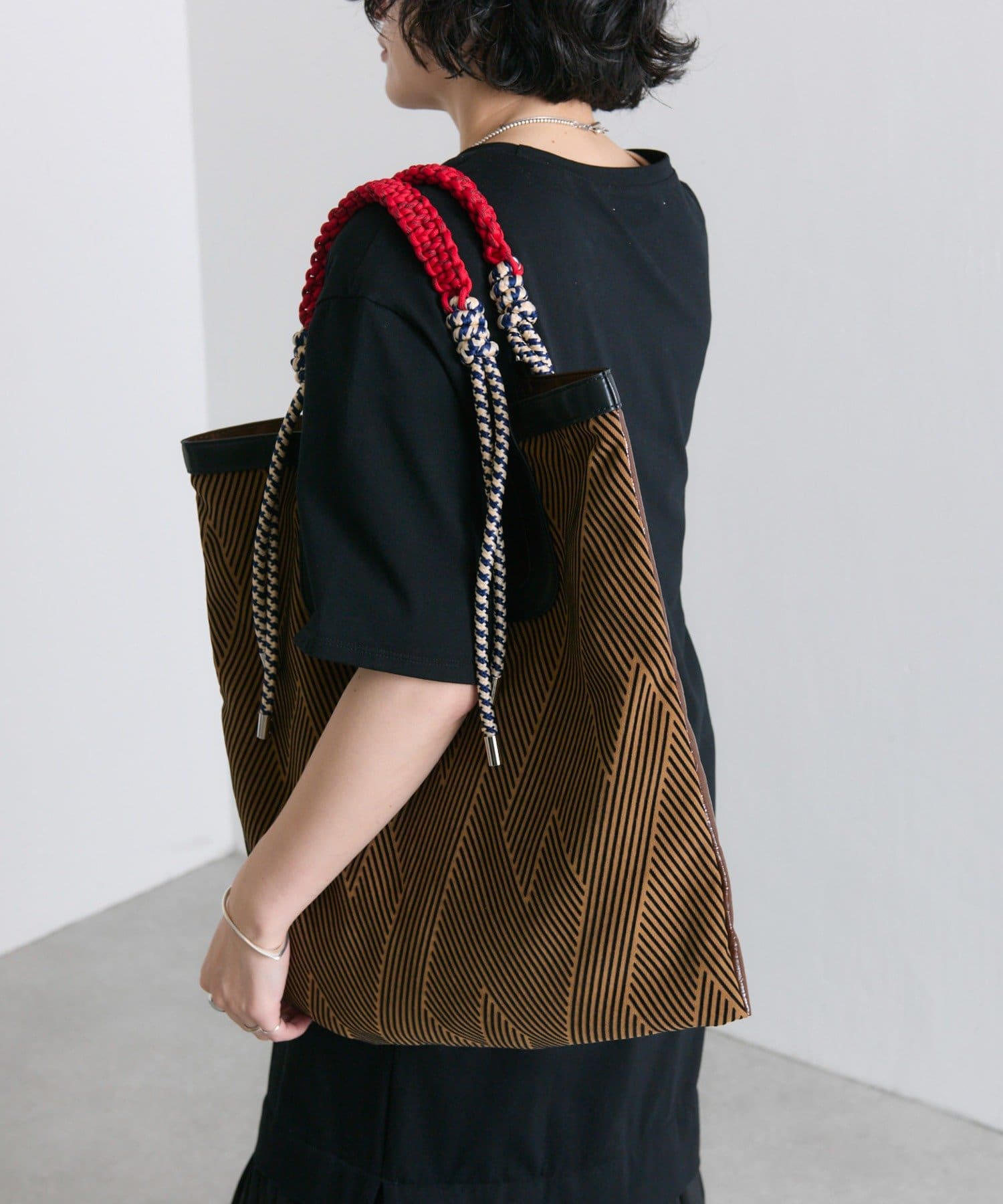 ネットで見かけたときは既に「予約」になっていたので、店頭には無いだろうなと思って通りがかったら展示してあって飛び付いてしまいました。A4が入るのと、持ち手のパラコード、起毛した織り柄とピカピカの合皮使いが面白くておしゃれ。肩にもかけやすい。