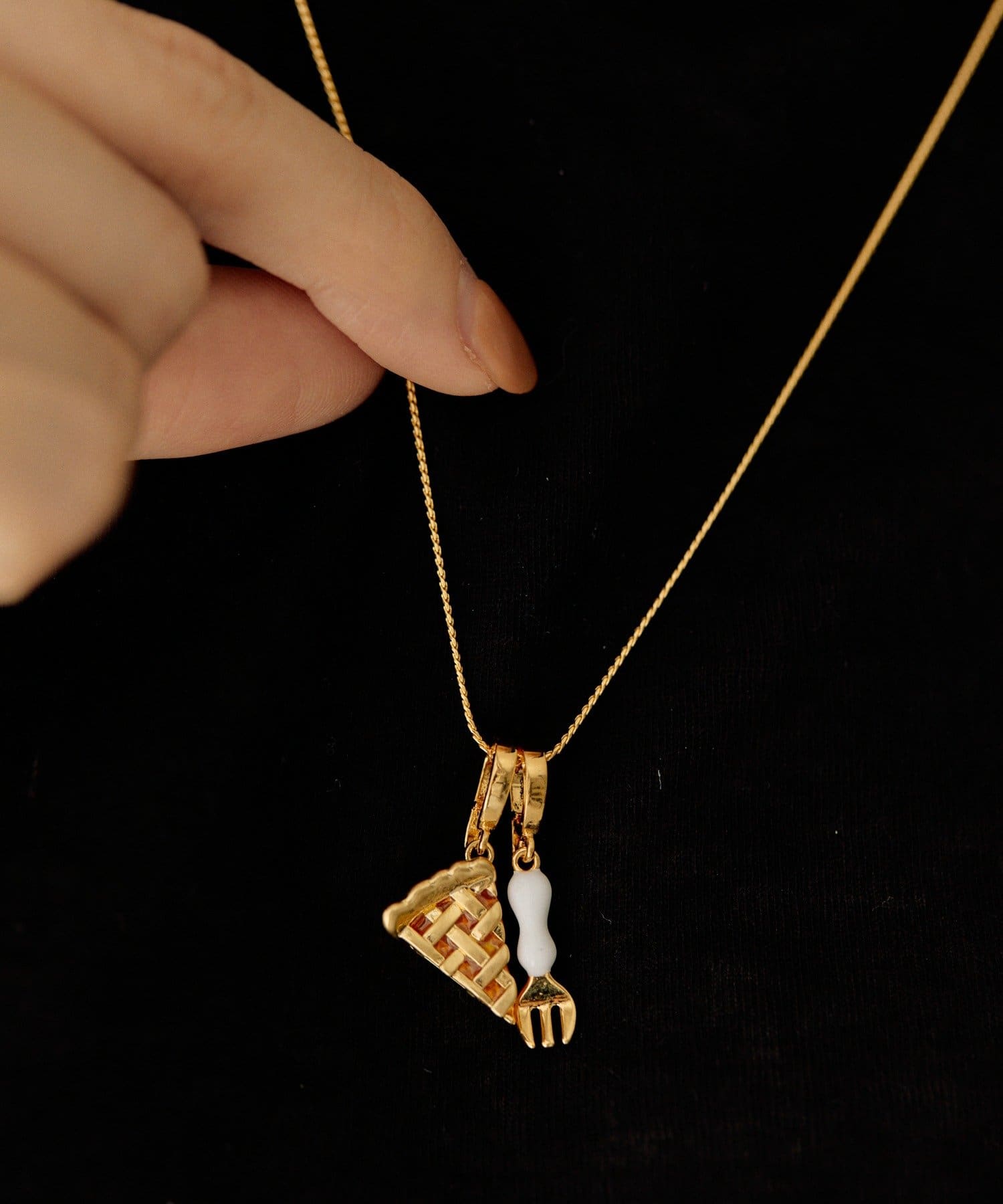 美味しそうなアップルパイとフォークのペンダントトップは、見ているだけで心が弾みます。