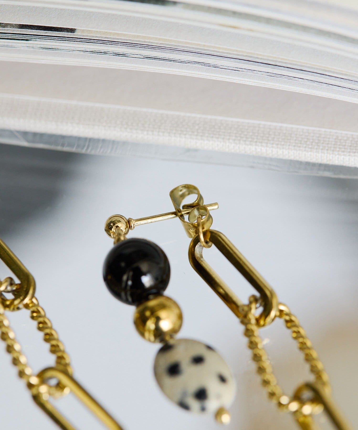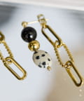 黒とゴールドのコントラストに、ダルメシアンジャスパーの柄がミックスマッチ。