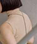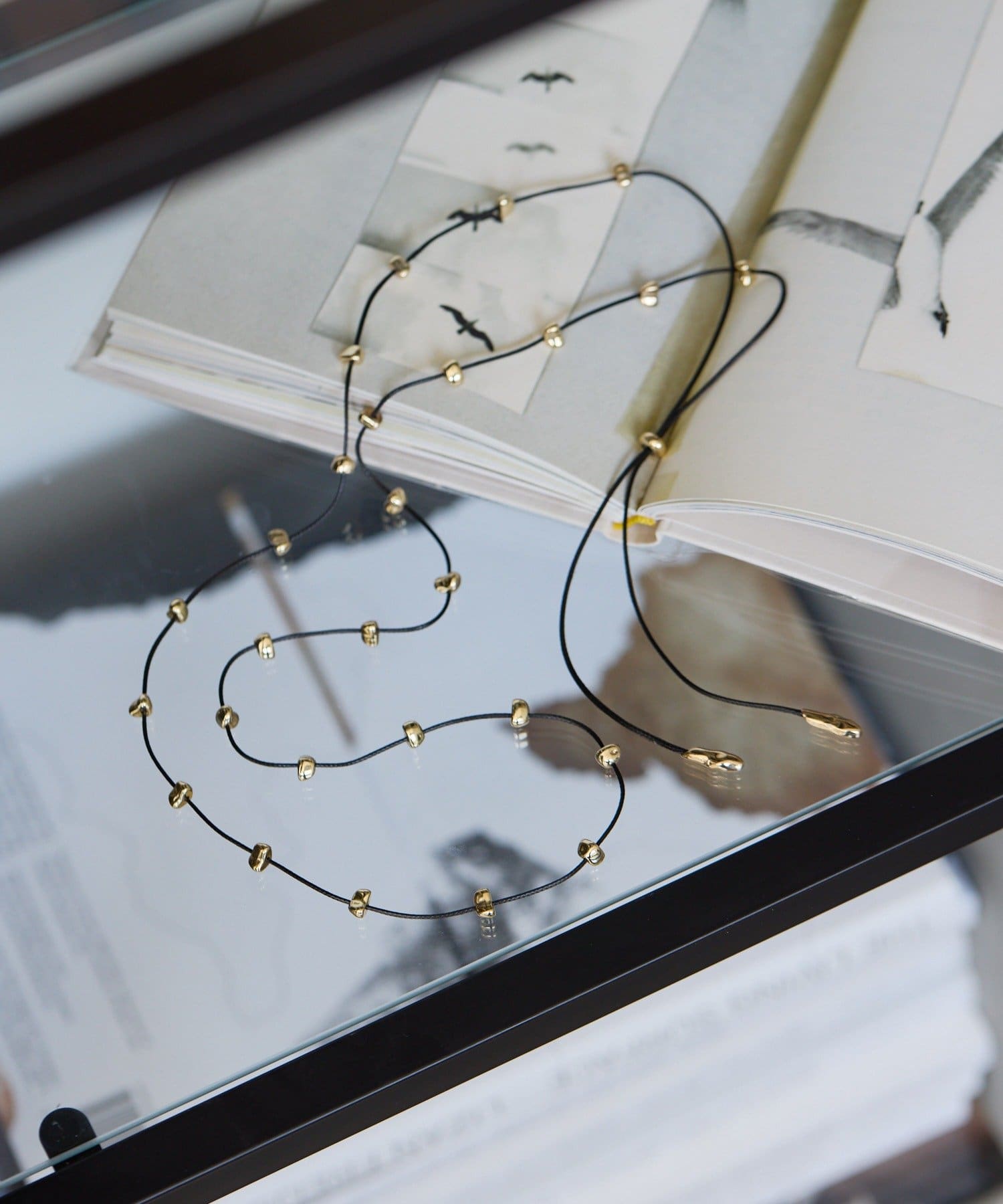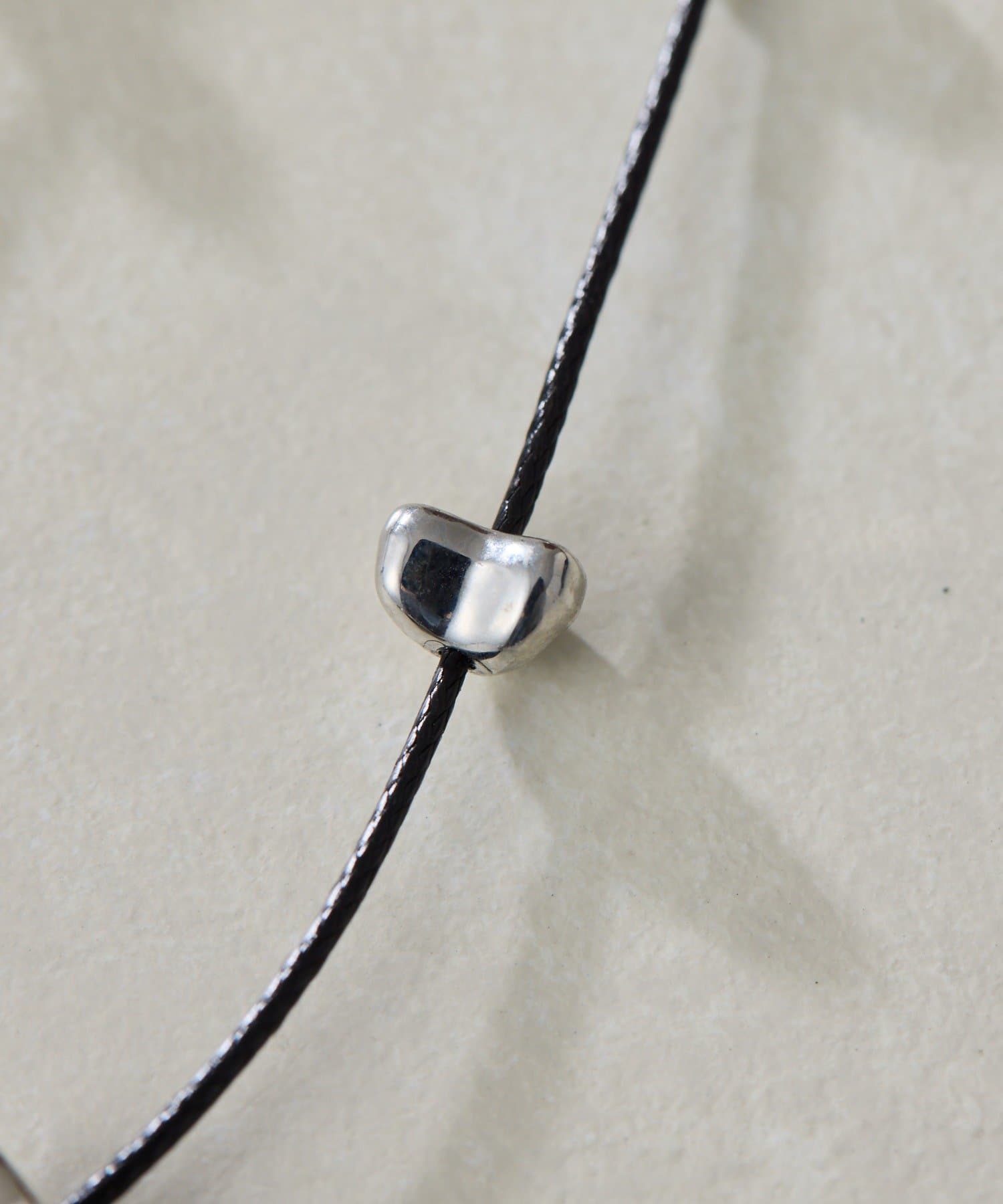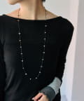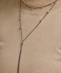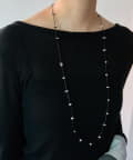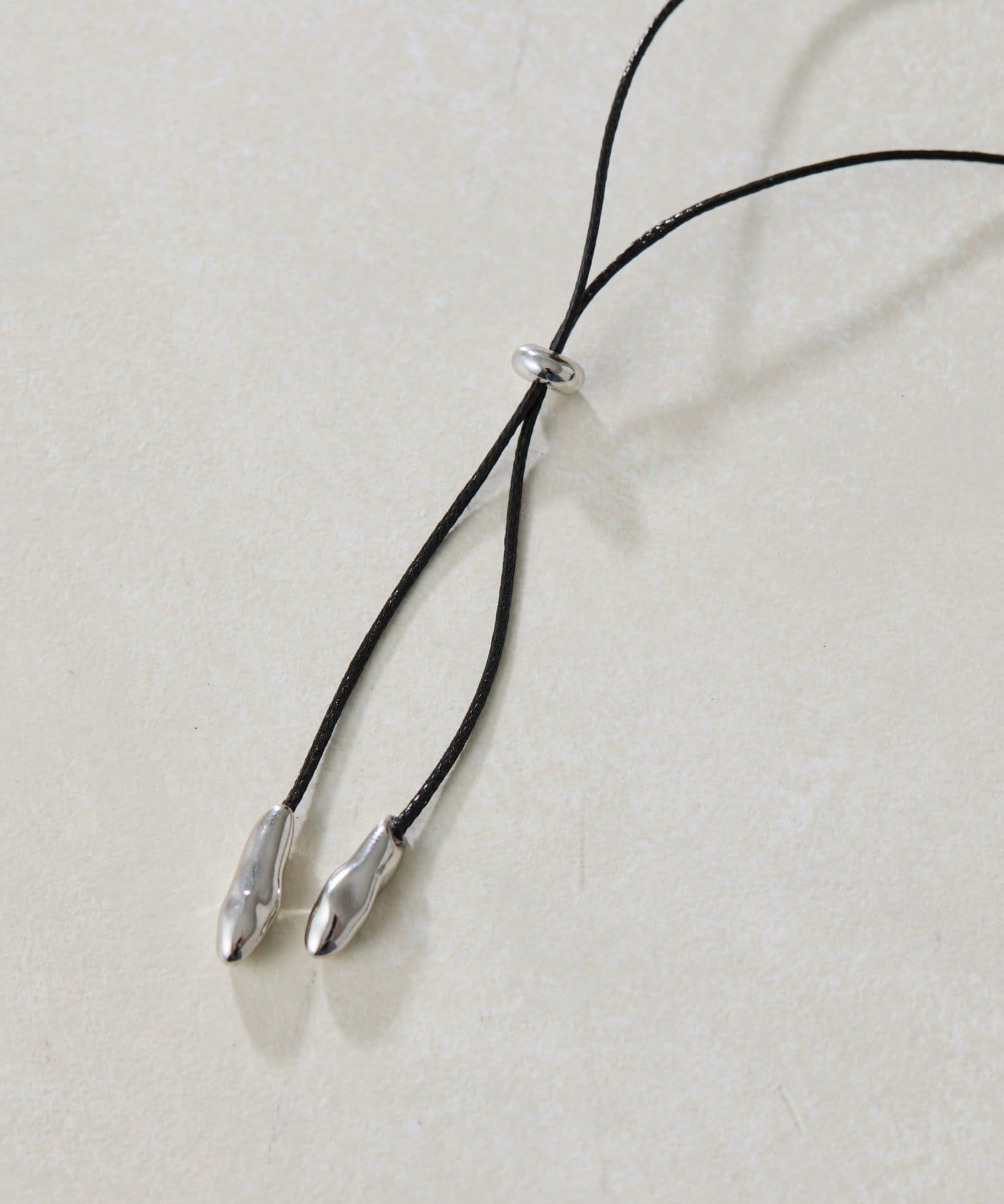 黒のコードにメタルの輝きが映える、スタイリッシュなロングネックレス。