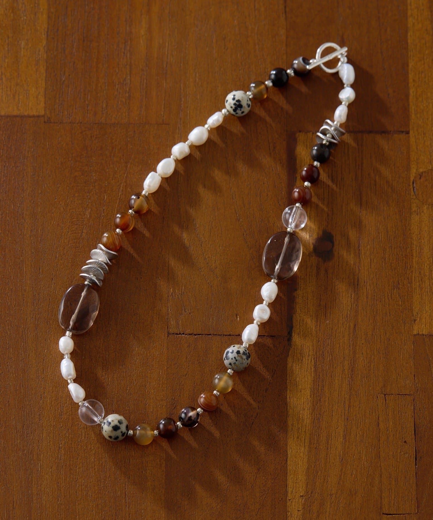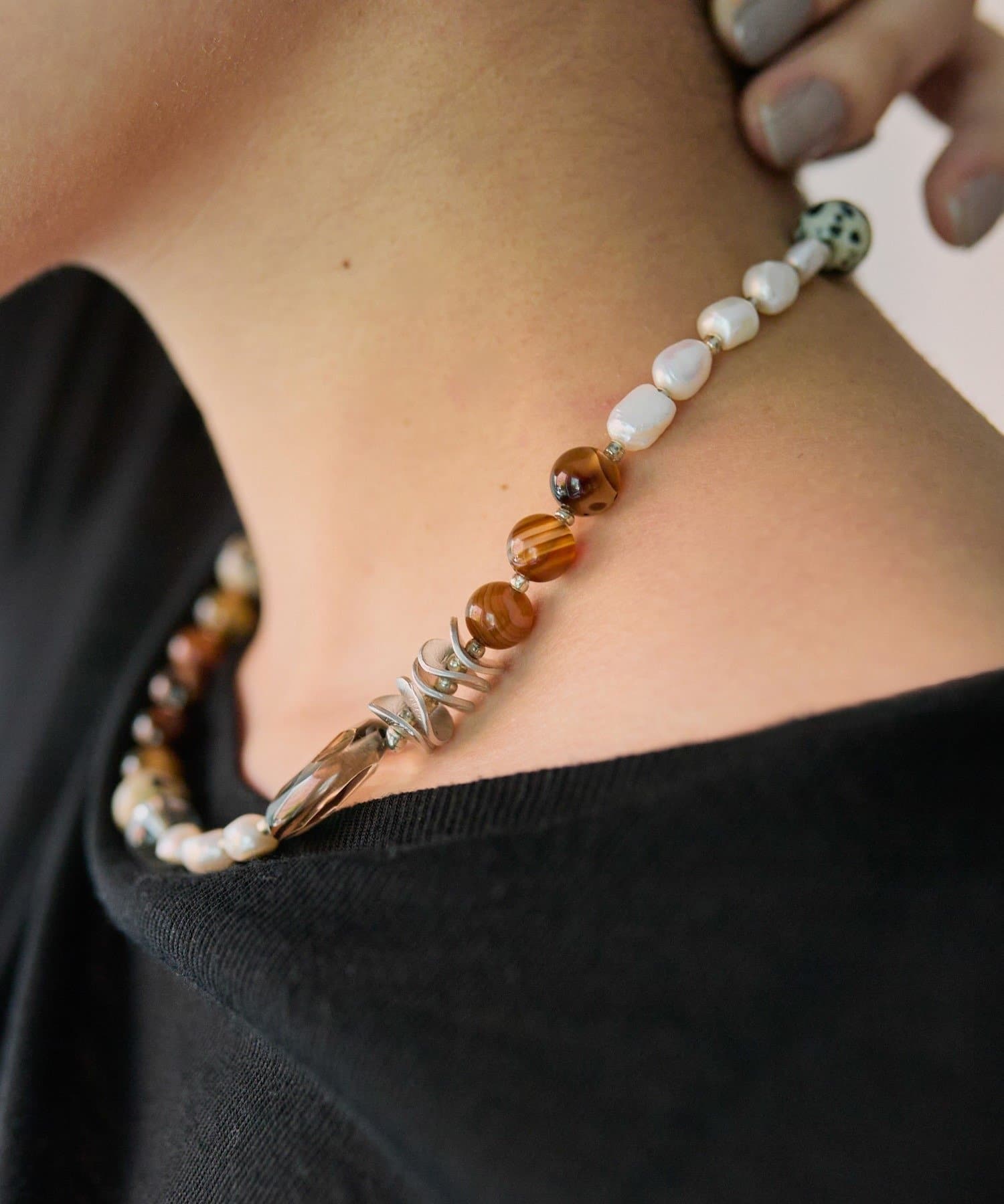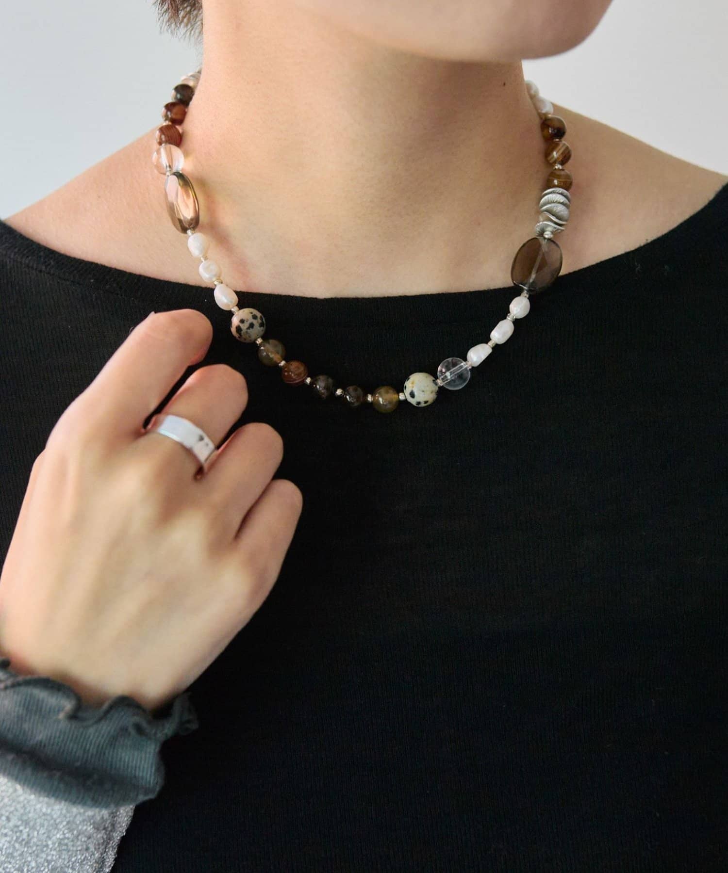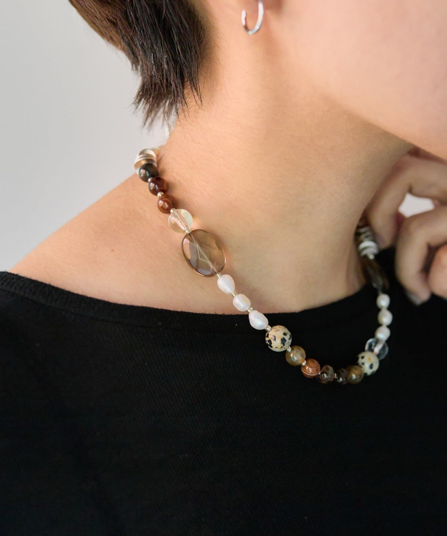 天然石と淡水パールの組み合わせが、装いに上品な彩りを添えます。