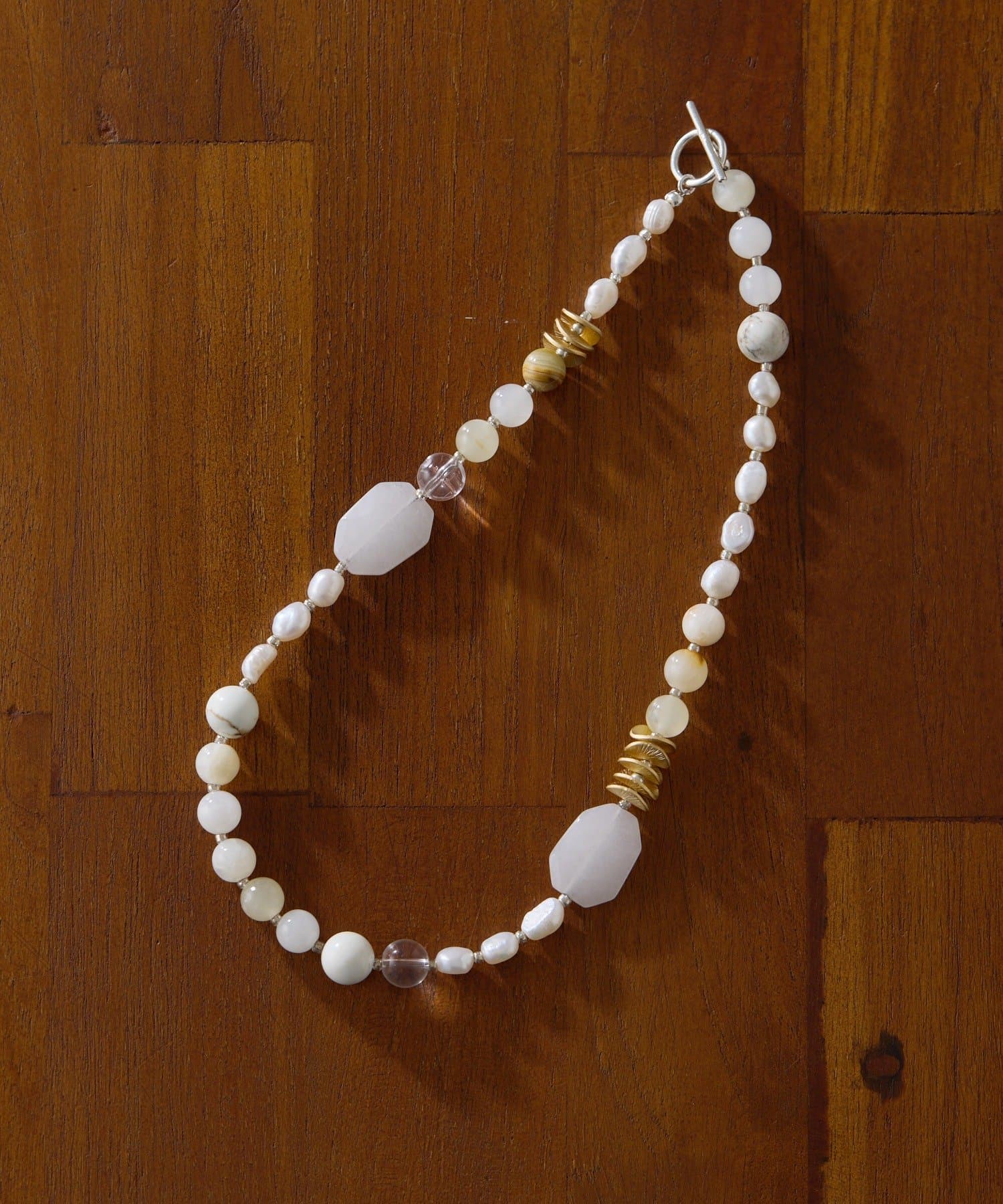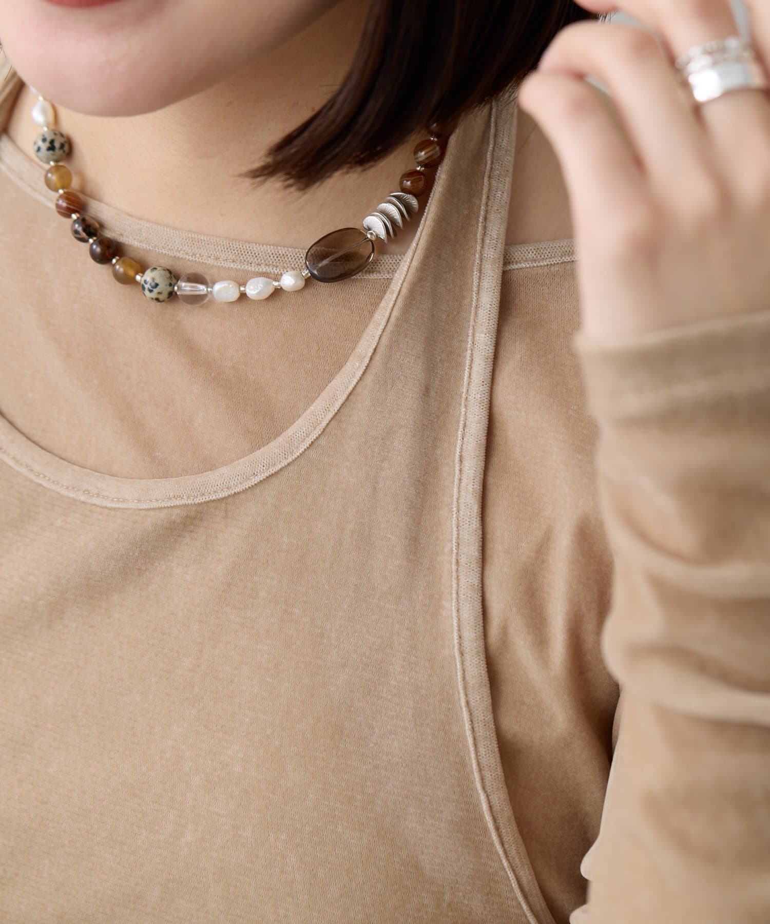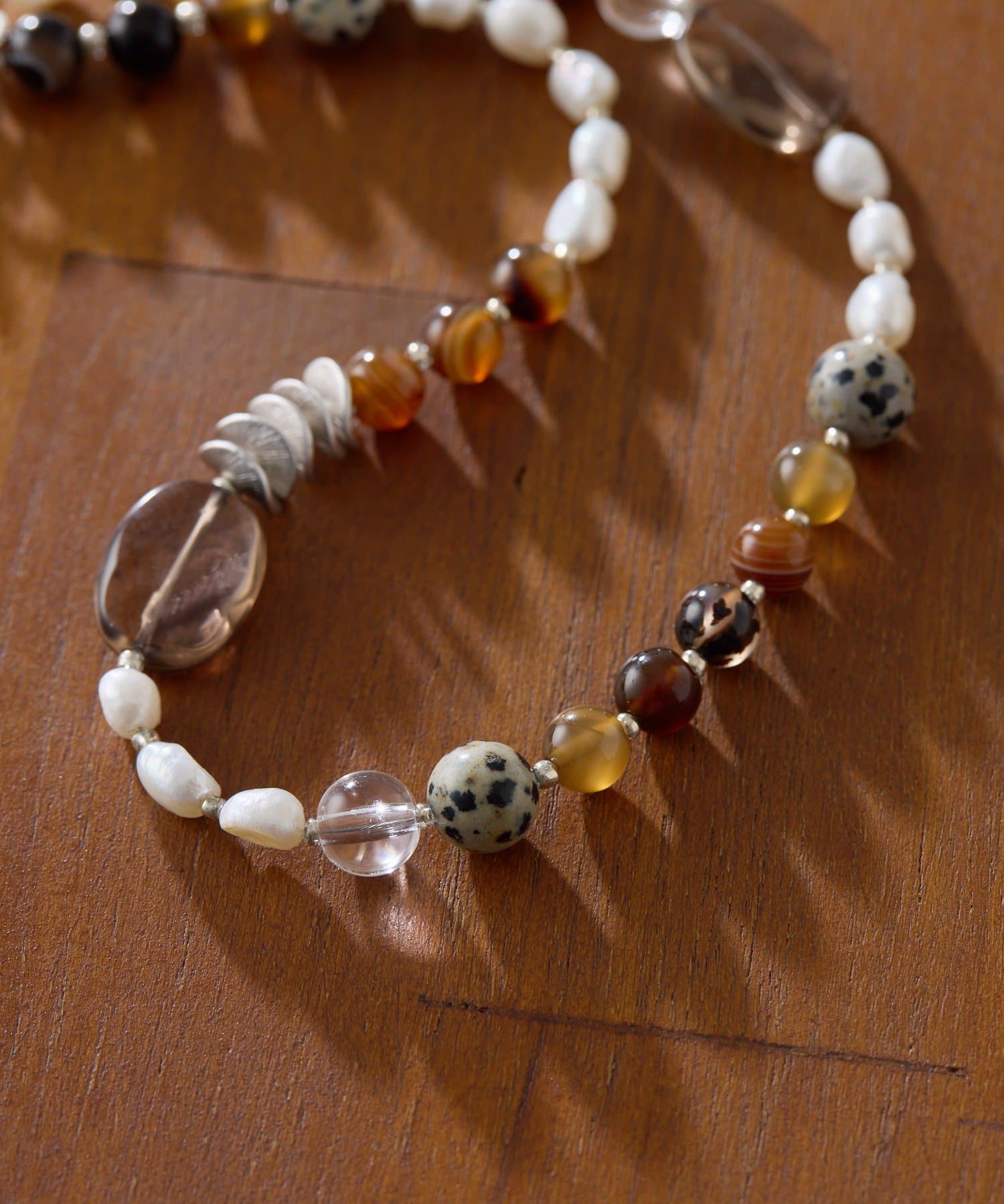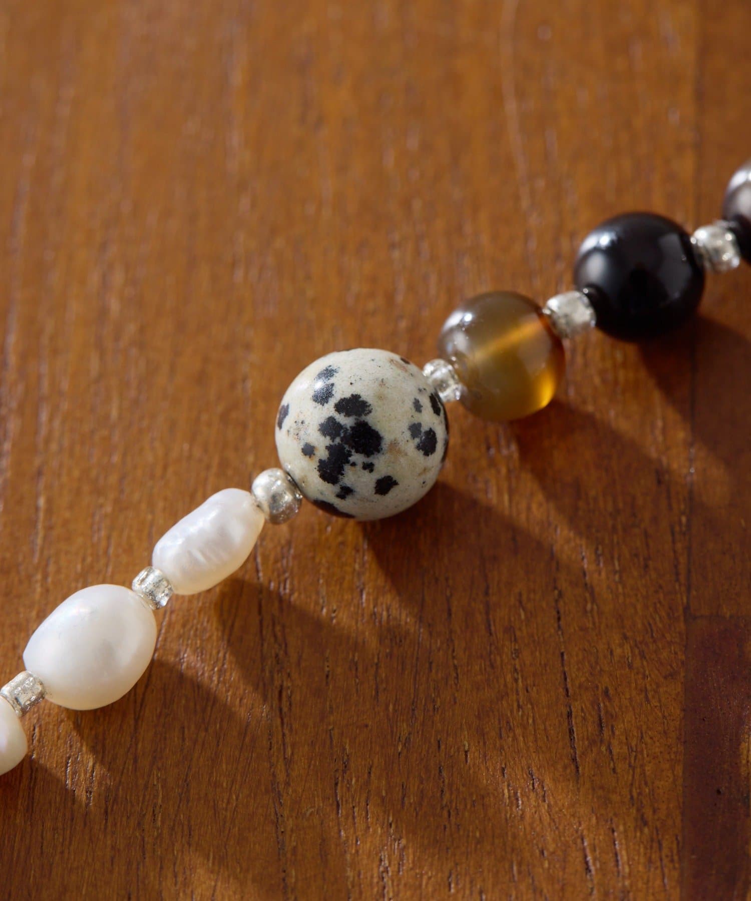 天然石と淡水パールの組み合わせが、装いに上品な彩りを添えます。