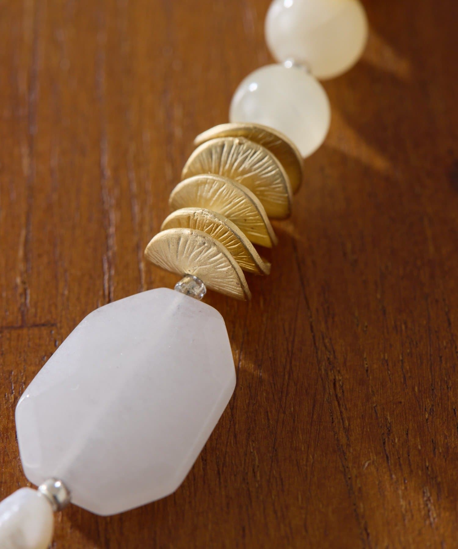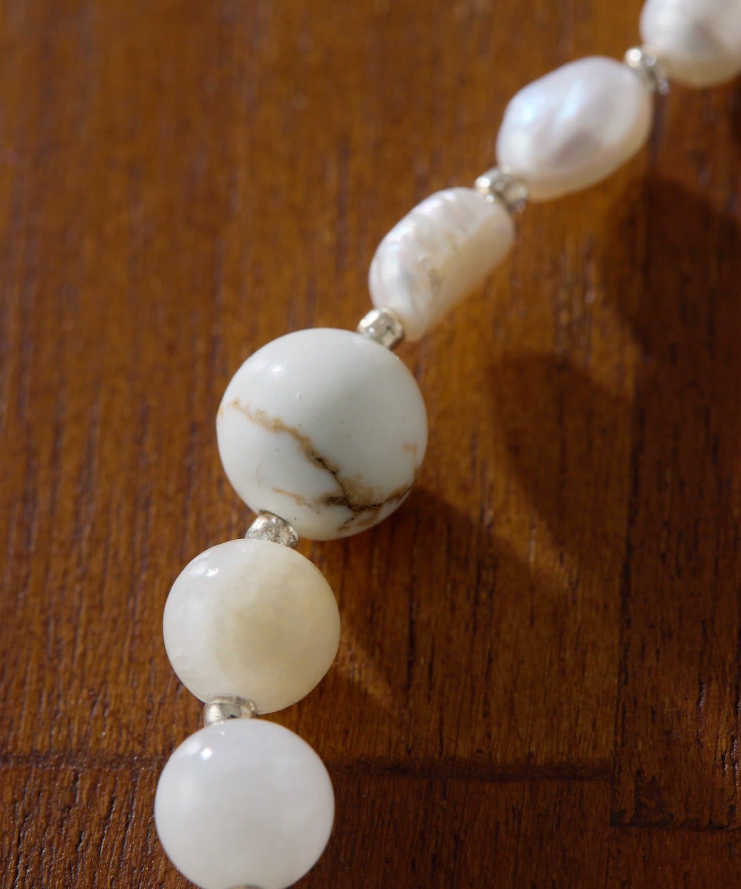 天然石ならではの自然な模様と、ひとつひとつ異なるパールの柔らかな輝きがポイント。