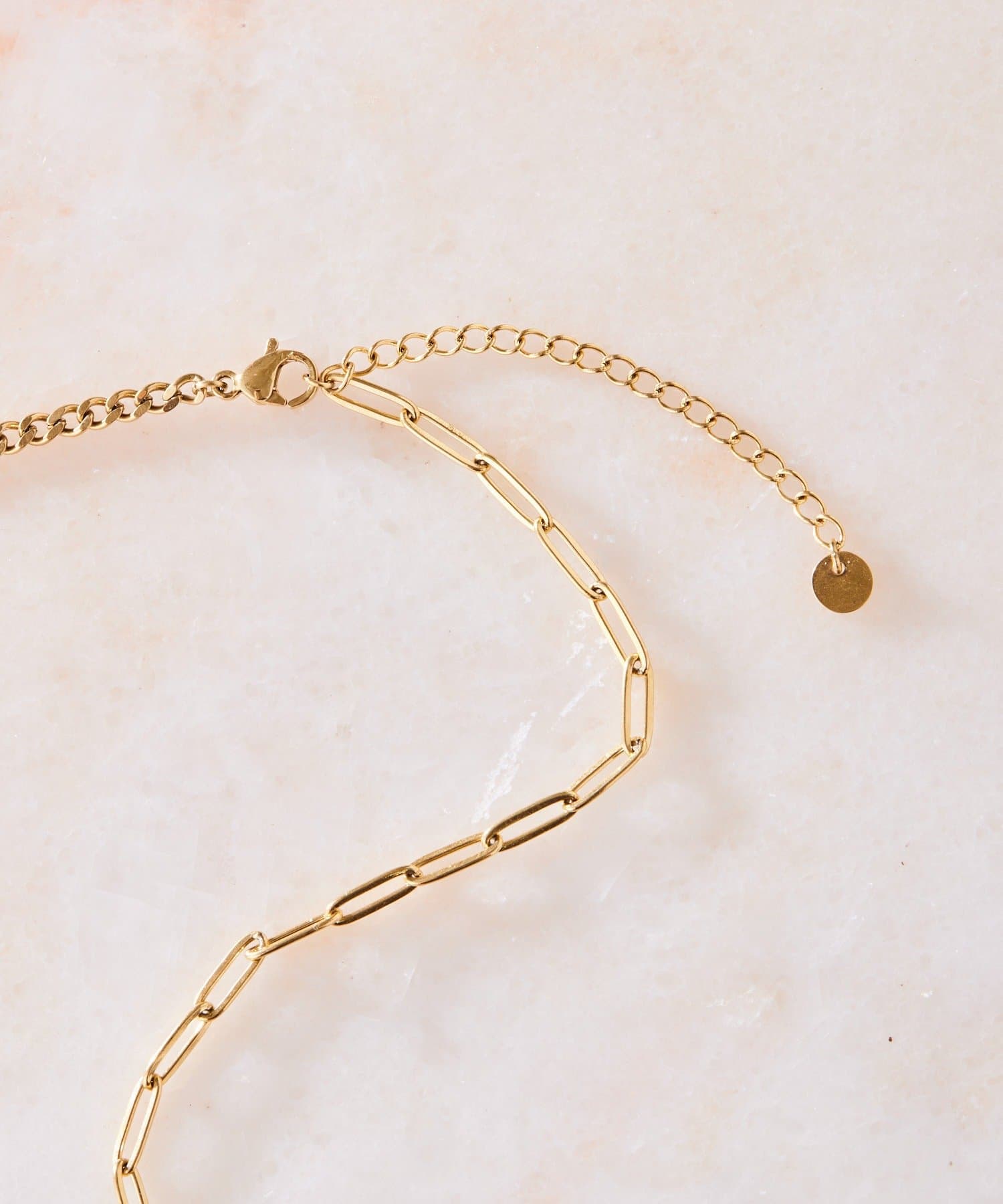 また、程よいサイズ感のある2種のチェーンを使用することで大人カジュアルな雰囲気のコーデにも合わせやすいです。