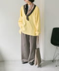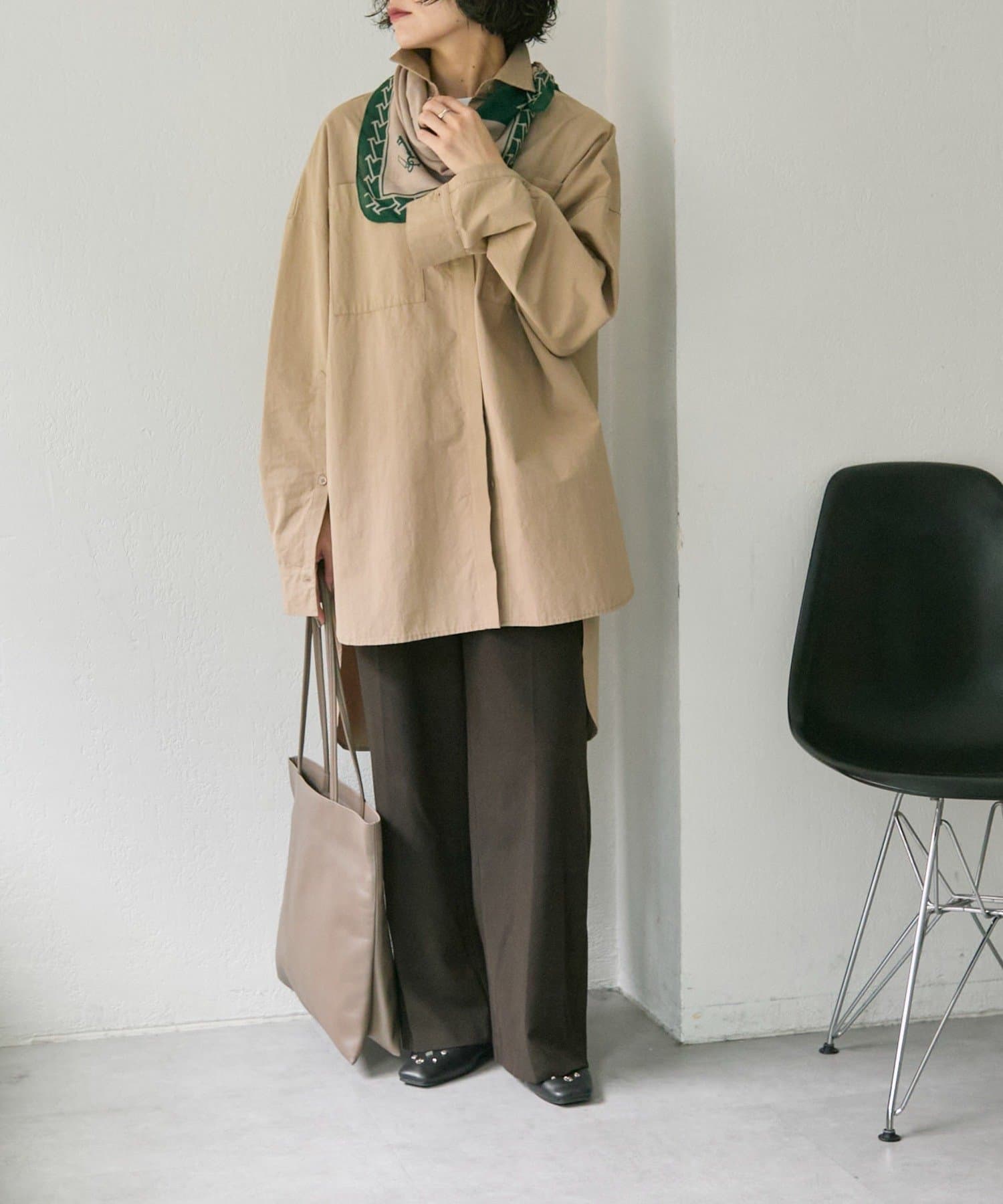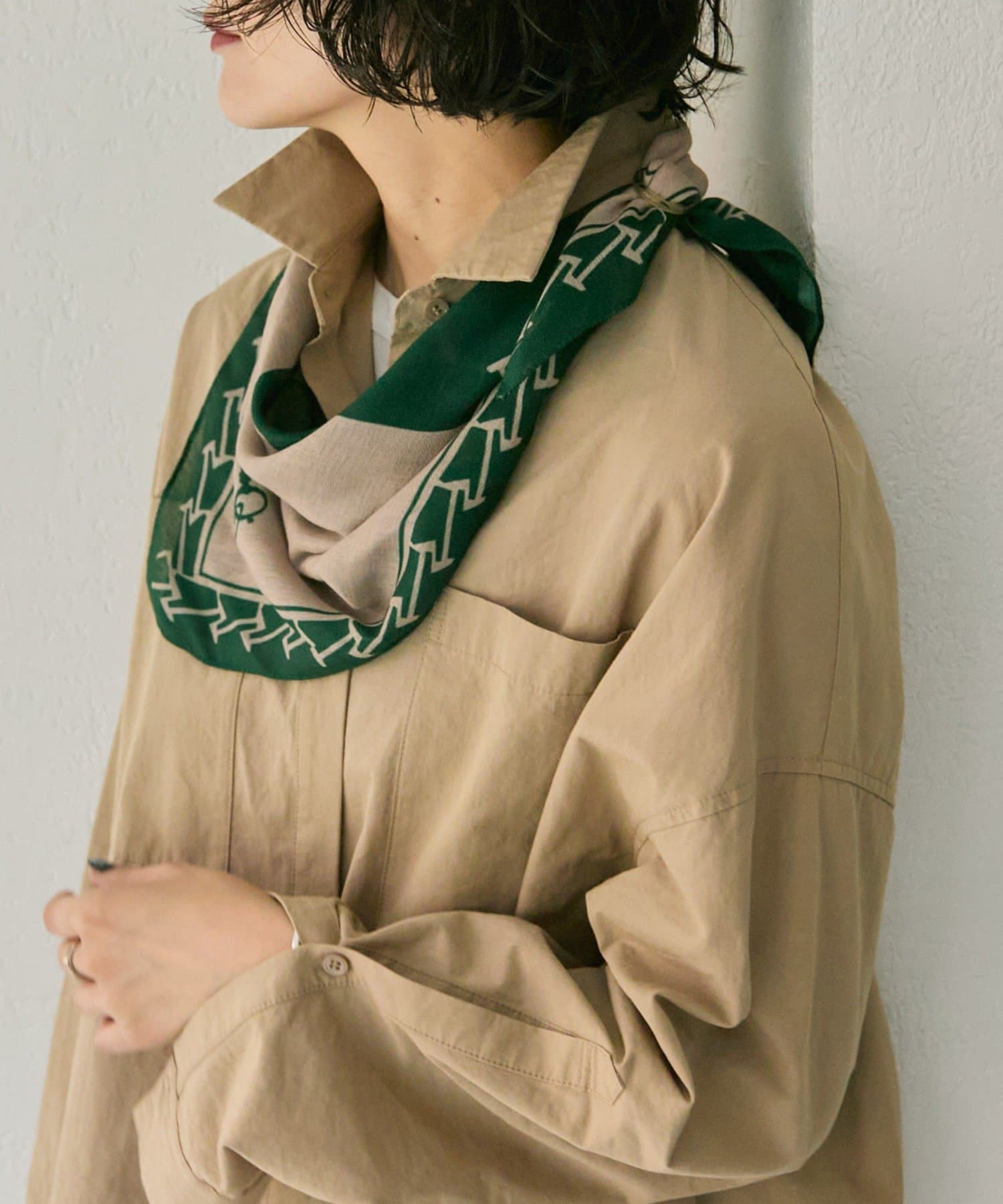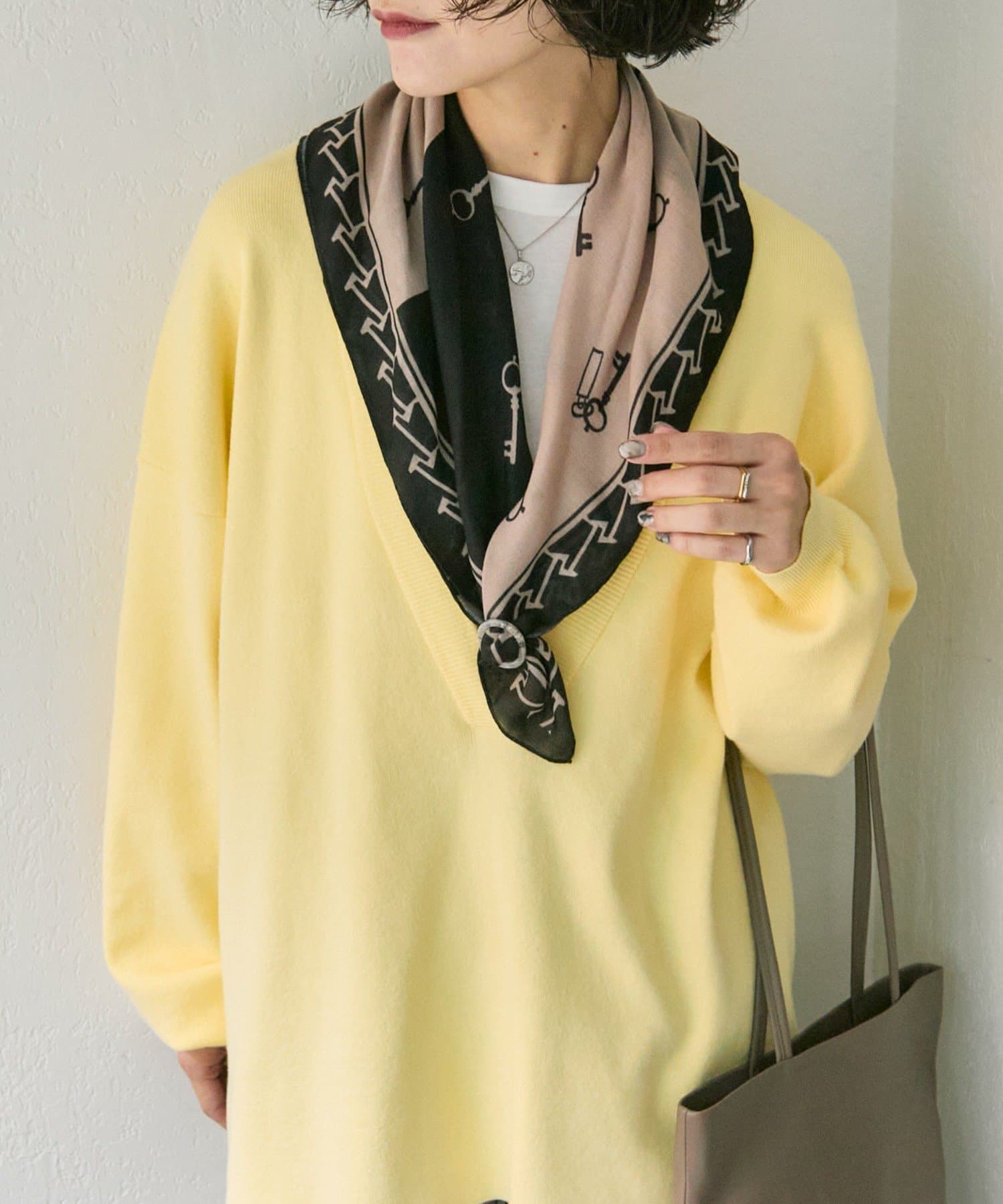 首元に巻けば、シンプルなトップスもトレンド感のあるスタイルに。