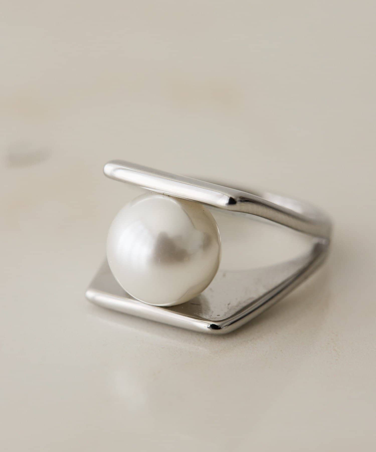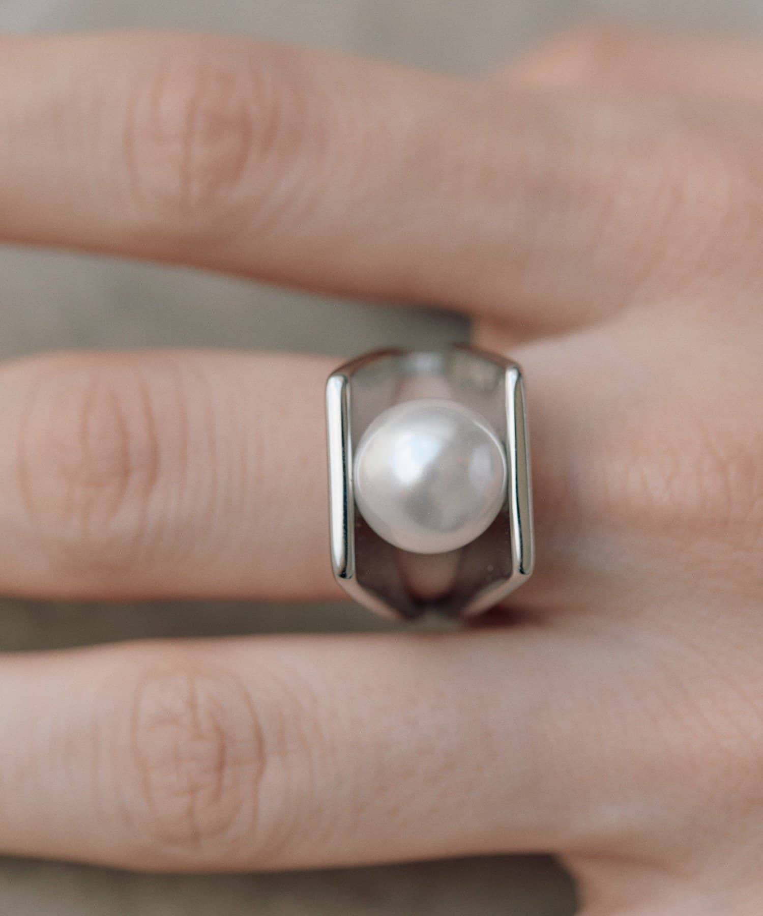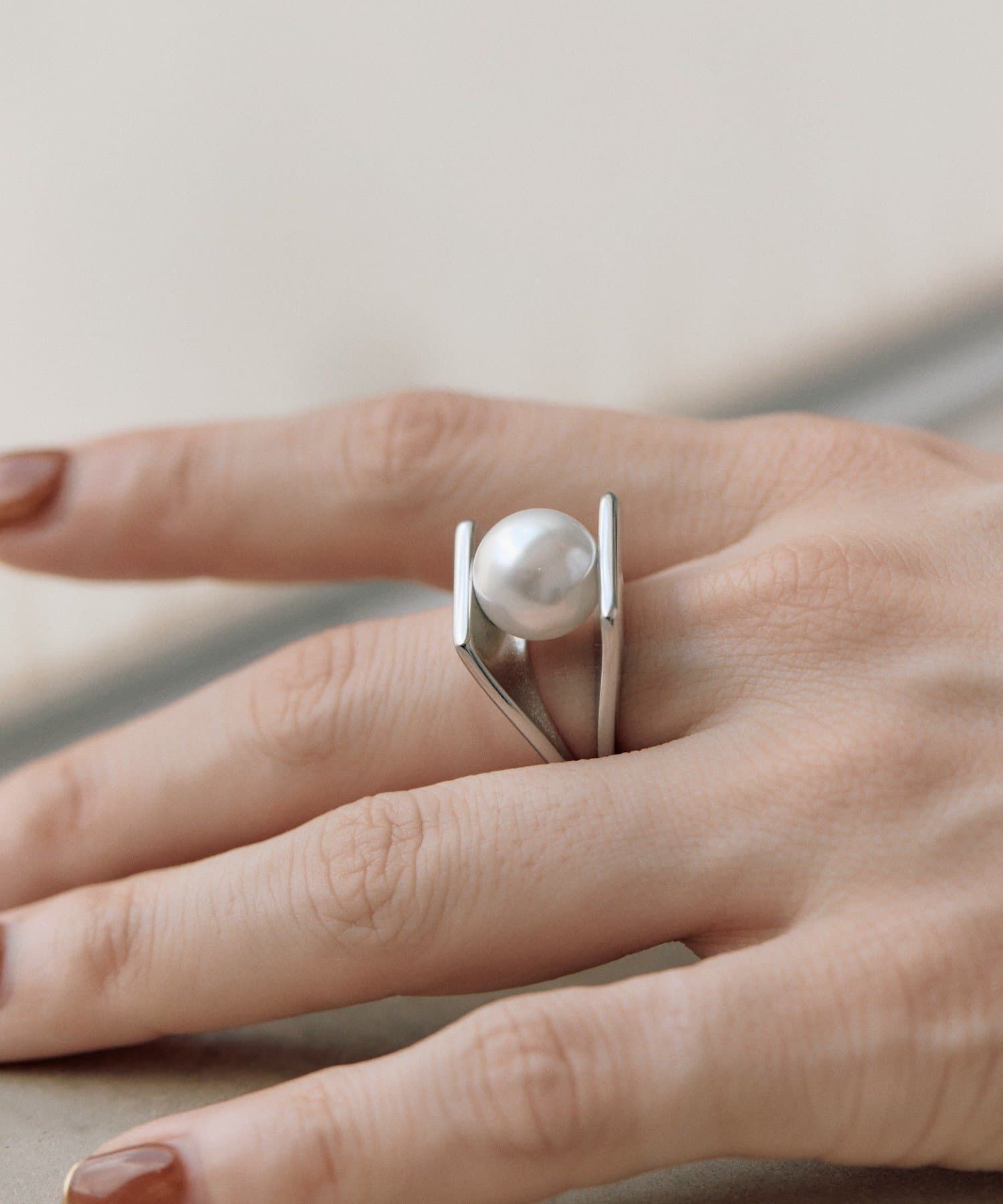 板状のリングに大胆に挟まれた大粒パールが、手元に洗練されたアクセントをプラスします。