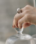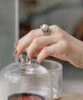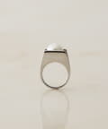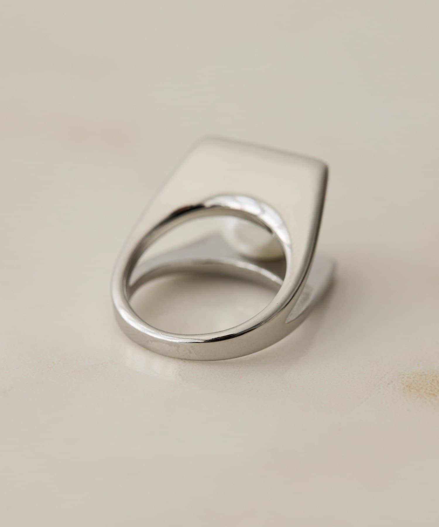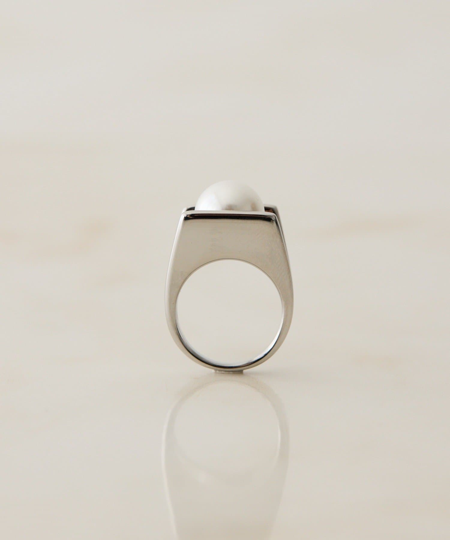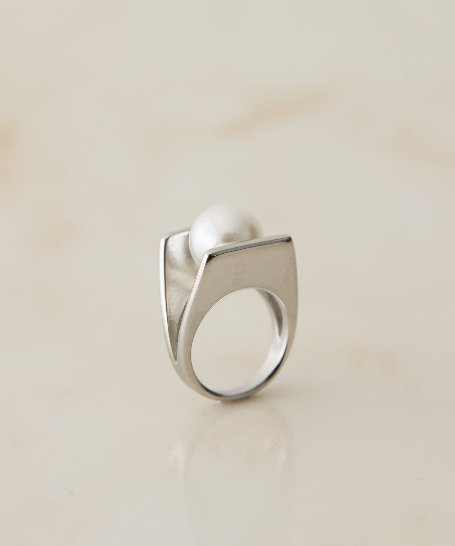 板状のリングに大胆に挟まれた大粒パールが、手元に洗練されたアクセントをプラスします。
