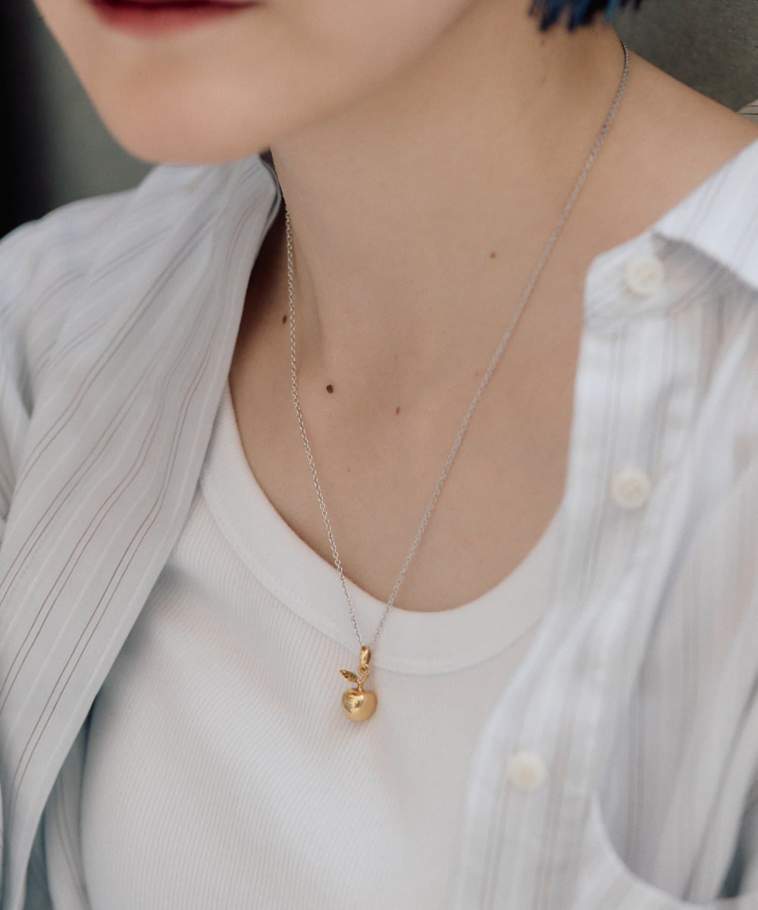 胸元にさりげなく光るリンゴは、いつものスタイルにプラスするだけで、こなれた印象に。
