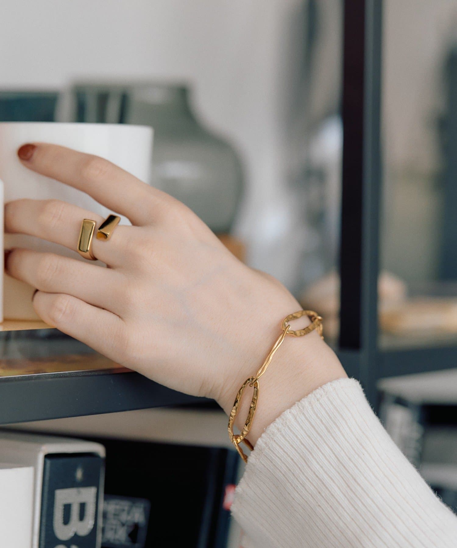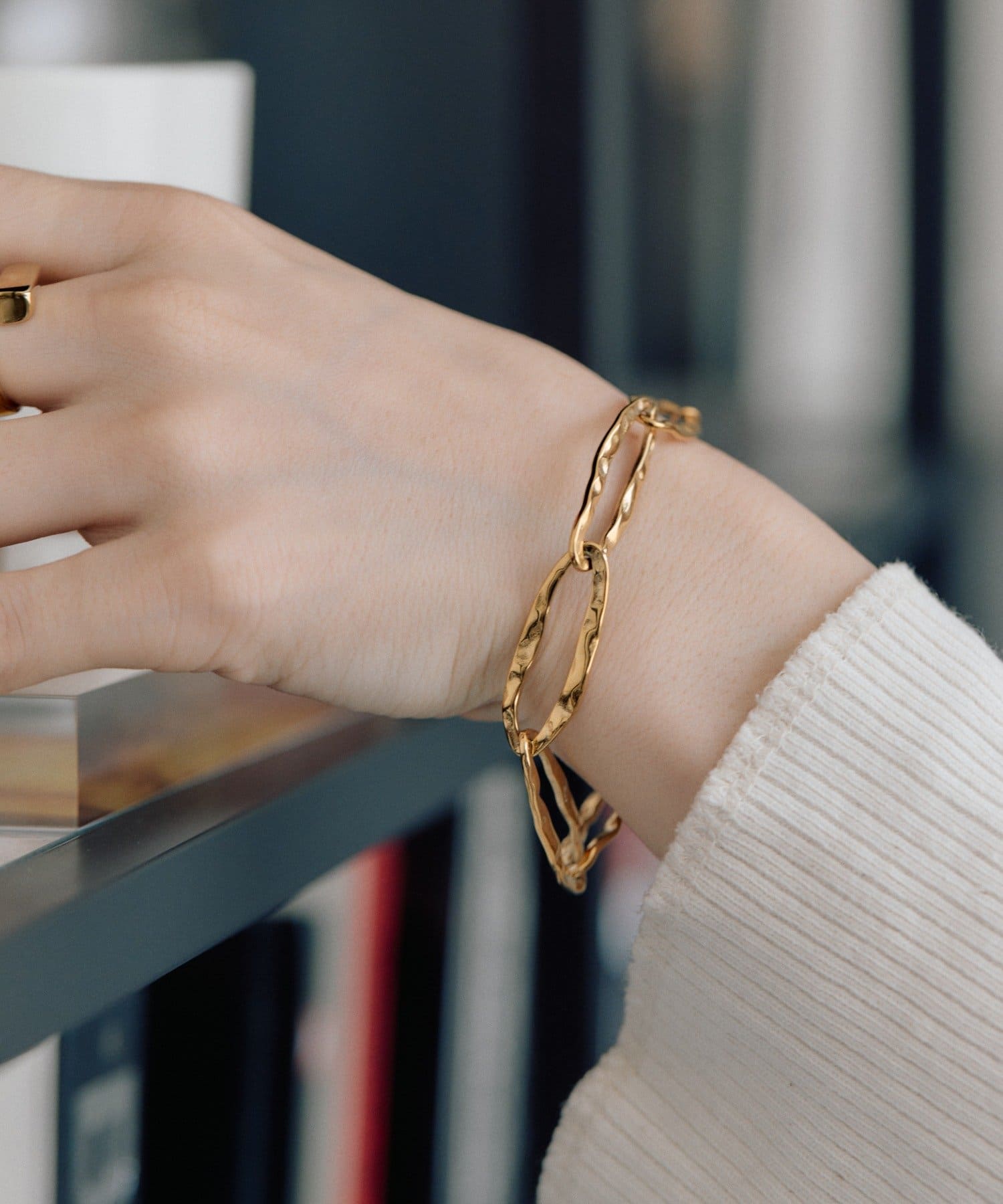 手元にアクセントを添える「テクスチャーBIGチェーンブレスレット」