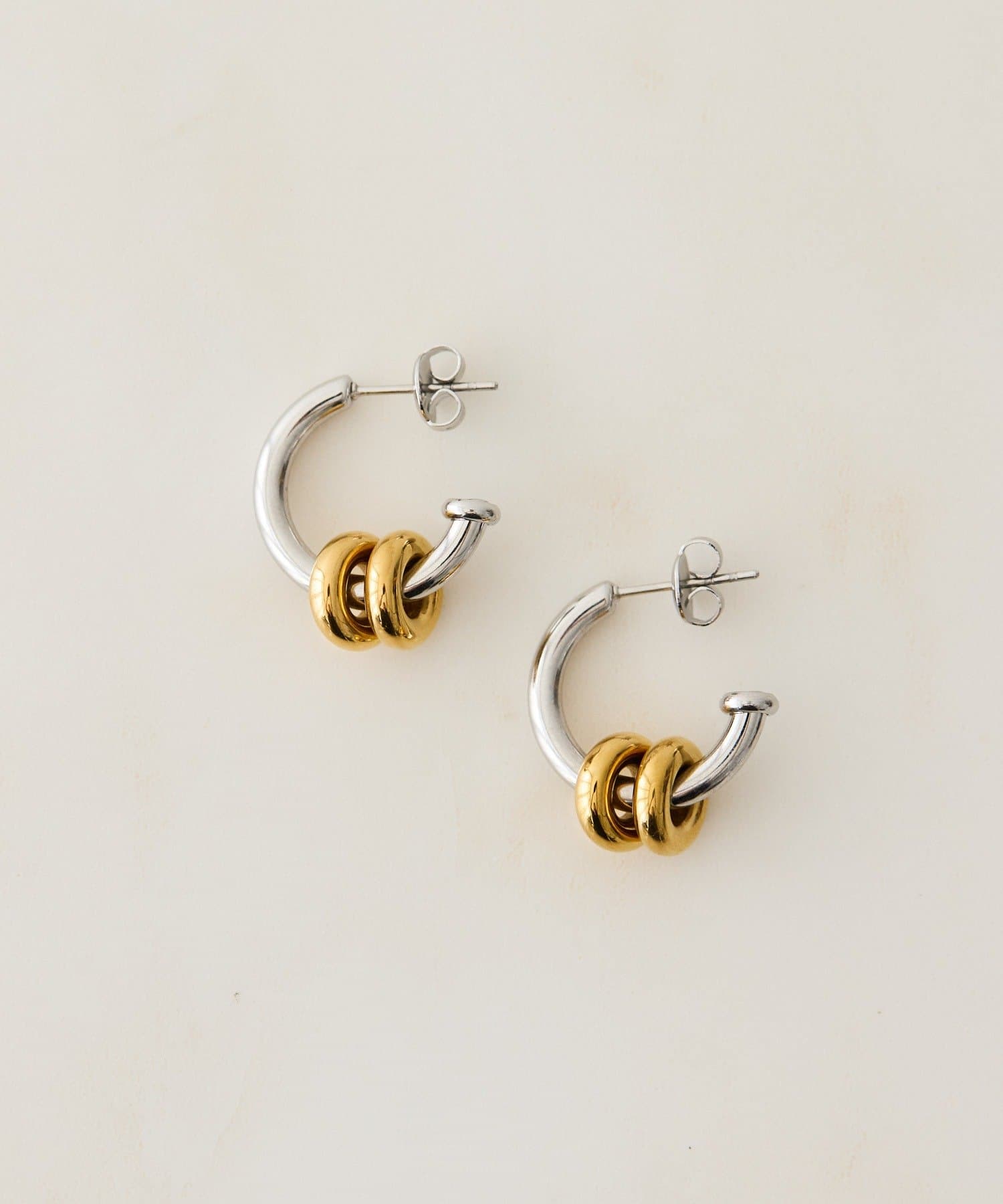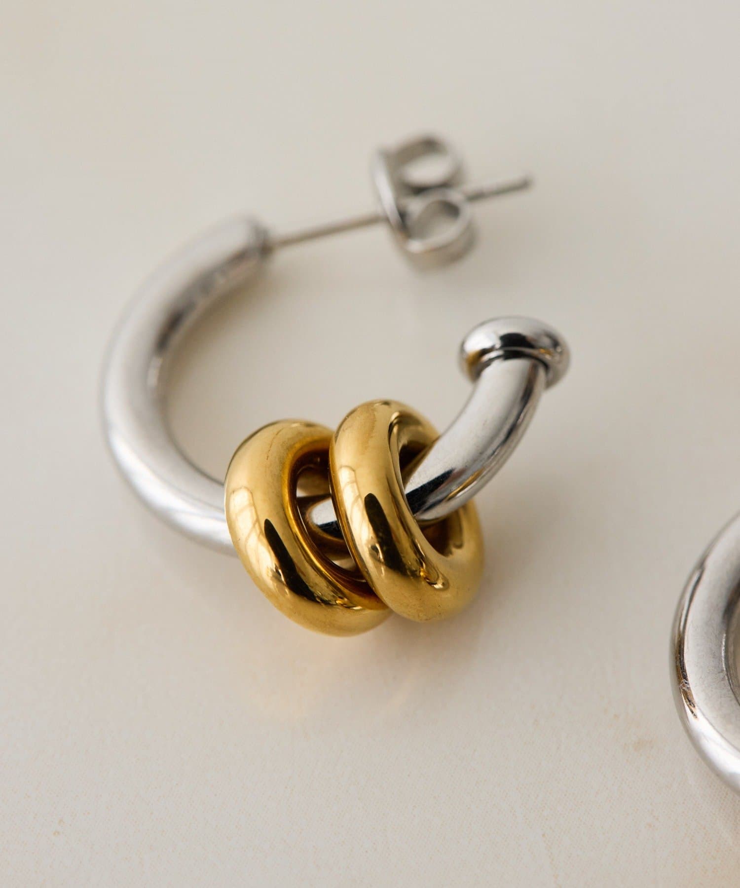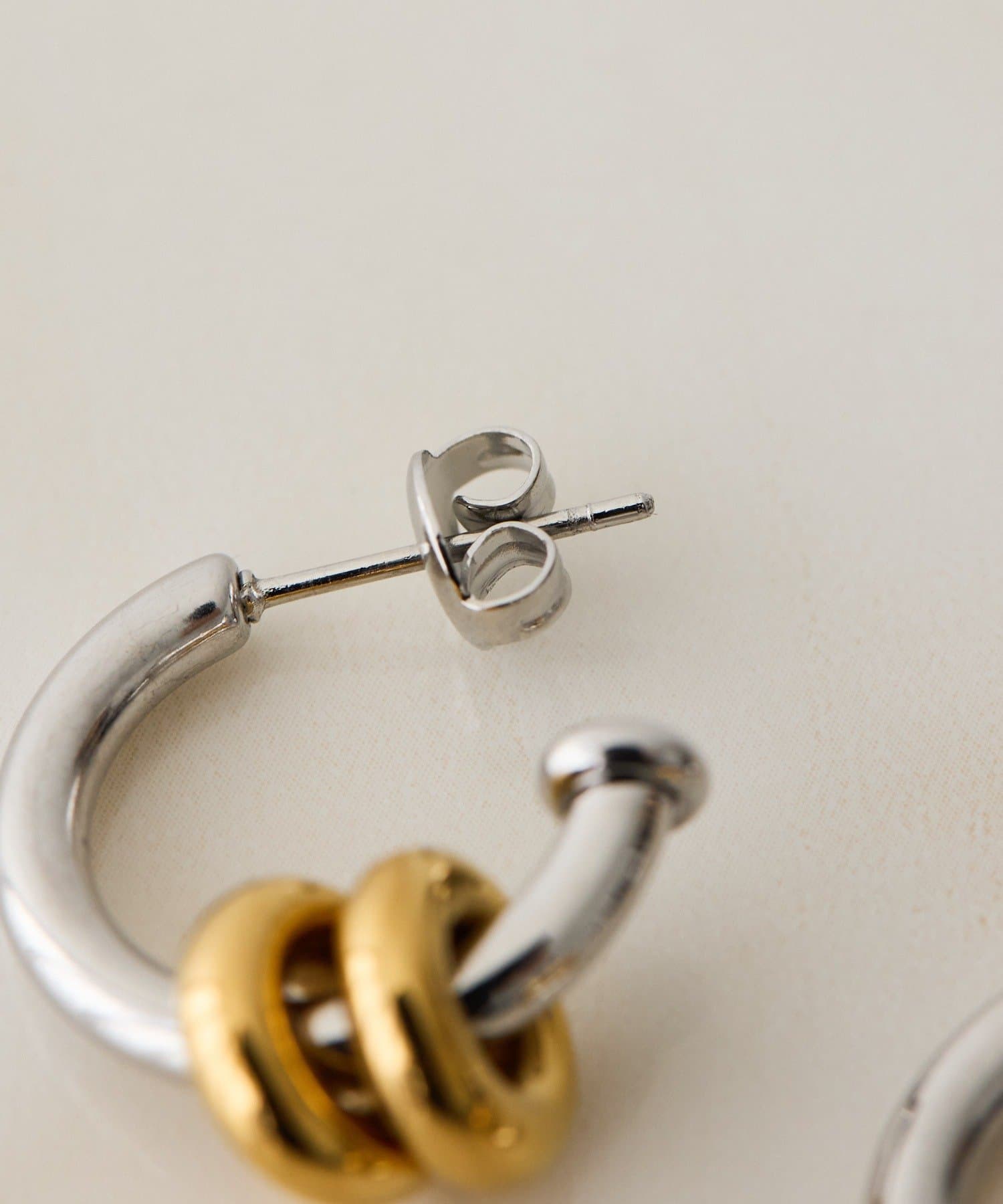 シルバーのフープにゴールドのリングがアクセントになった、スタイリッシュなピアスです。