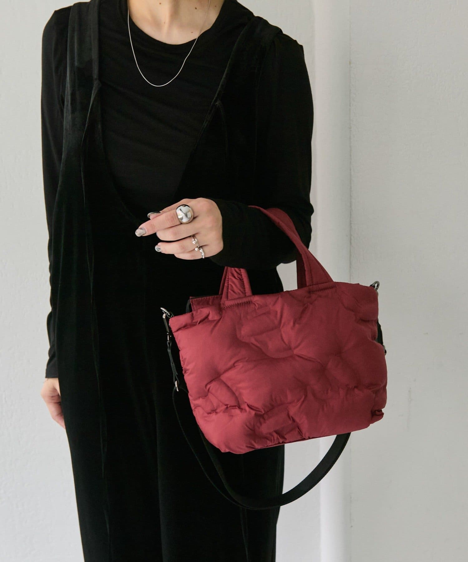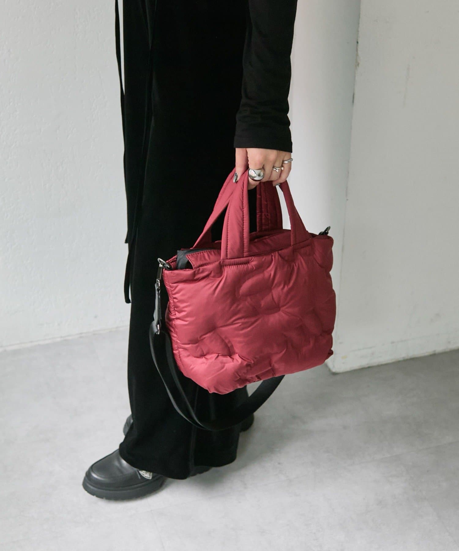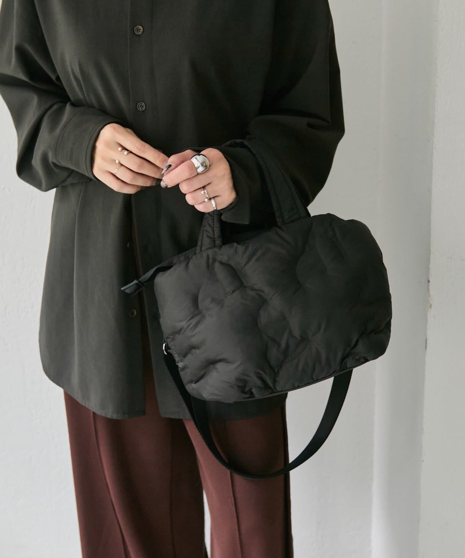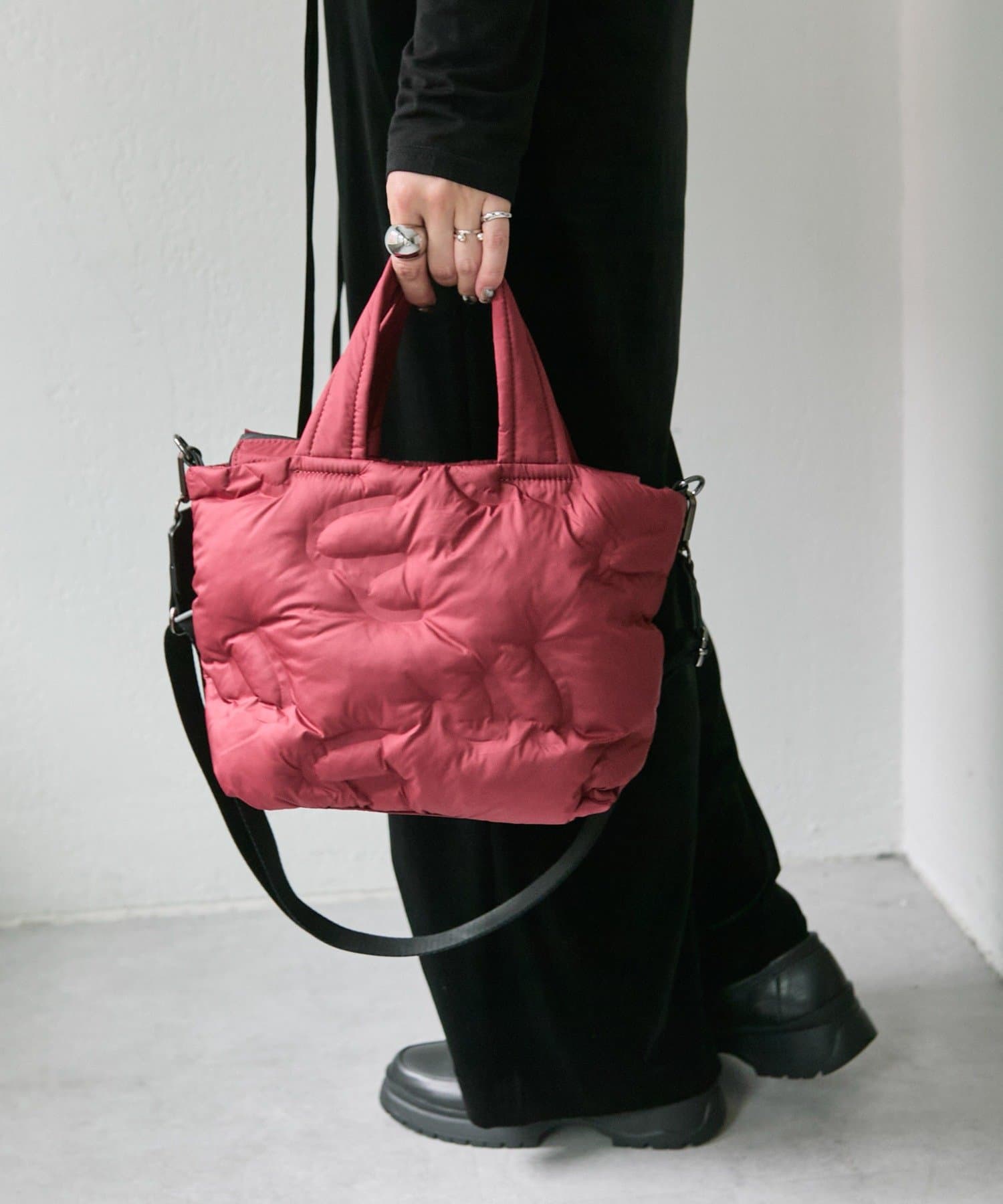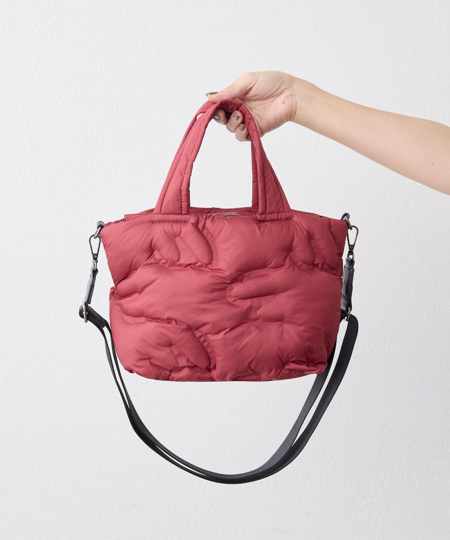 ふっくらとしたキルティングデザインが目を惹くトートバッグ。
