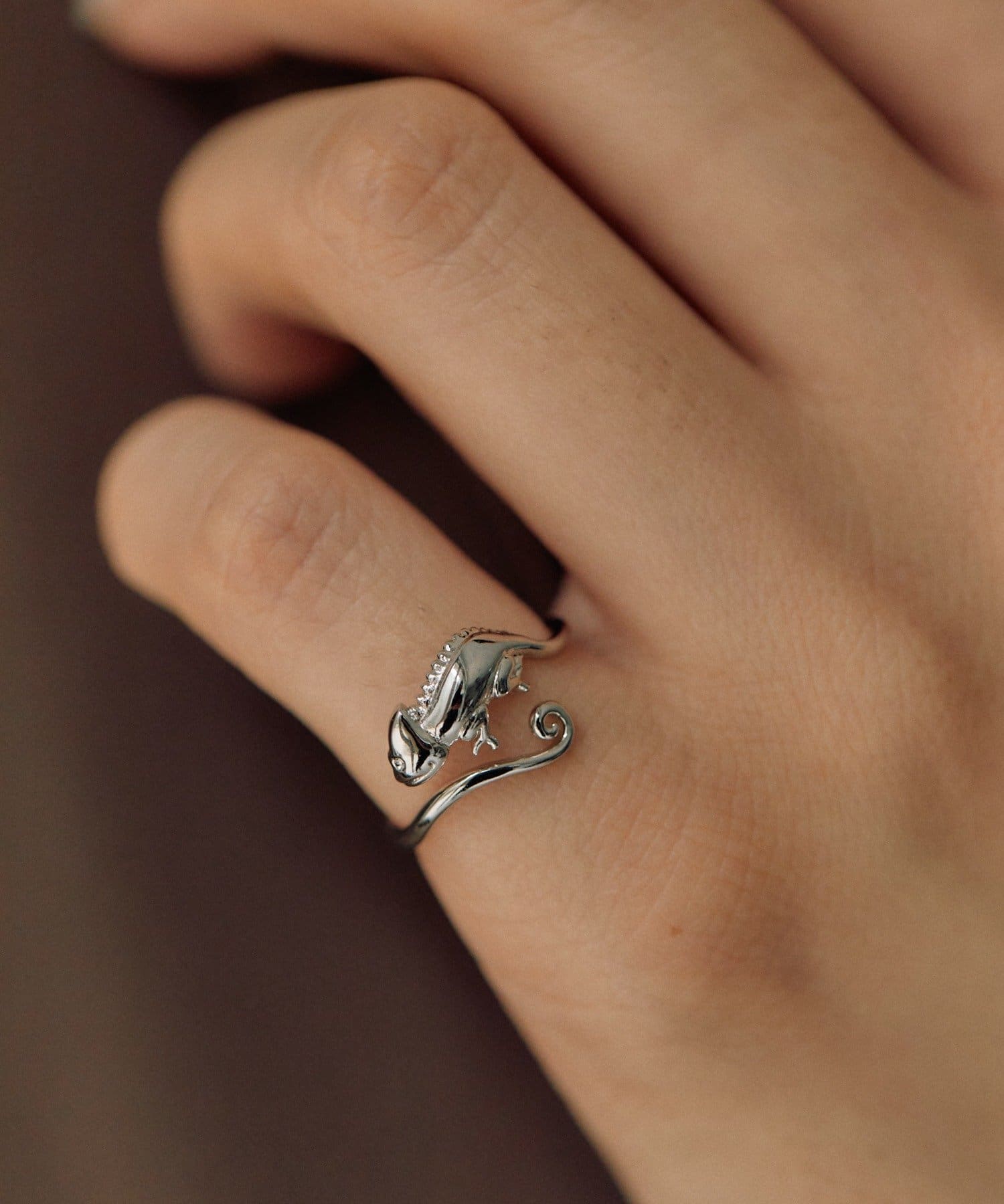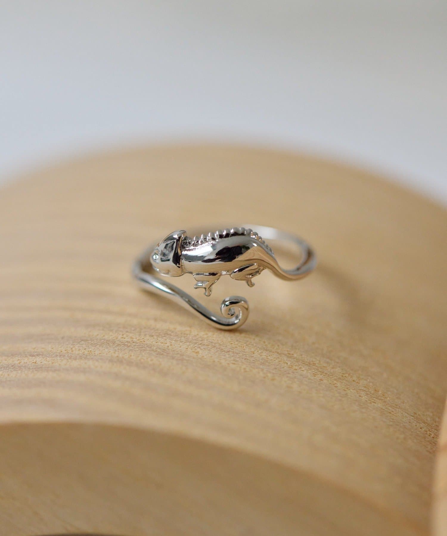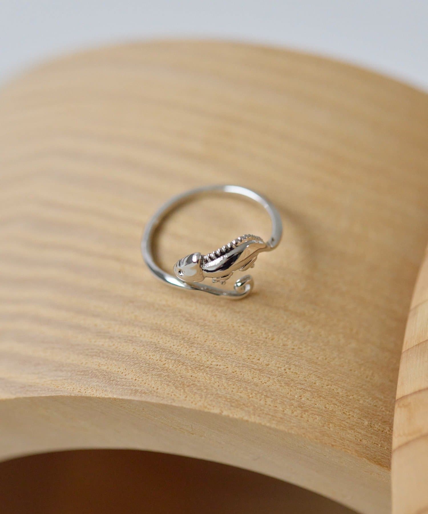 ・指に巻き付くカメレオンモチーフのユニークなデザイン