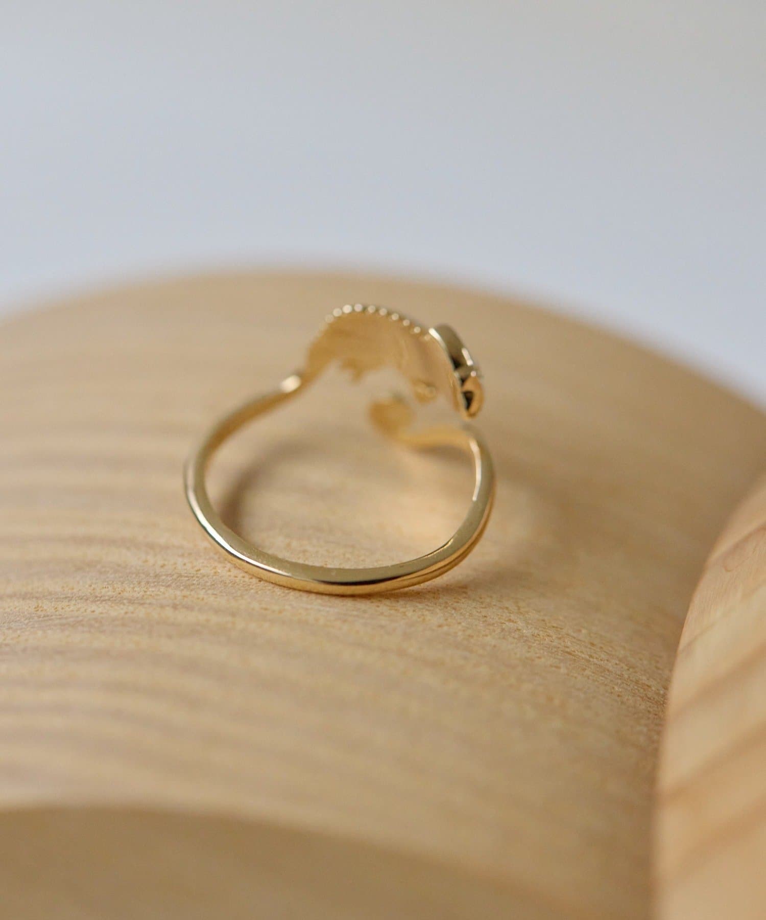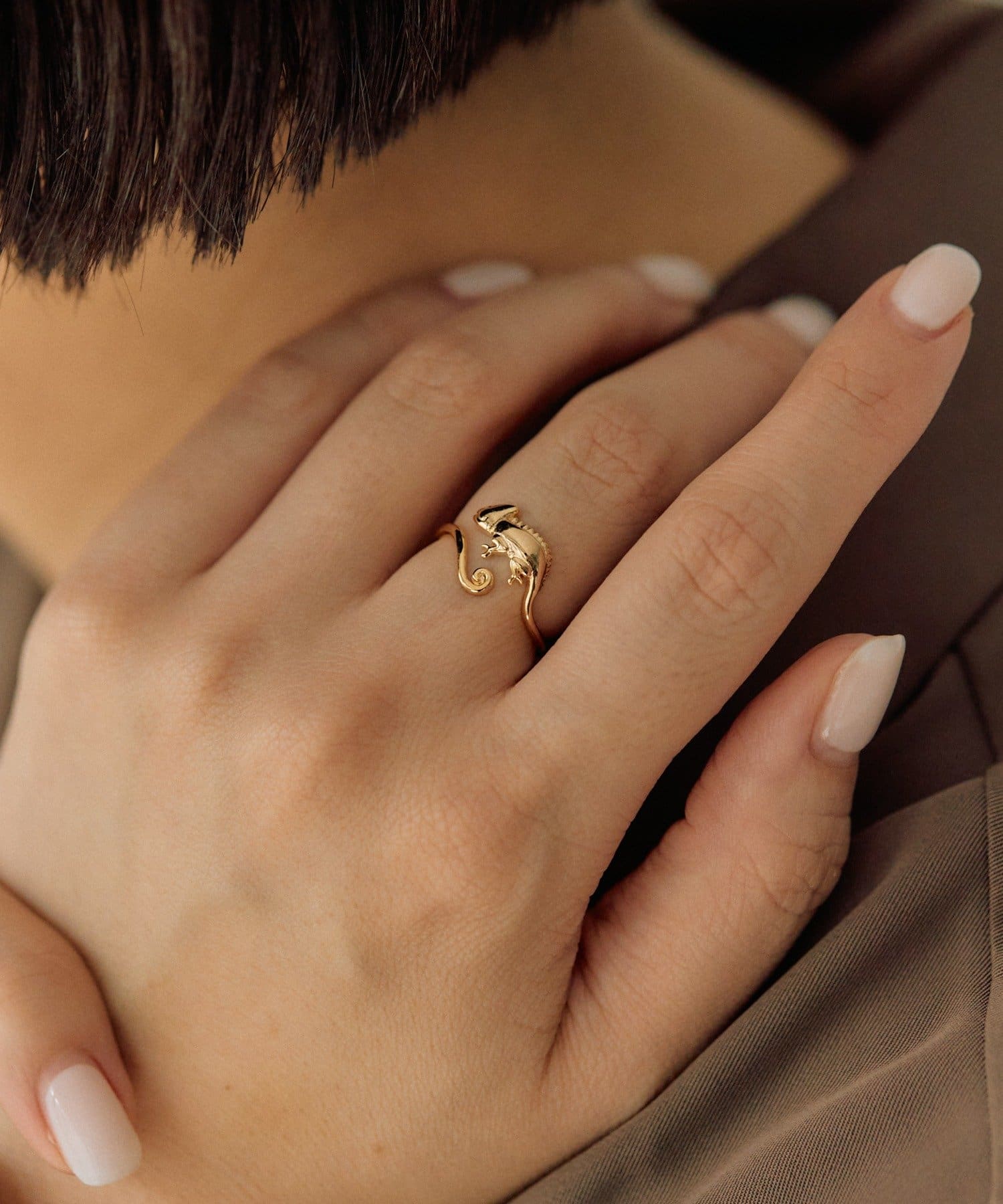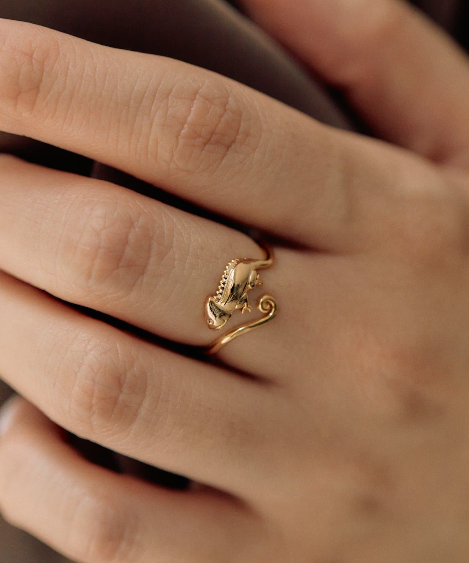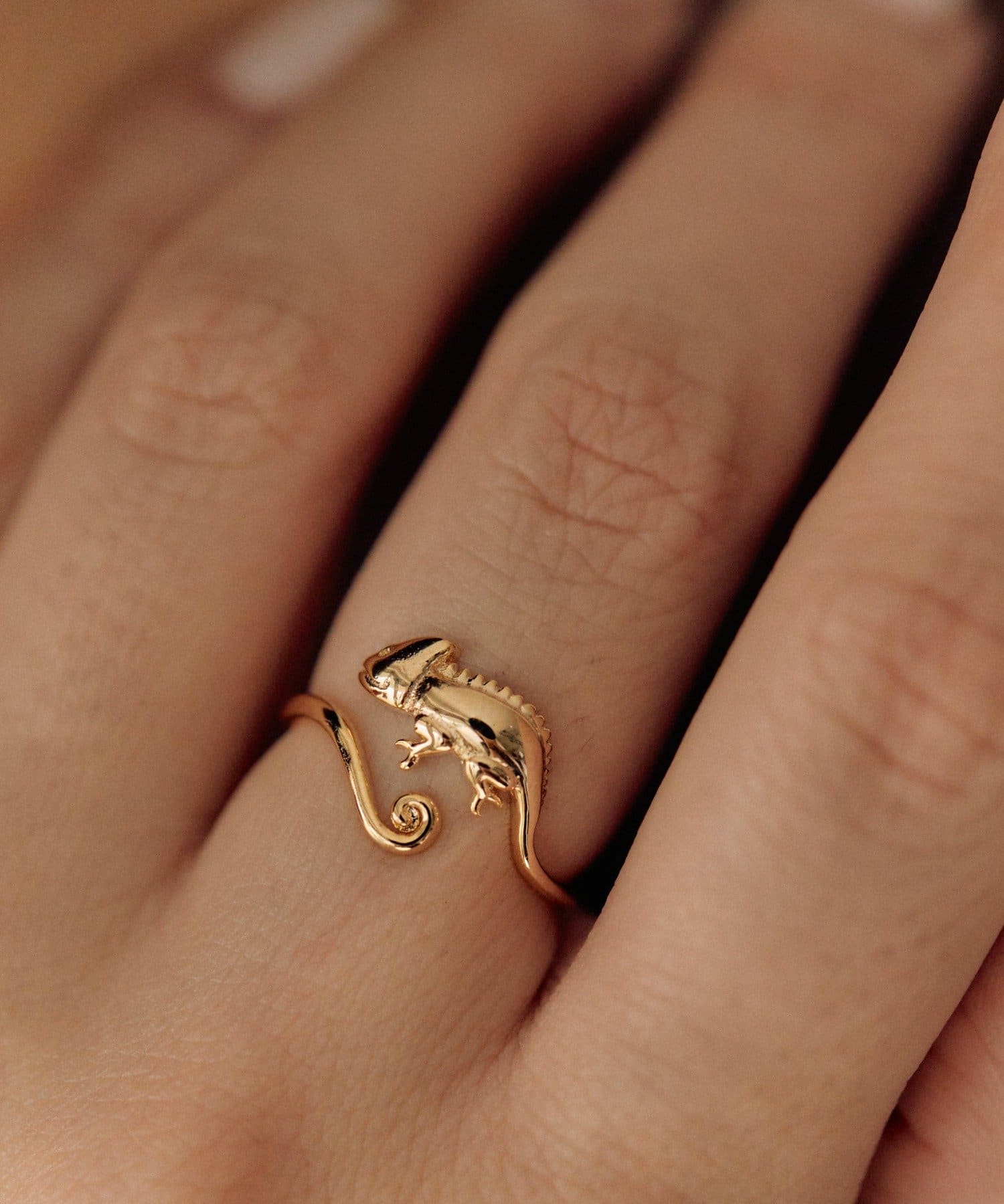 ・指に巻き付くカメレオンモチーフのユニークなデザイン