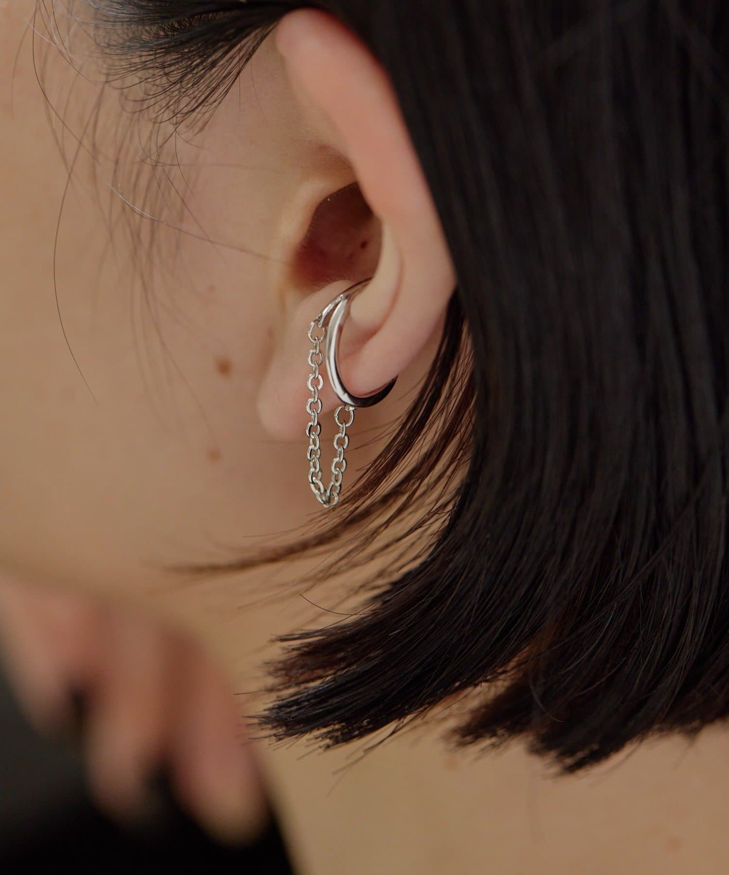 ・メタルのフープとチェーンの2連イヤカフ
