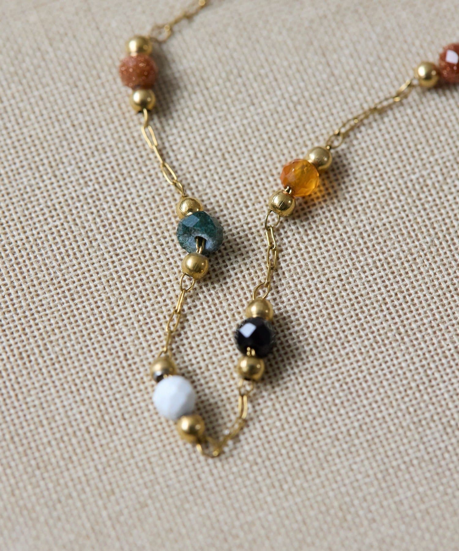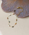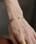 5種類の極小天然石を贅沢に連ねたチェーンが、手首を彩ります。