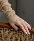 ゴールドのバングルやブレスレットとの重ね付けで、さらに華やかな印象に。