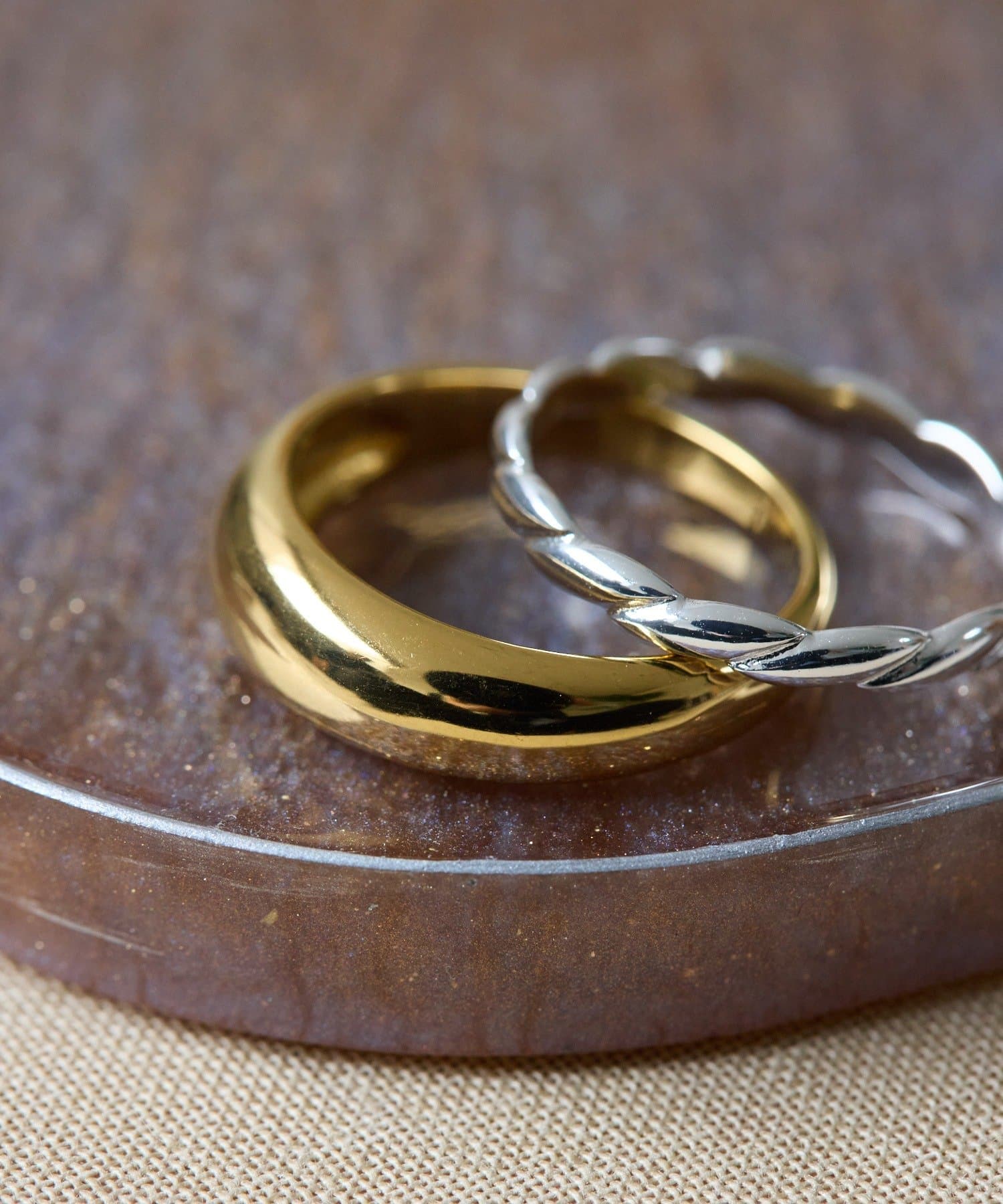 ぽってりとした厚みのあるリングと、繊細な縞目模様が施された細身のリング。