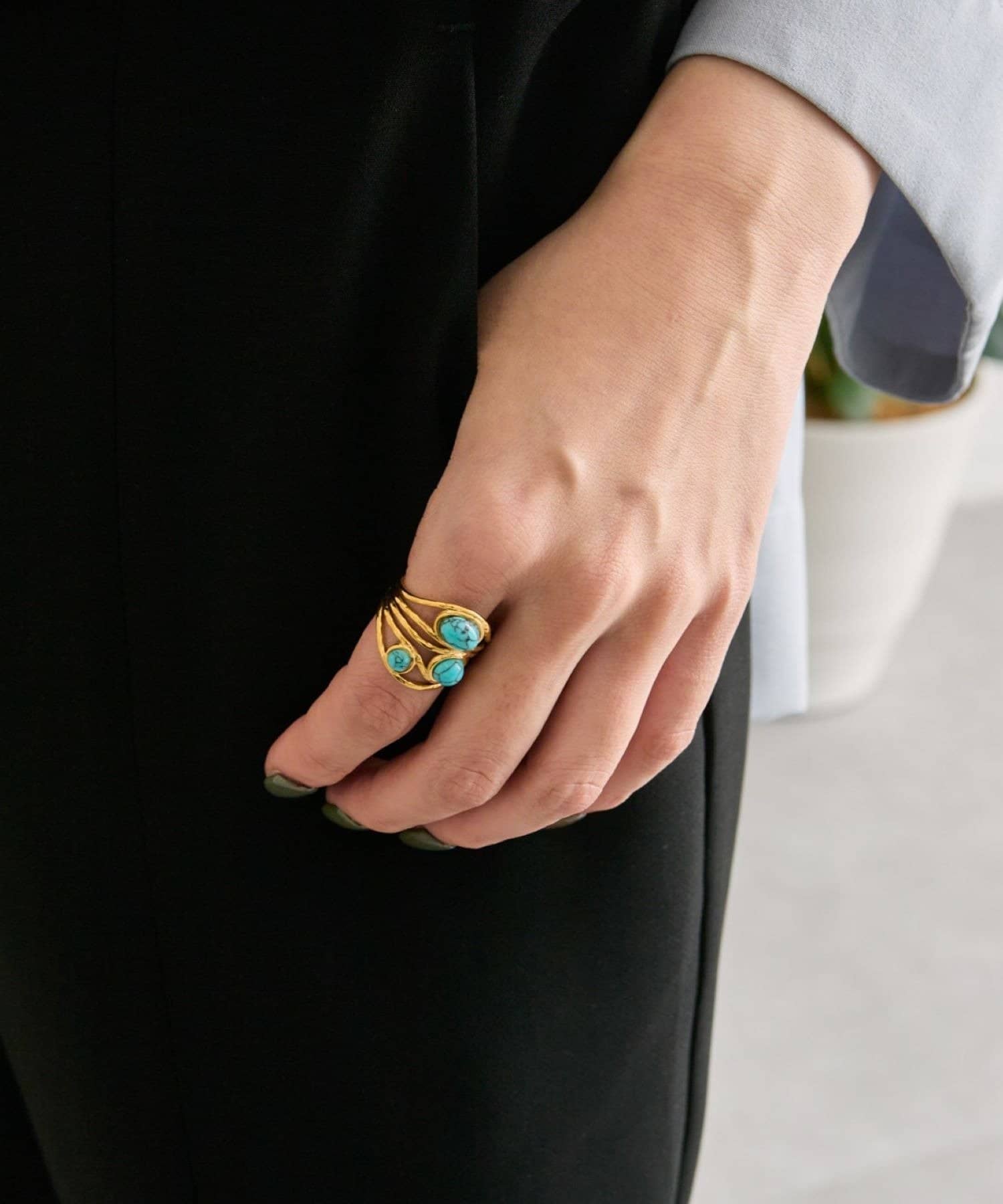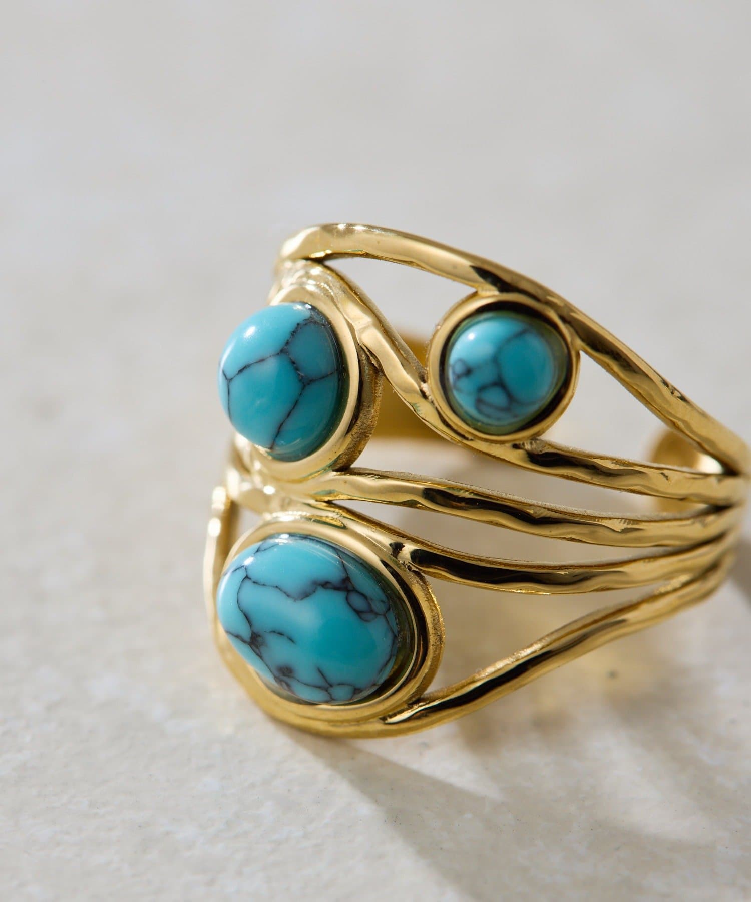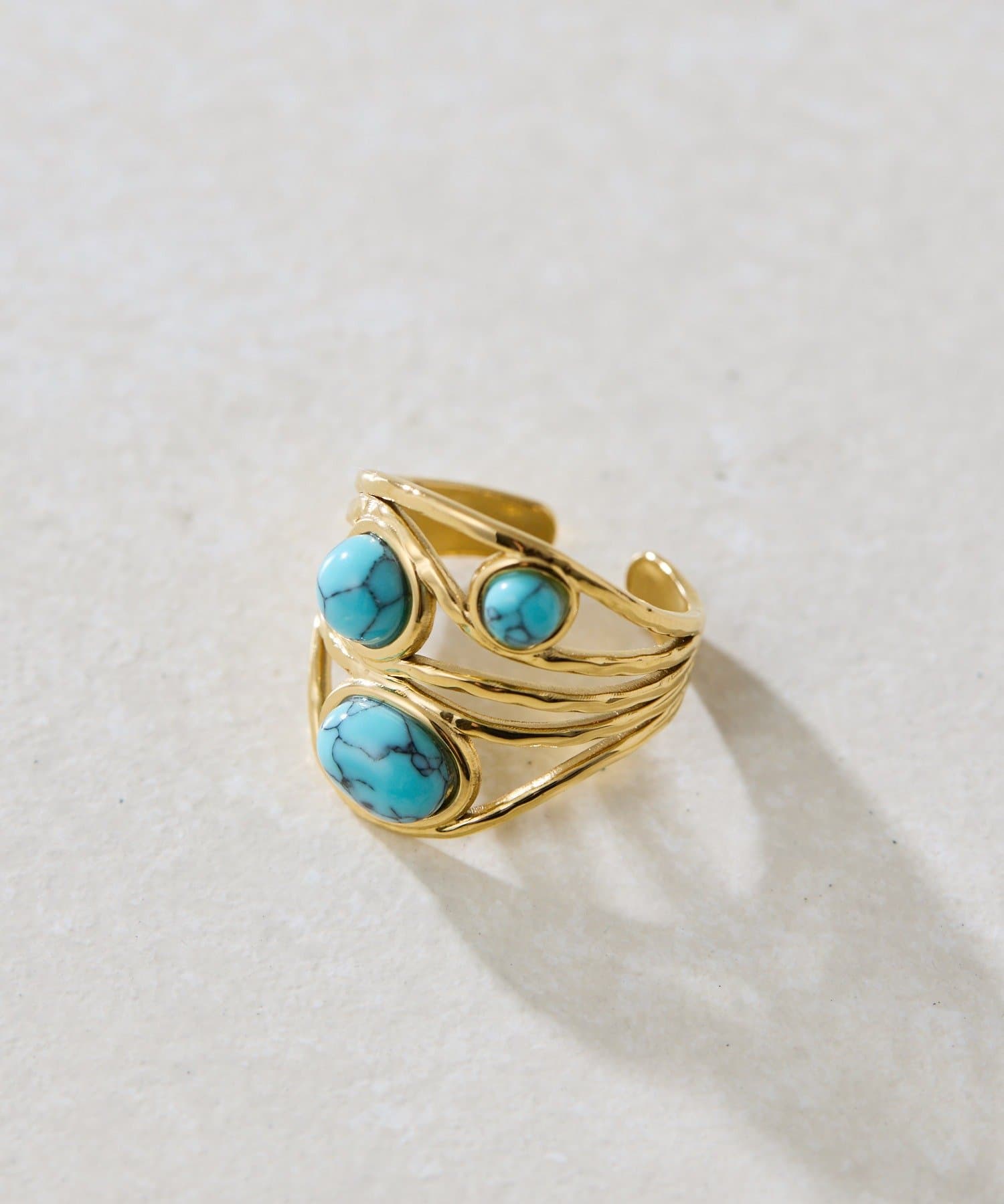 3つのカボションが並んだ、印象的なボリュームリング。
