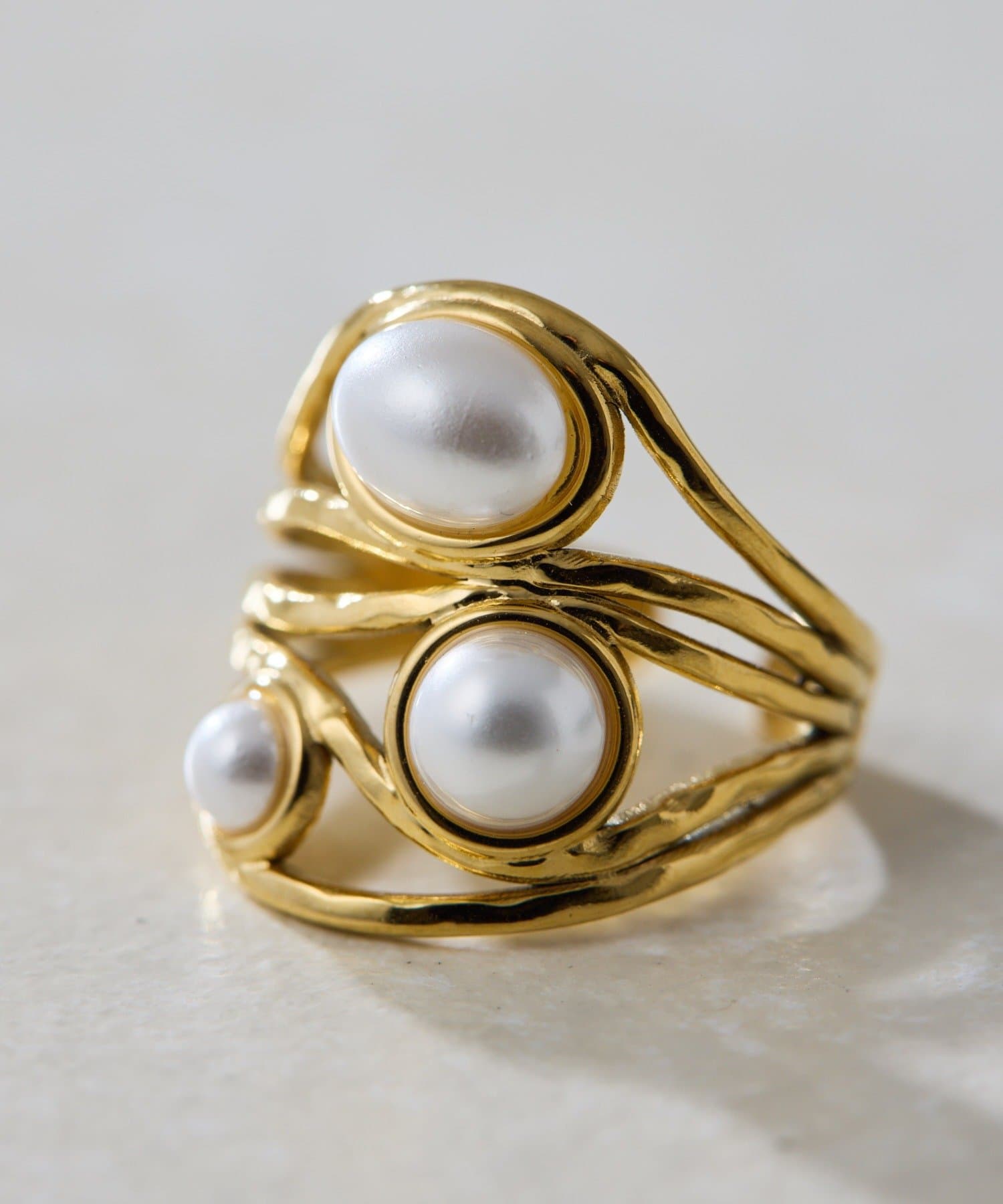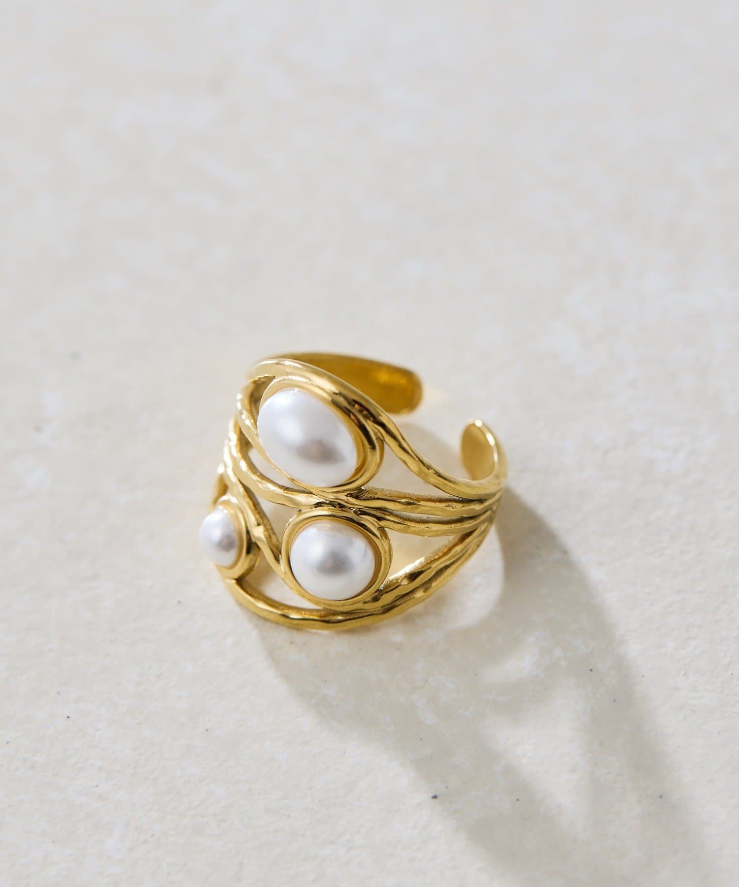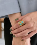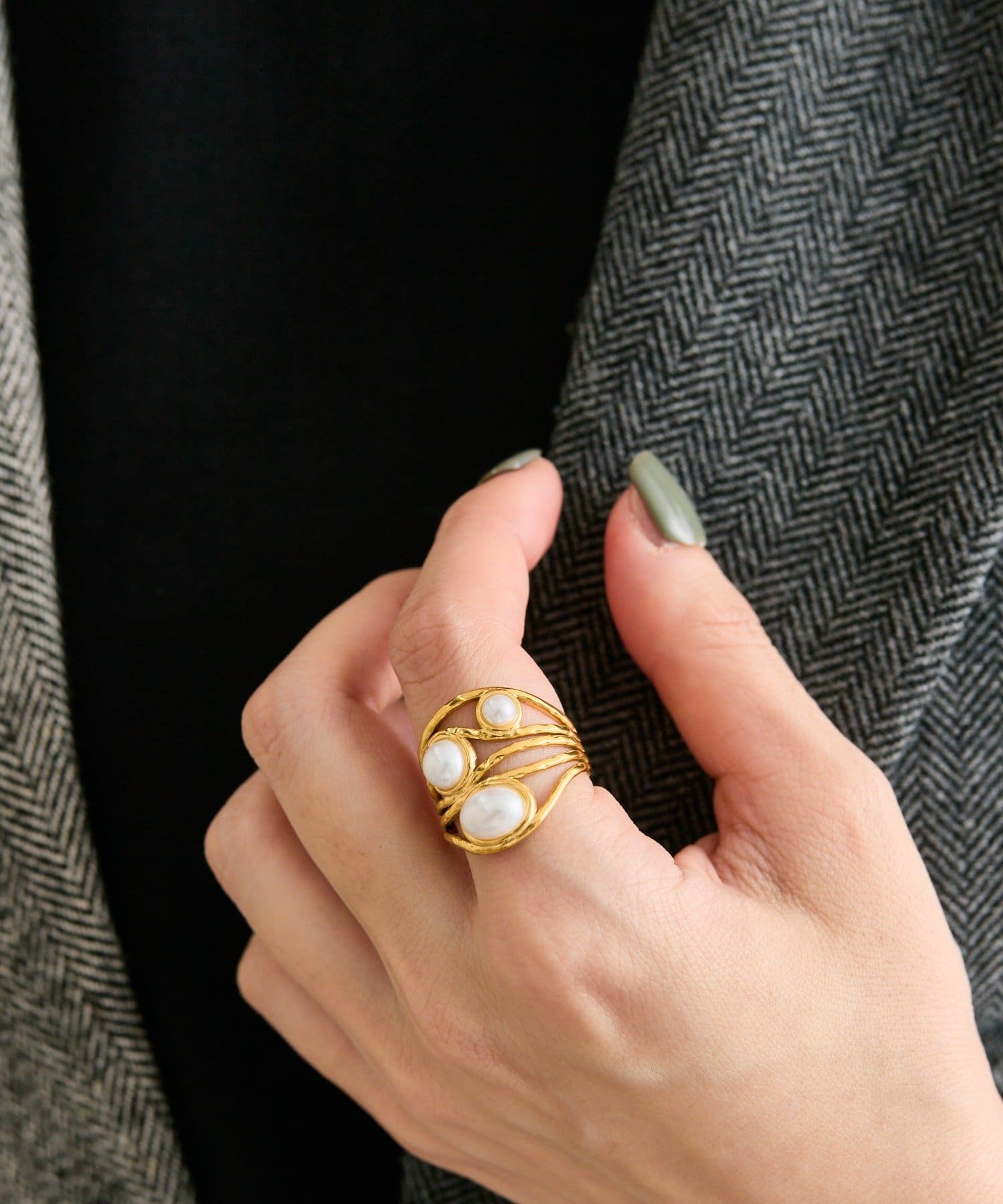 3つのカボションが並んだ、印象的なボリュームリング。