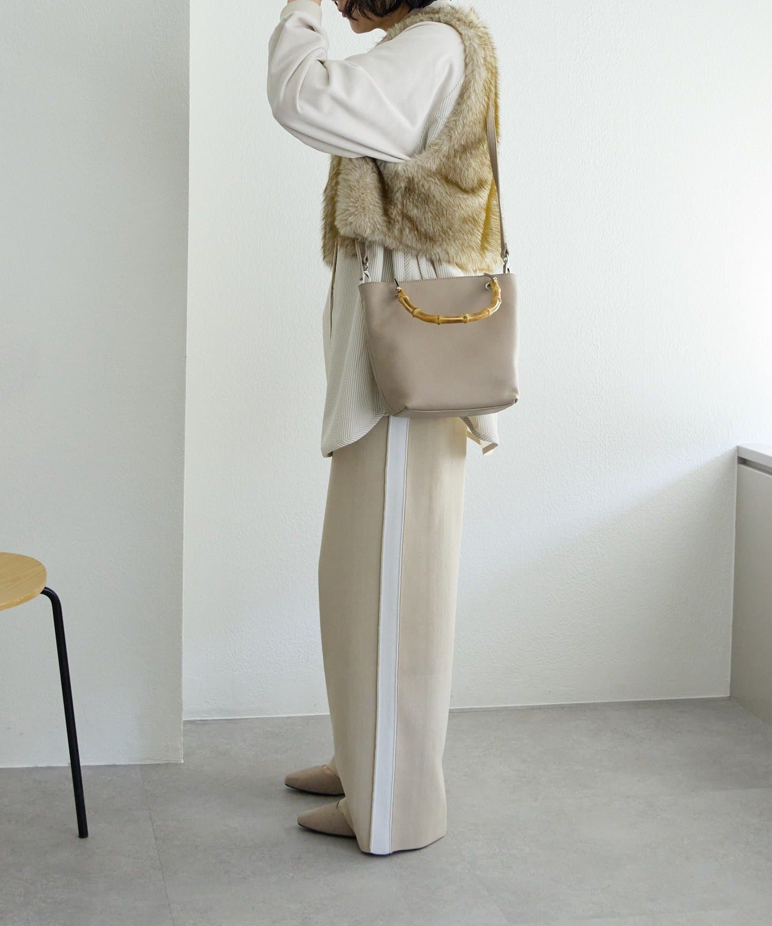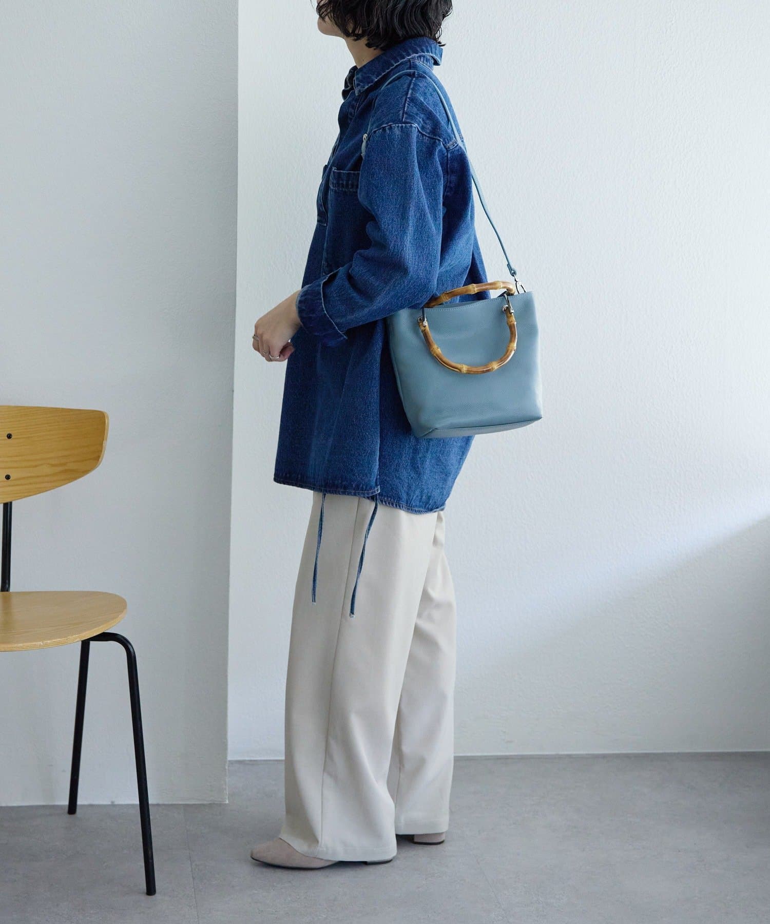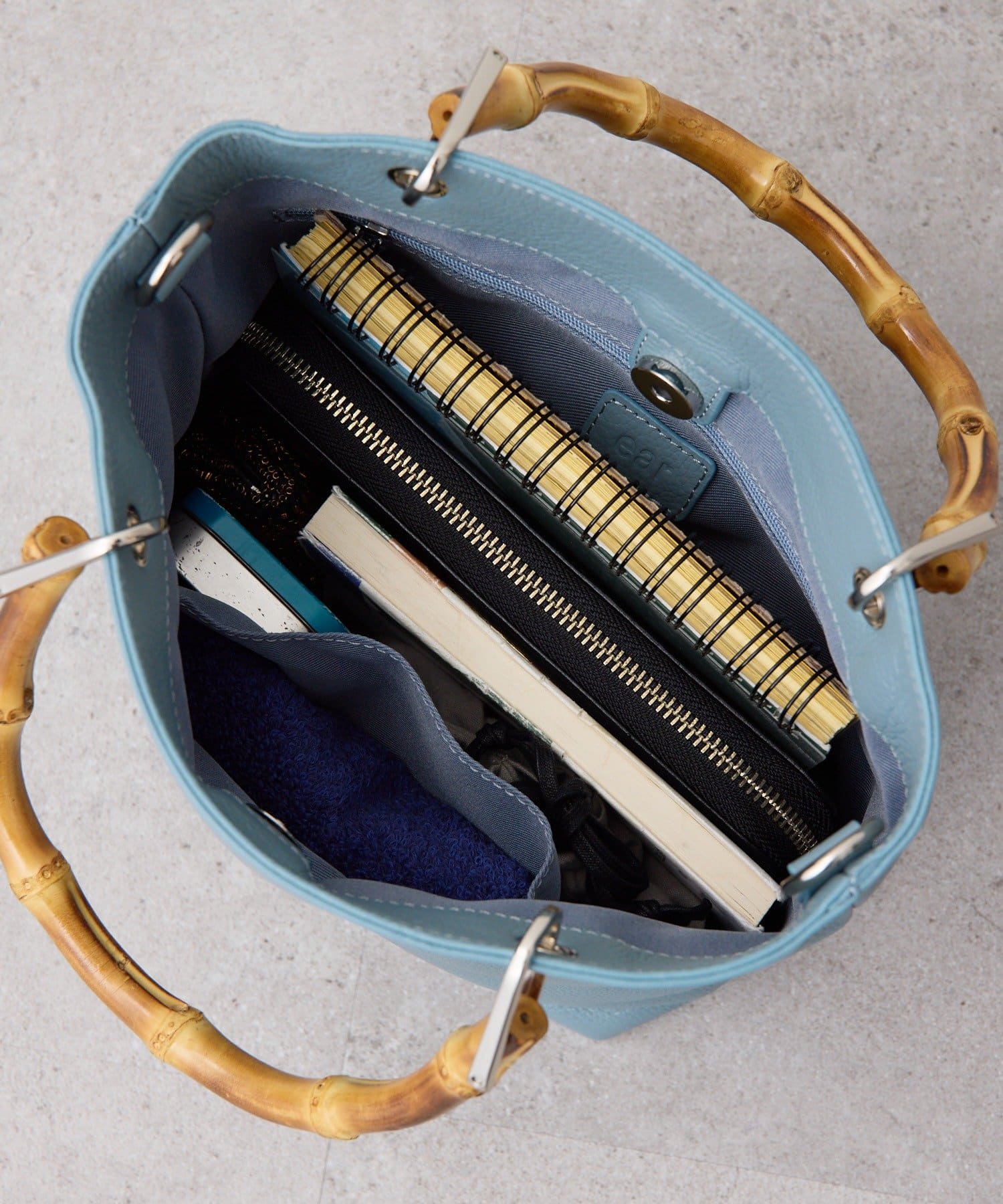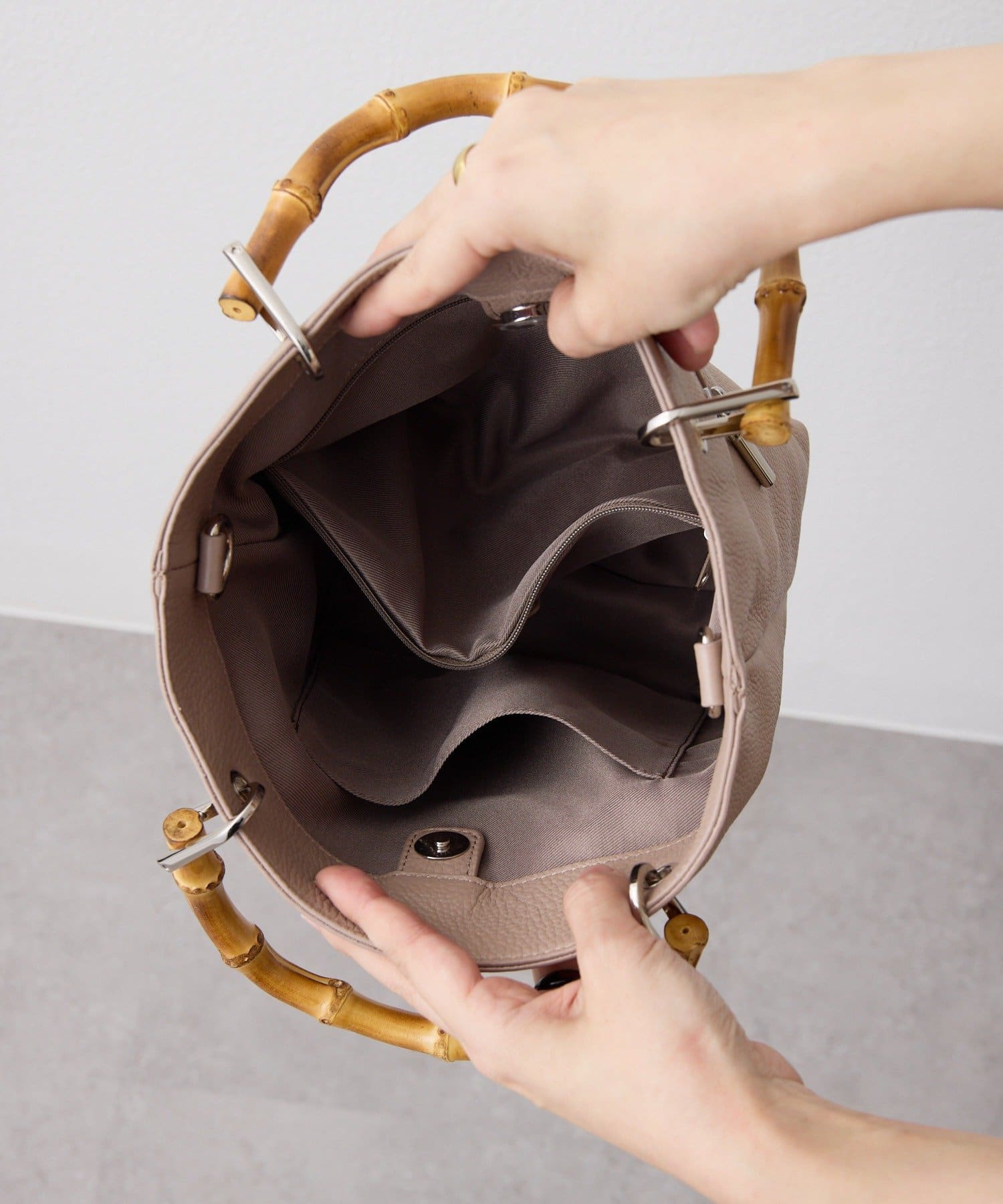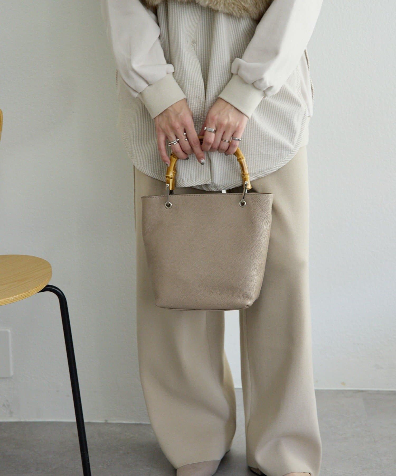 シンプルなトート型だからこそ、素材の良さとバンブーハンドルが映え