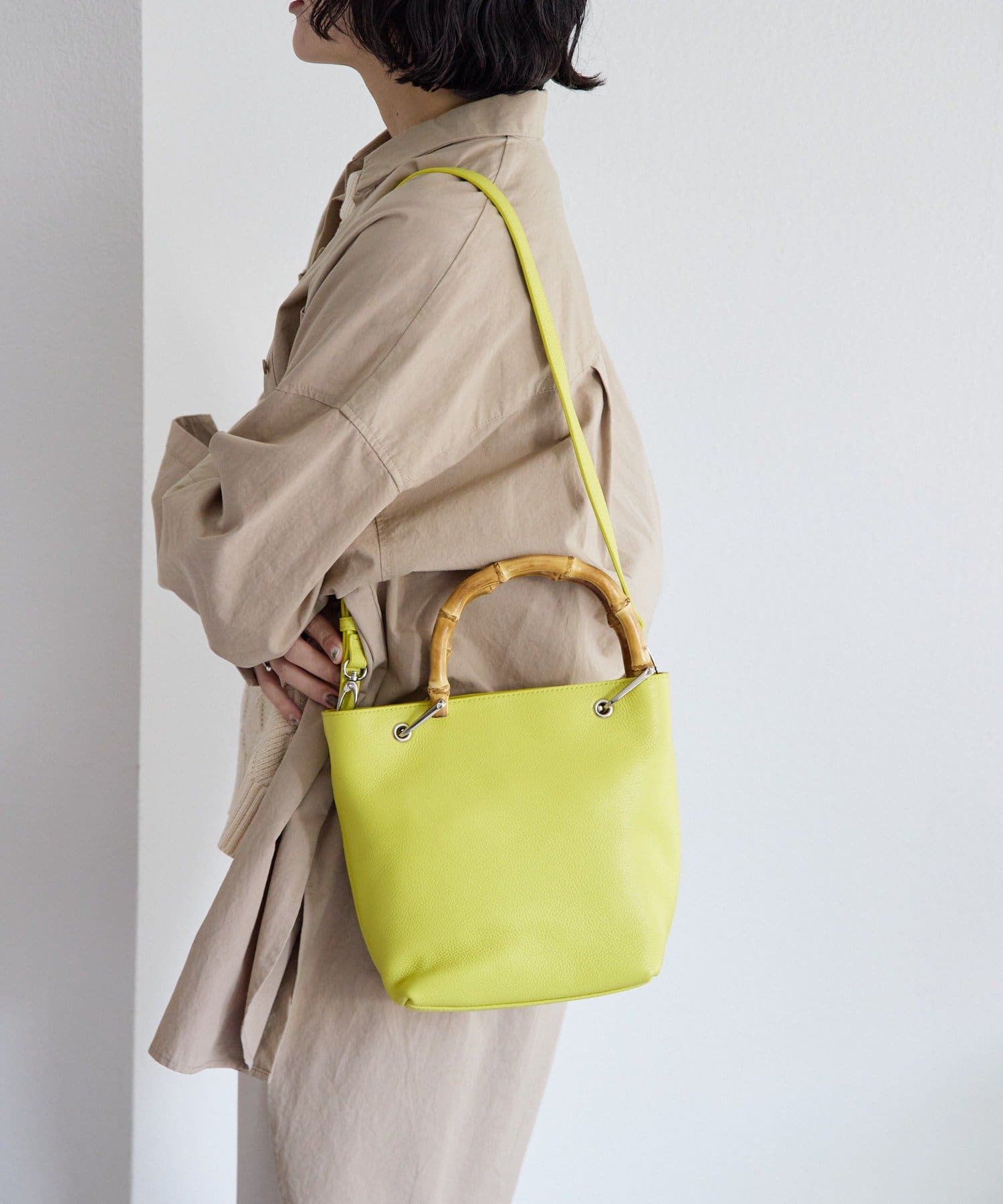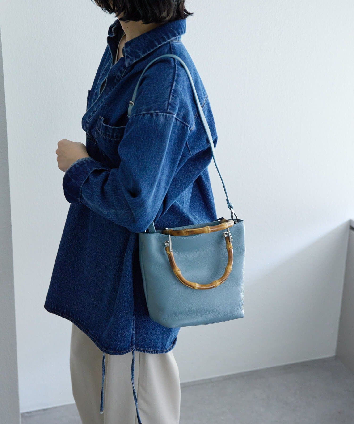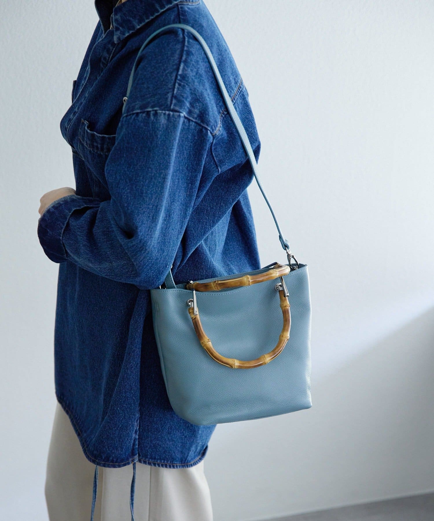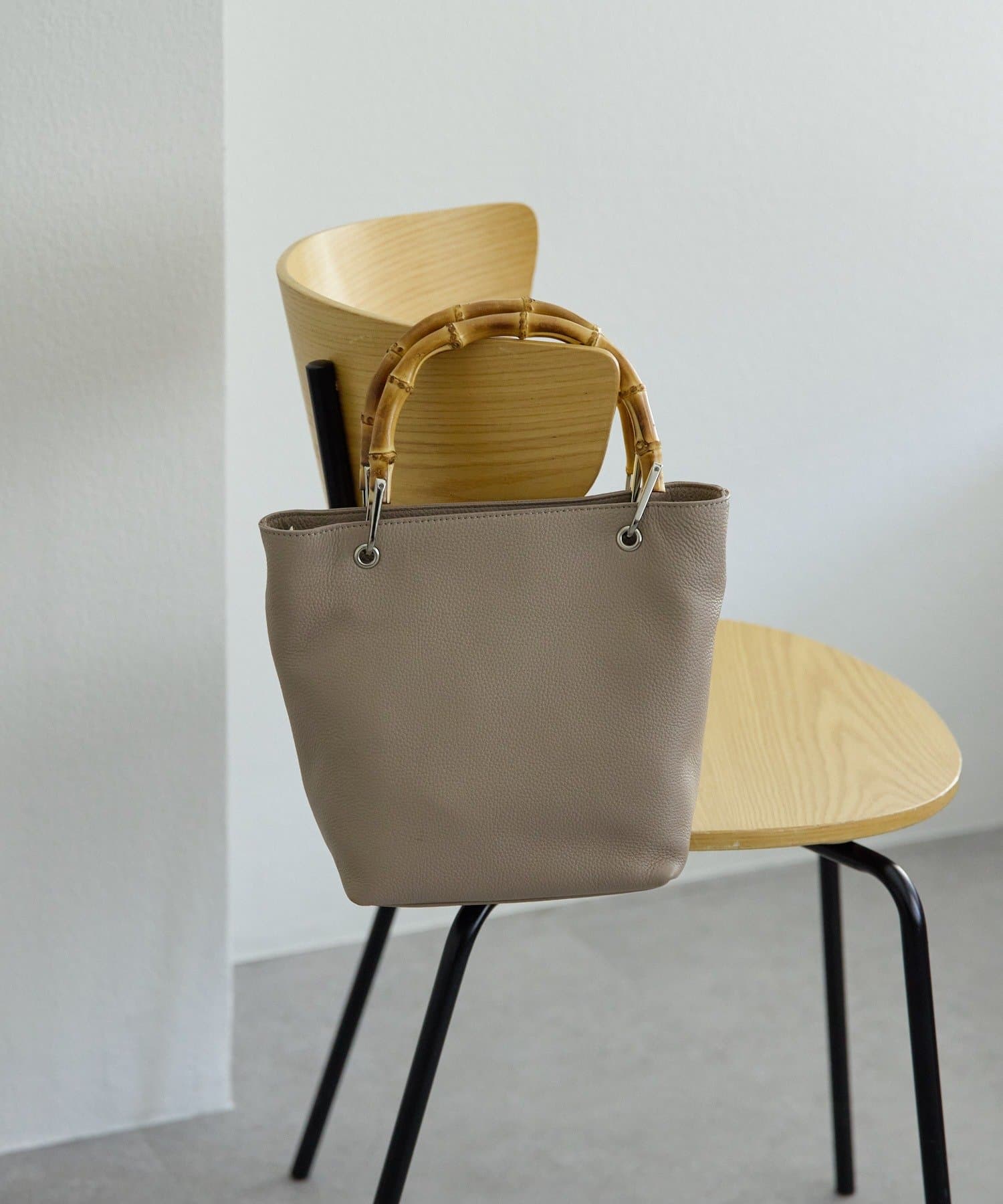 バンブーハンドルが印象的な大人の上質レザーバッグ。
