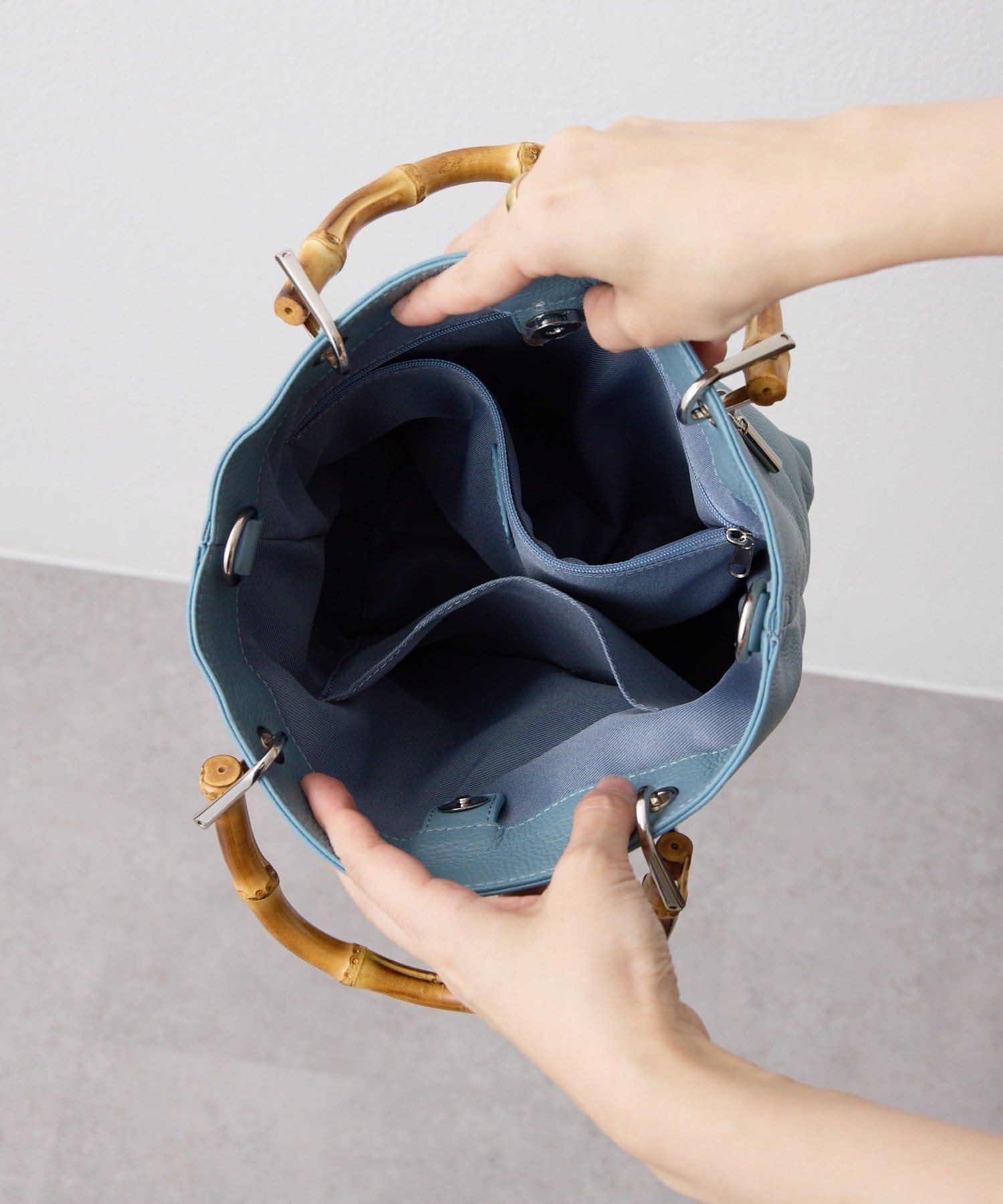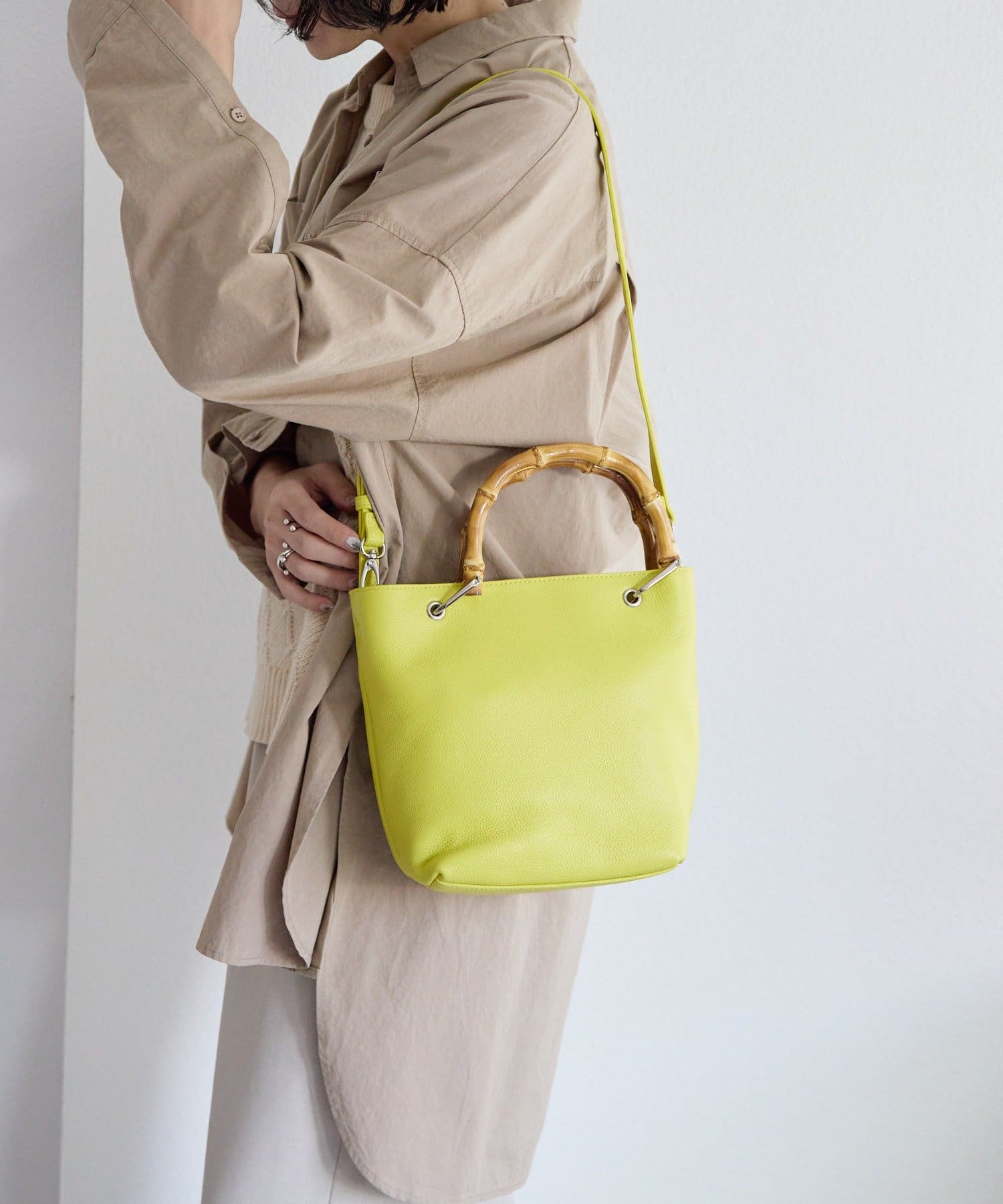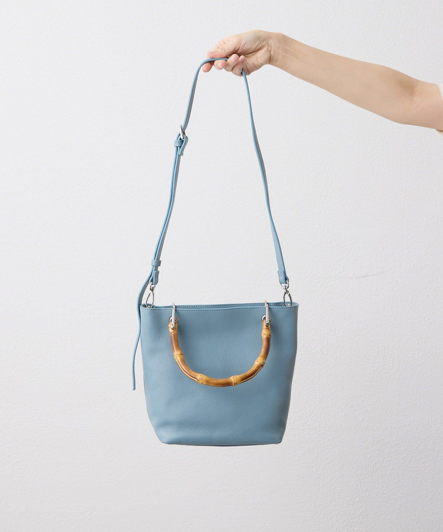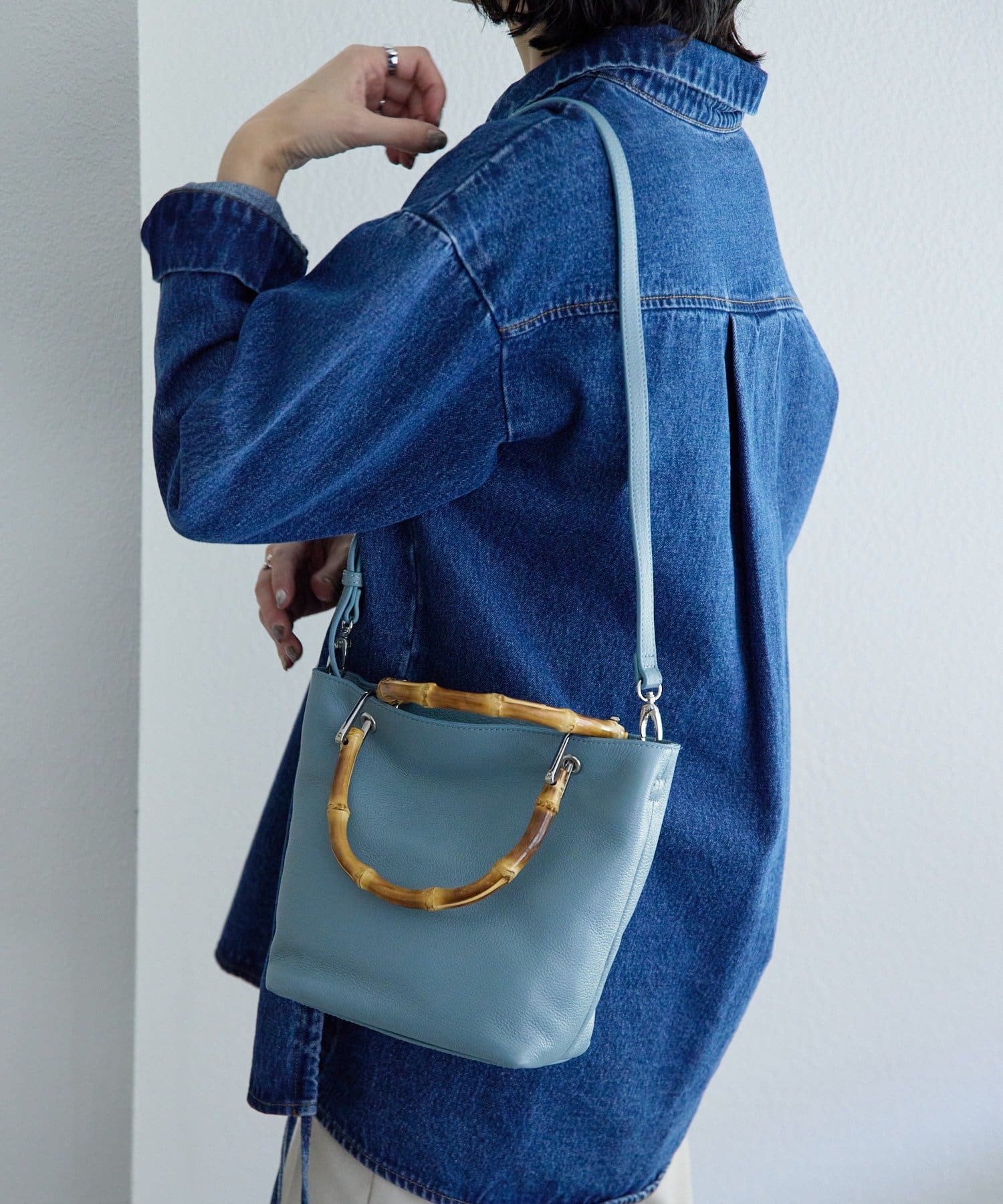 バンブーハンドルが印象的な大人の上質レザーバッグ。