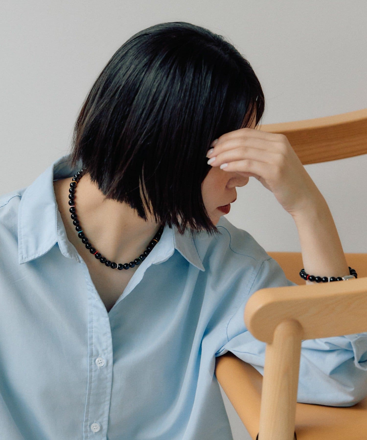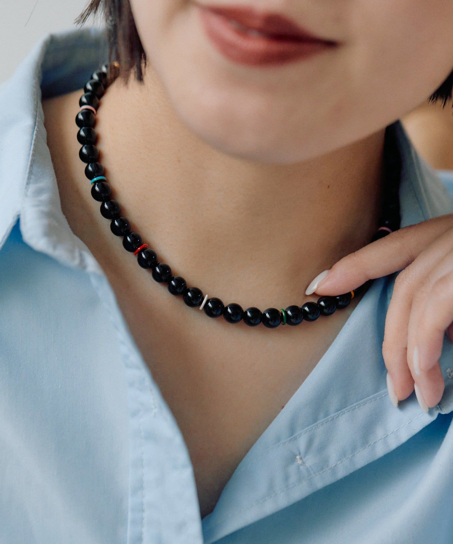 ブラックは人工石を使用しており、高級感のある艶めきが、胸元を華やかに演出。