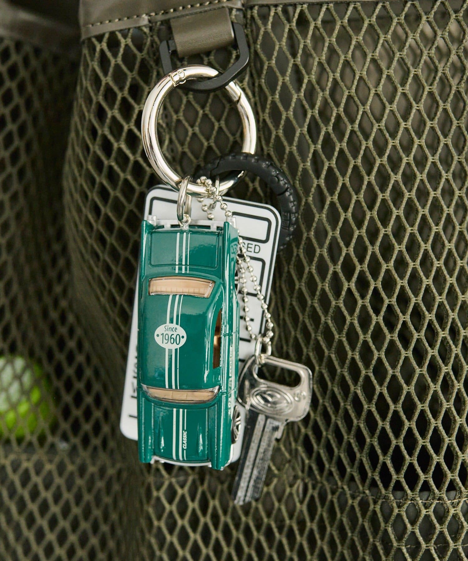 アメリカの中古車店で実際に使われていたプレートをモデルにしたパーツや、タイヤ型カラビナなど、細部までこだわりが光ります。