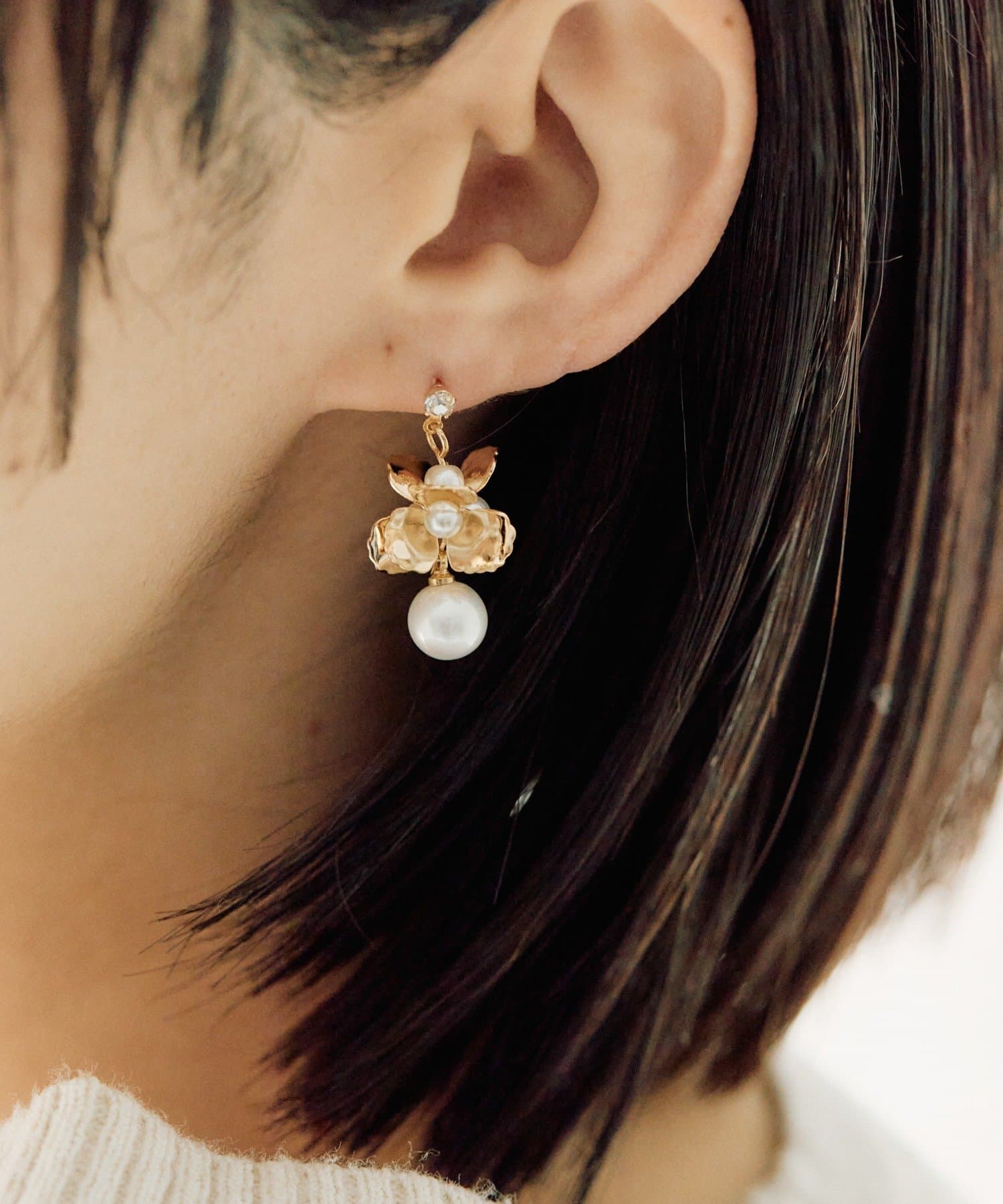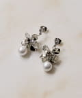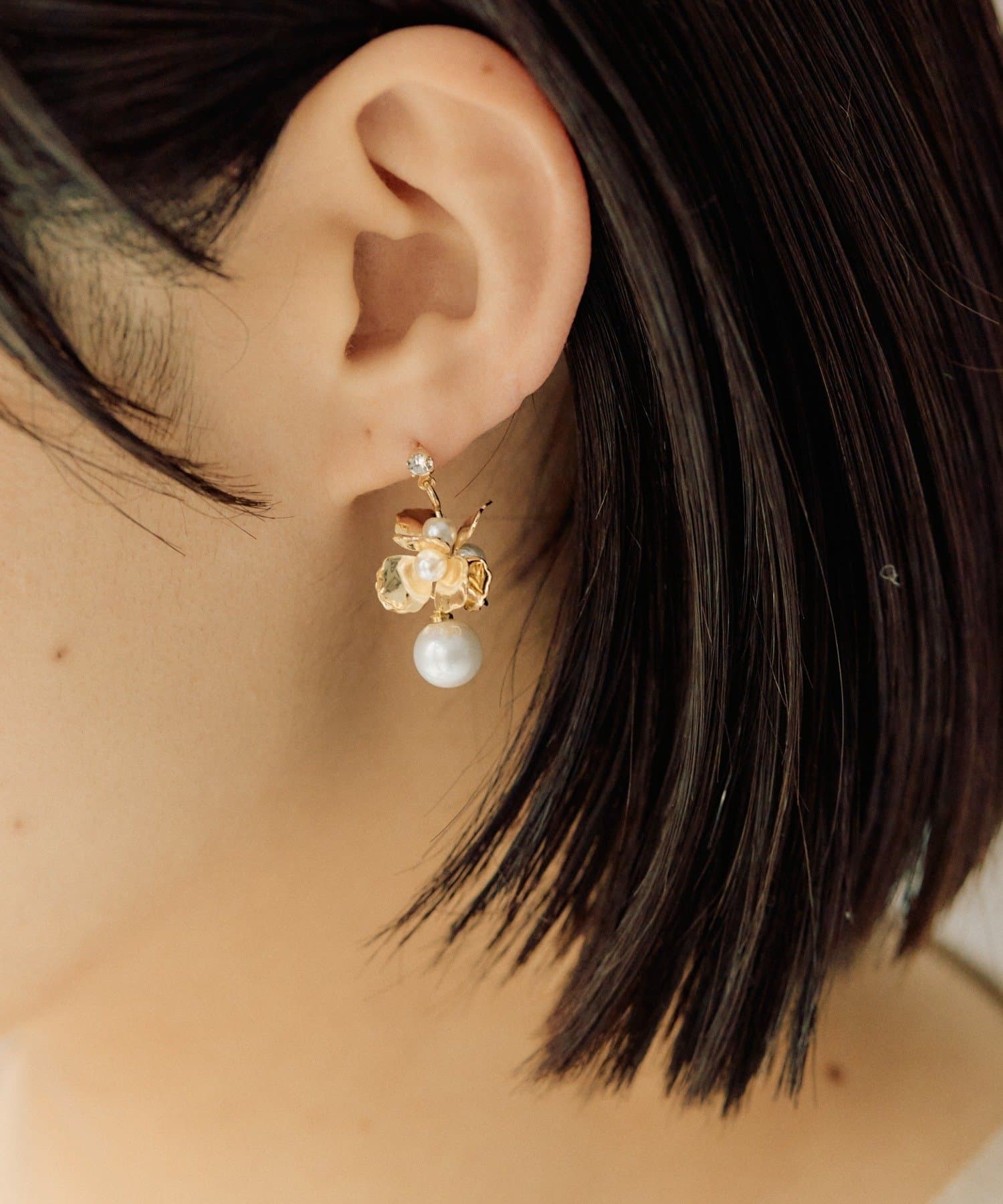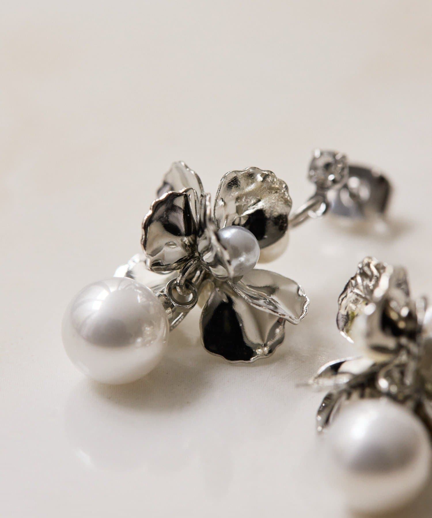 ひらひらと輝く花びらと、その下で上品に揺れるパールが印象的なピアス。