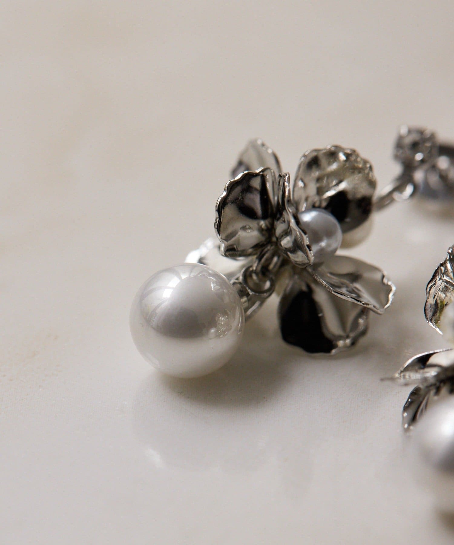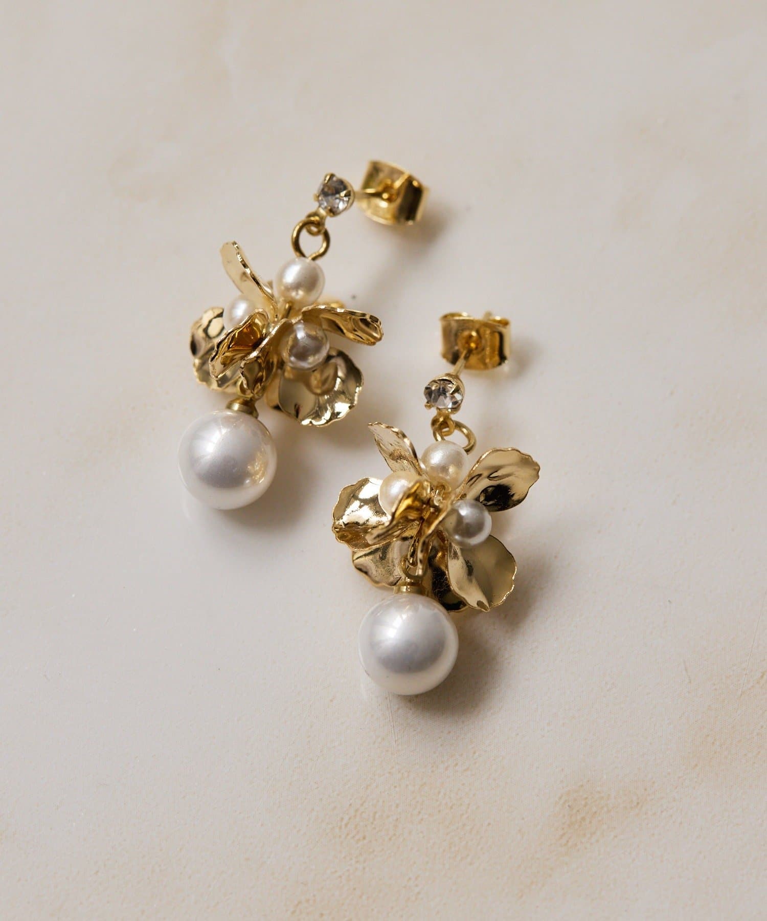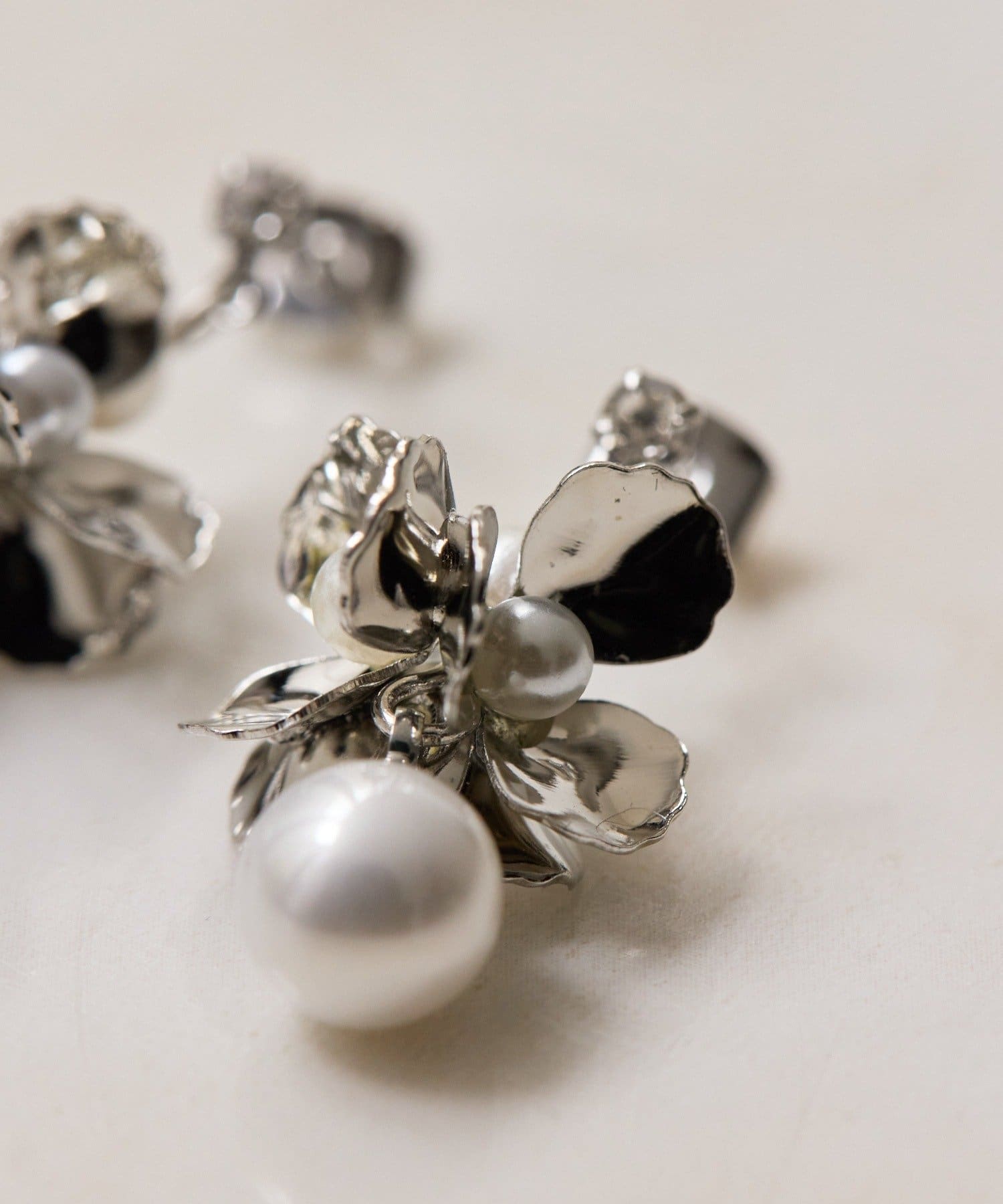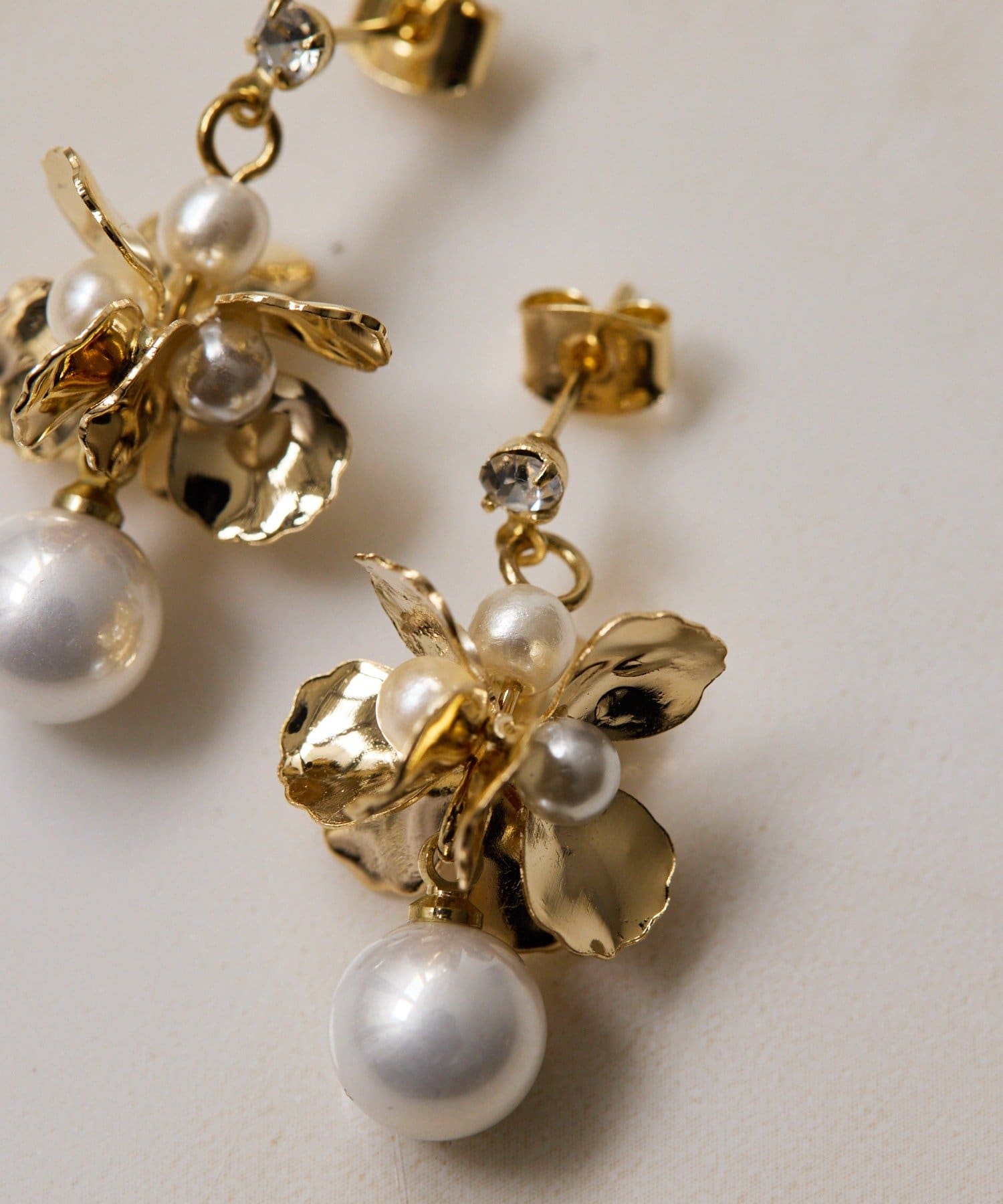 ひらひらと輝く花びらと、その下で上品に揺れるパールが印象的なピアス。