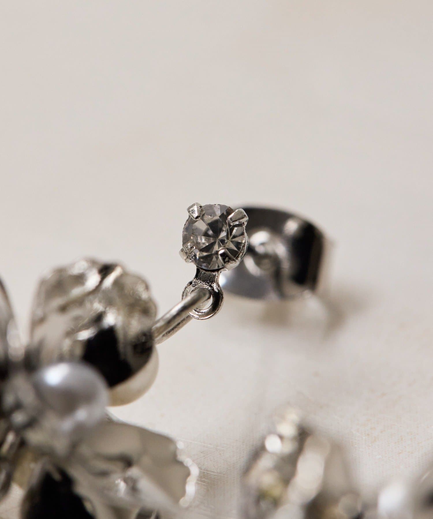 ポスト部分にあしらわれたクリスタルが、さりげない女性らしさをプラス。