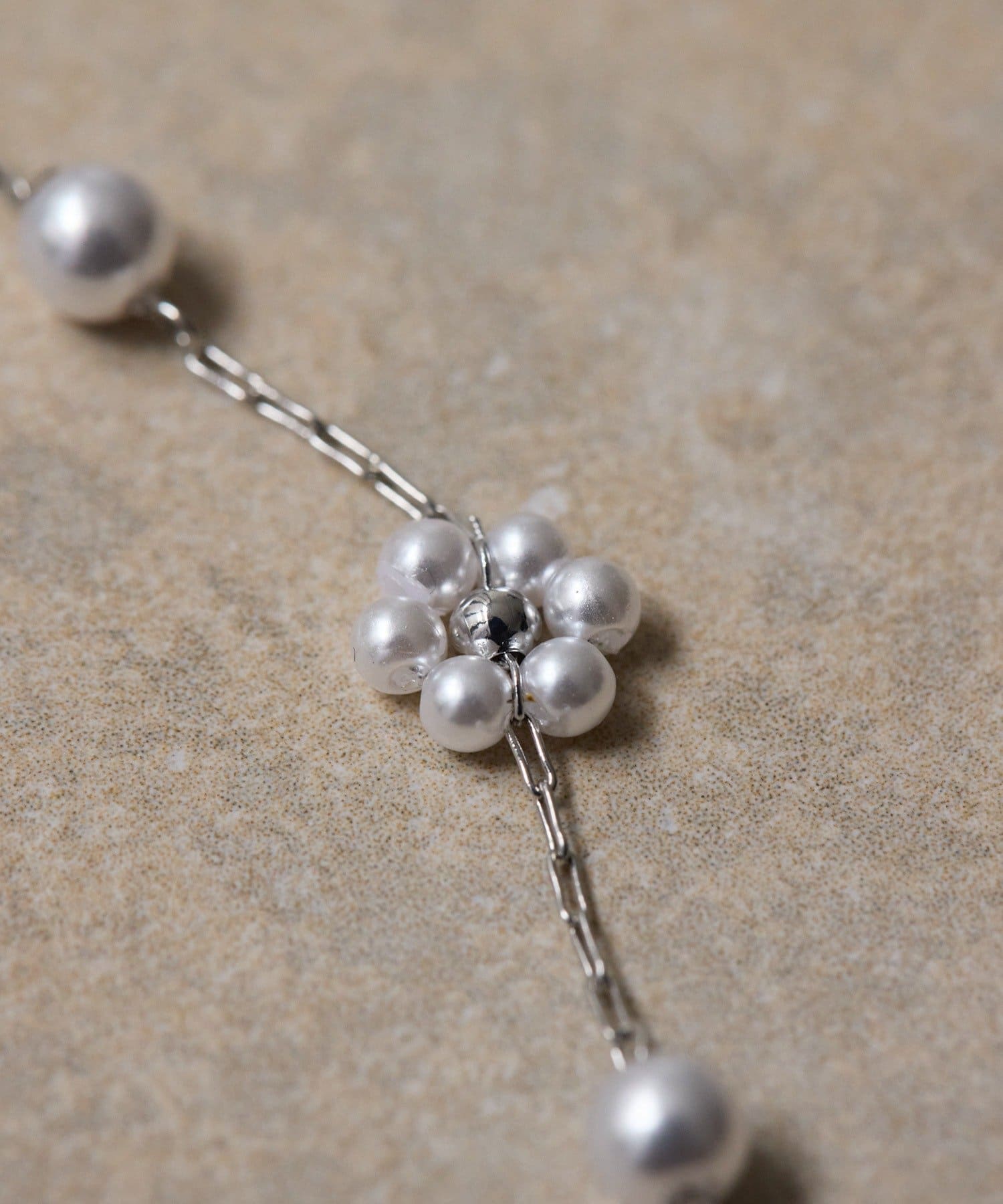 可愛らしいお花形パールと、上品なラウンドパールを交互に連ね、胸元に華やぎを添えます。
