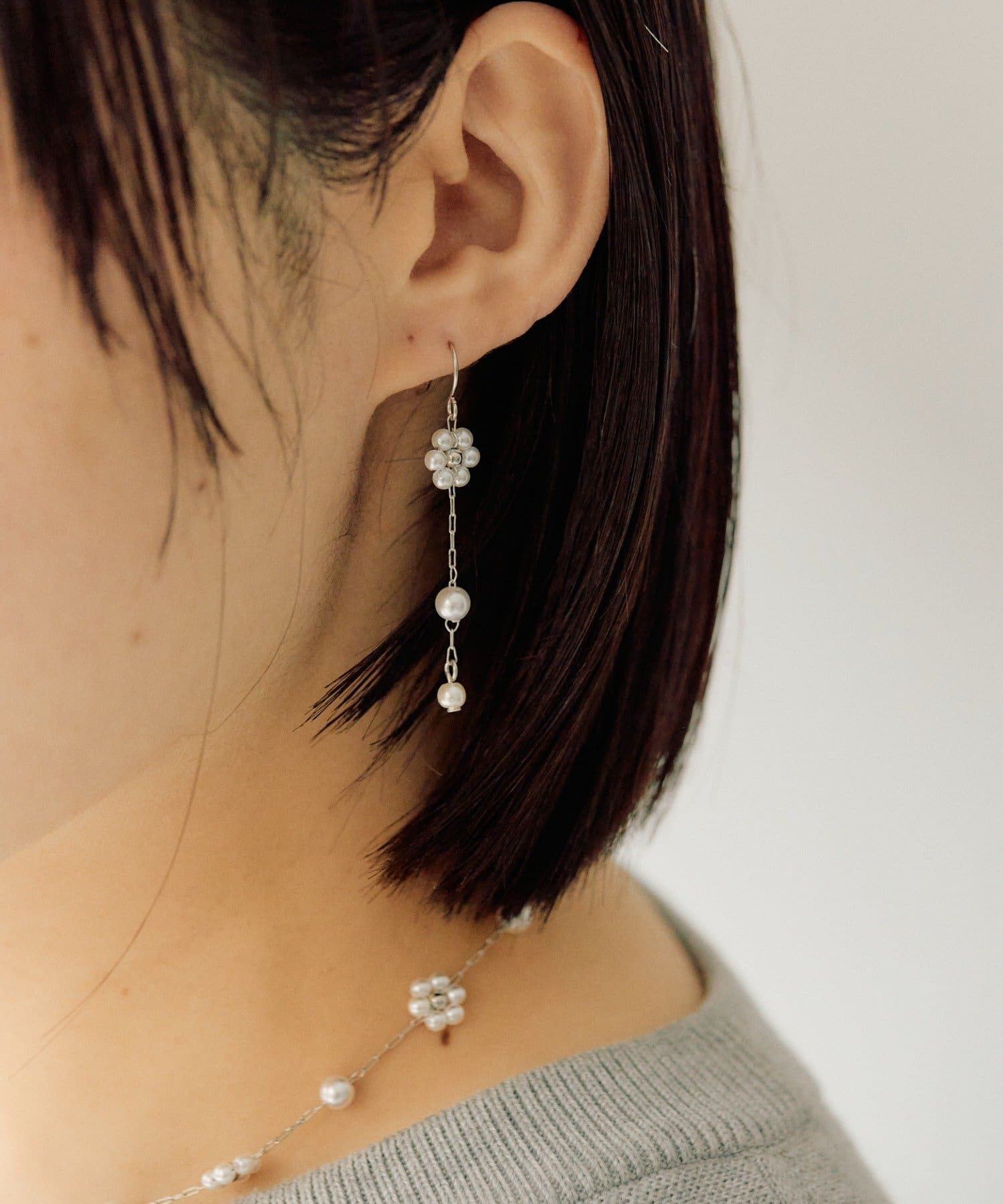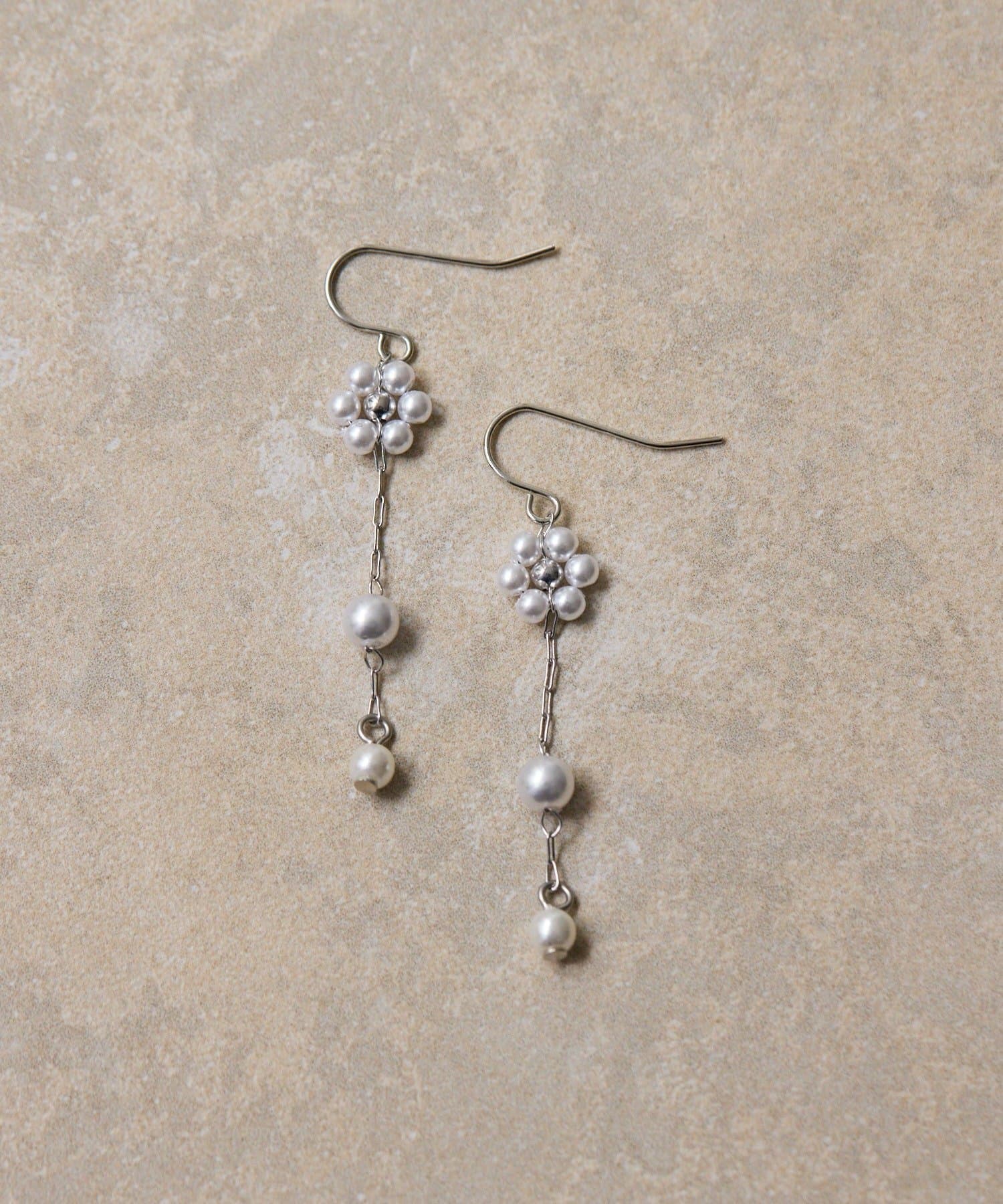 耳元で優雅に揺れる「フラワーパールピアス」。