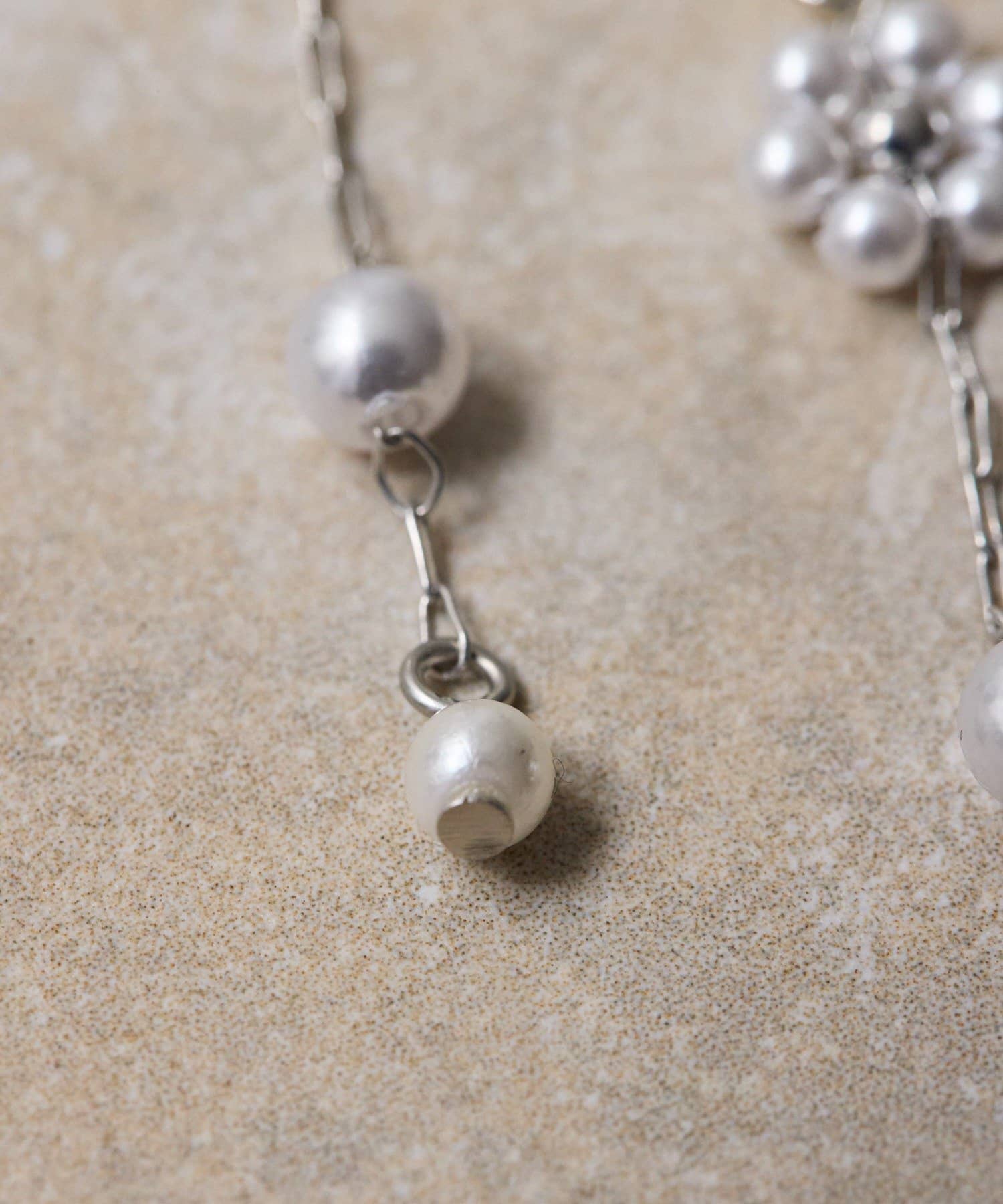 お花形に編み込まれた繊細なパールと、上品なラウンドパールが連なり、女性らしさを引き立てます。