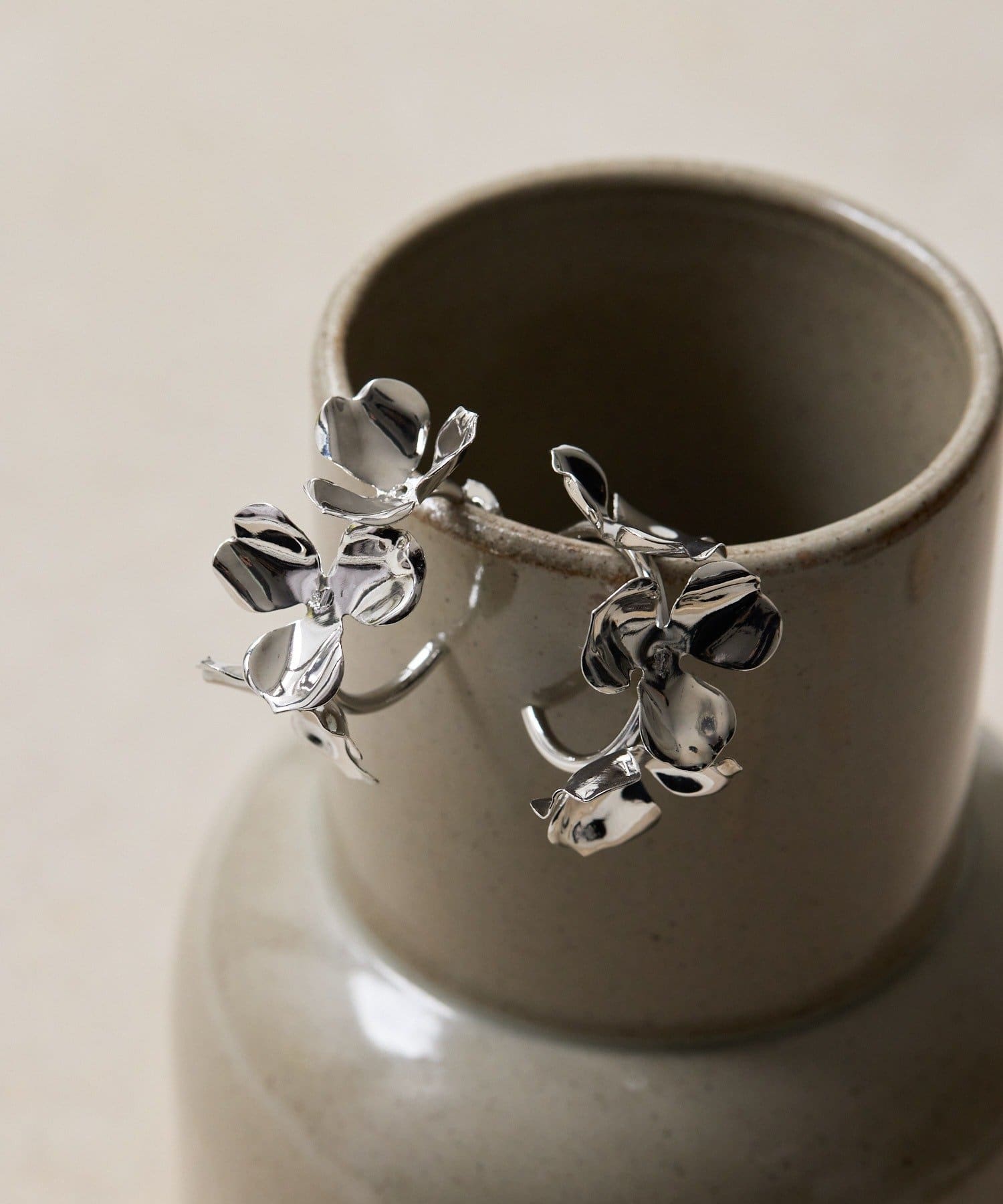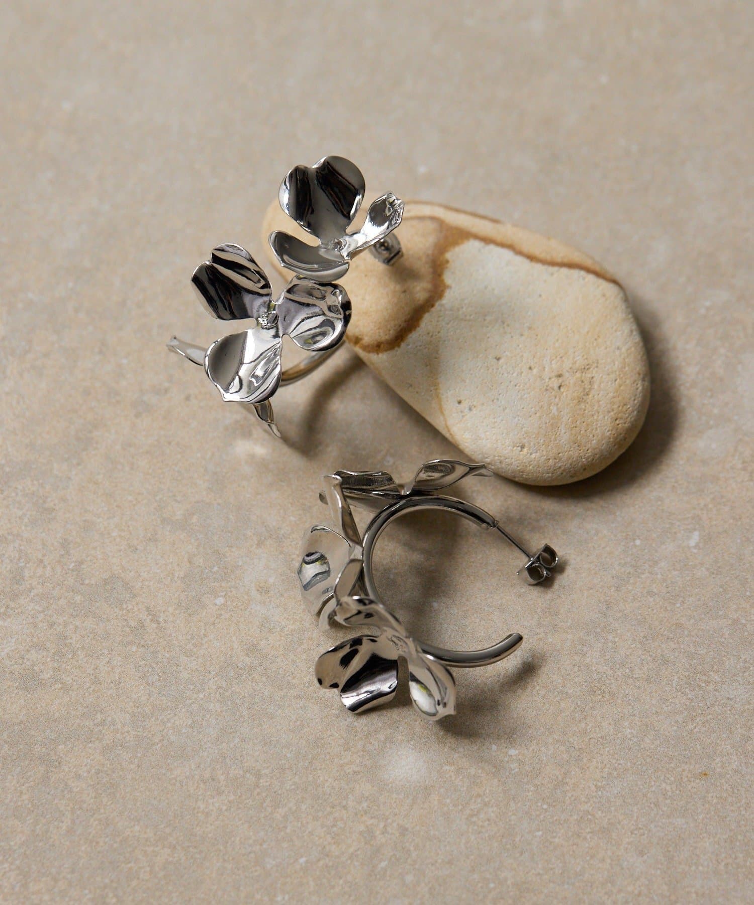 メタルフラワーフープピアスは、クールな輝きを放つ花モチーフが、あなたの個性を引き立てます。