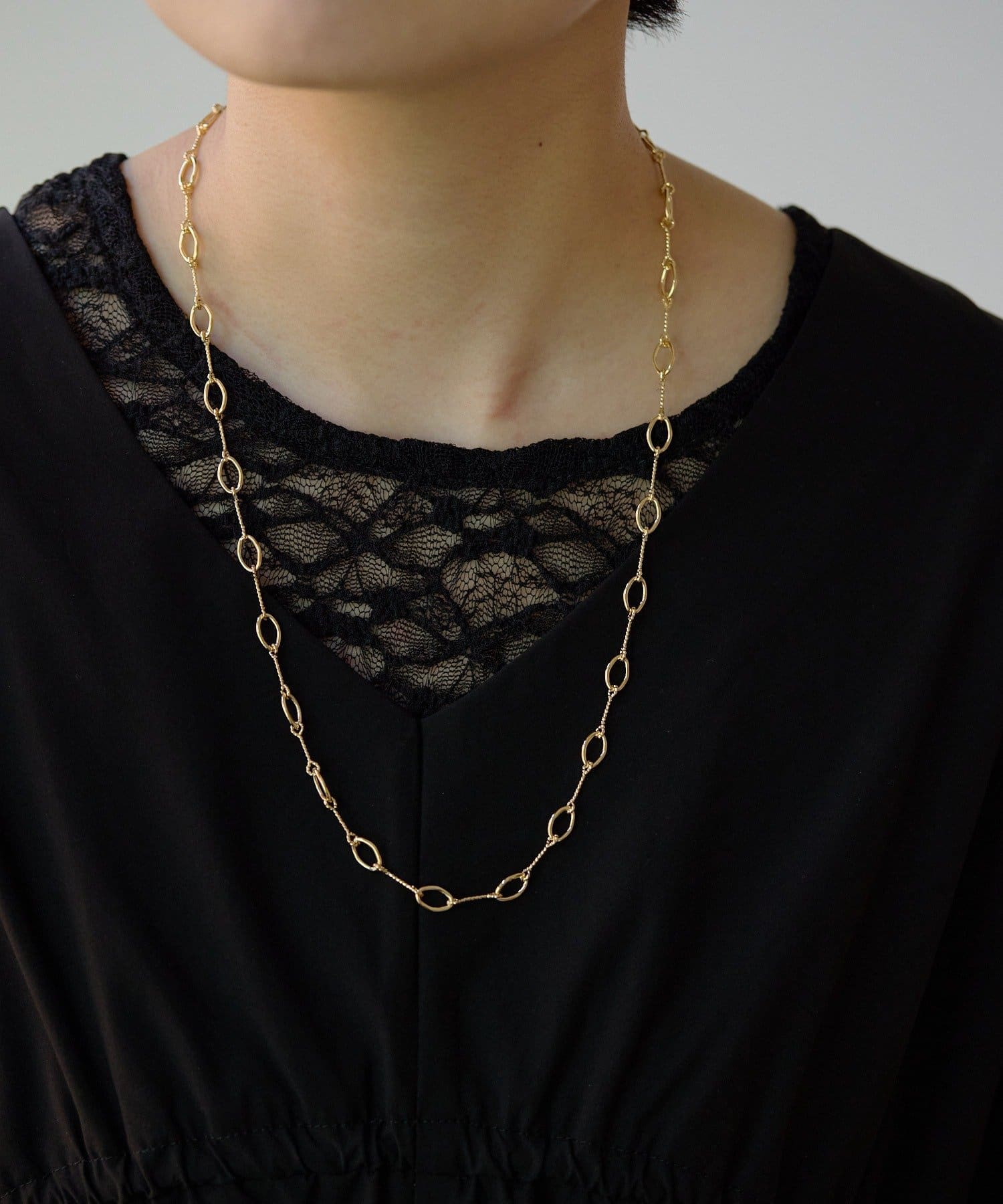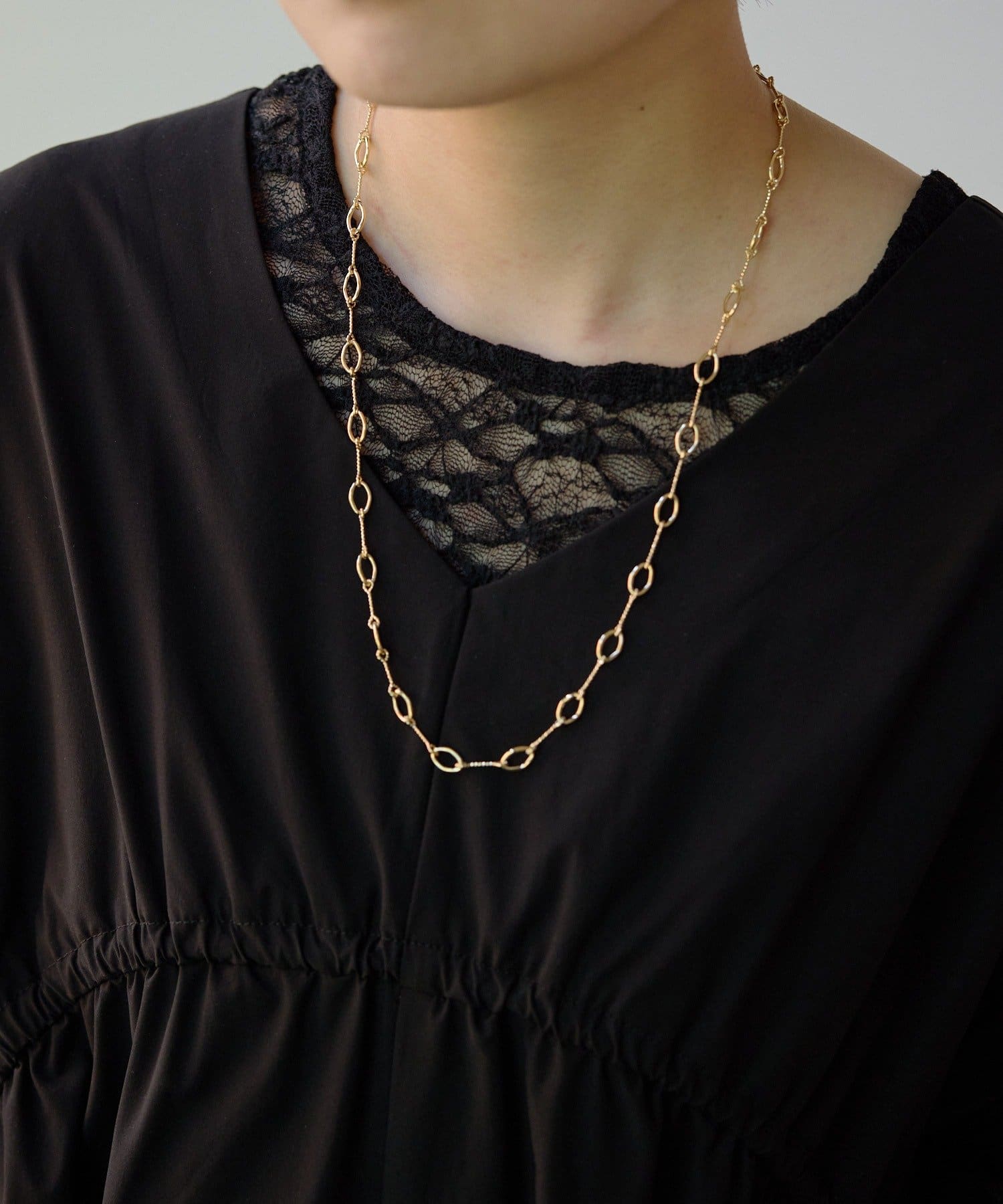 ・控えめに輝くデザインチェーンは、オフィススタイルにも合わせやすそう