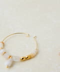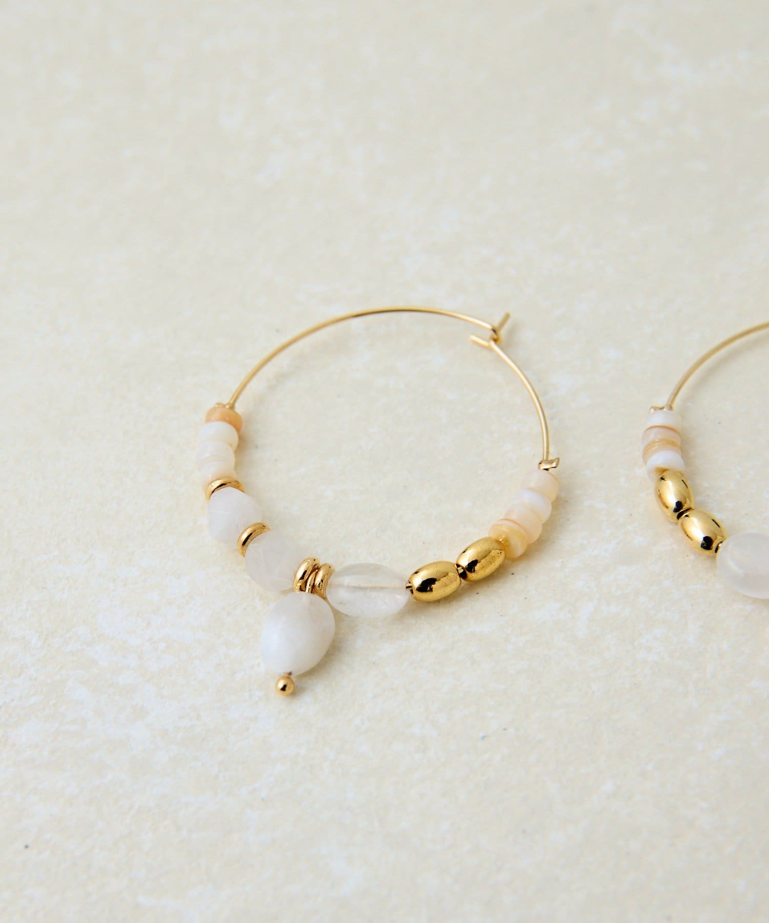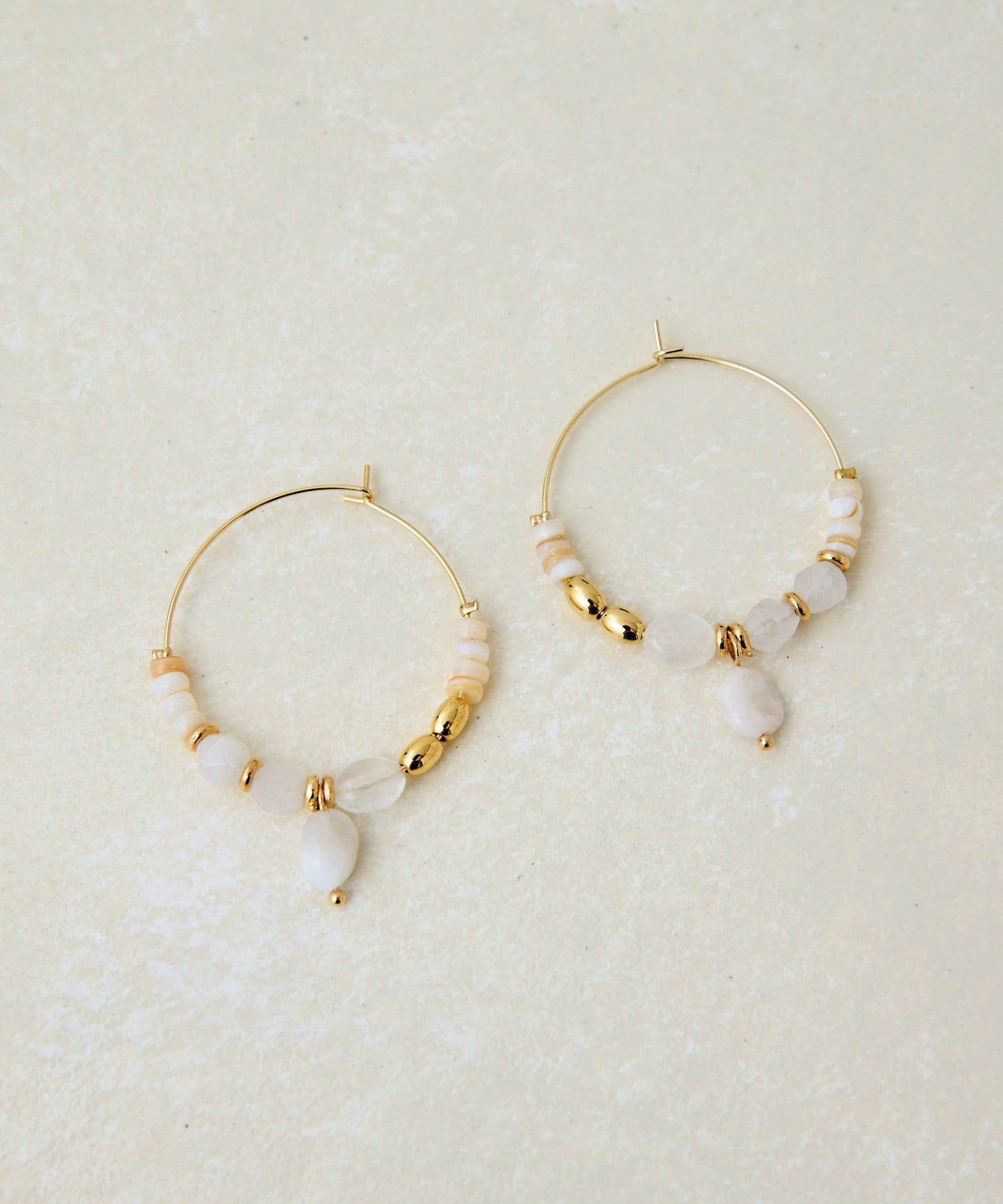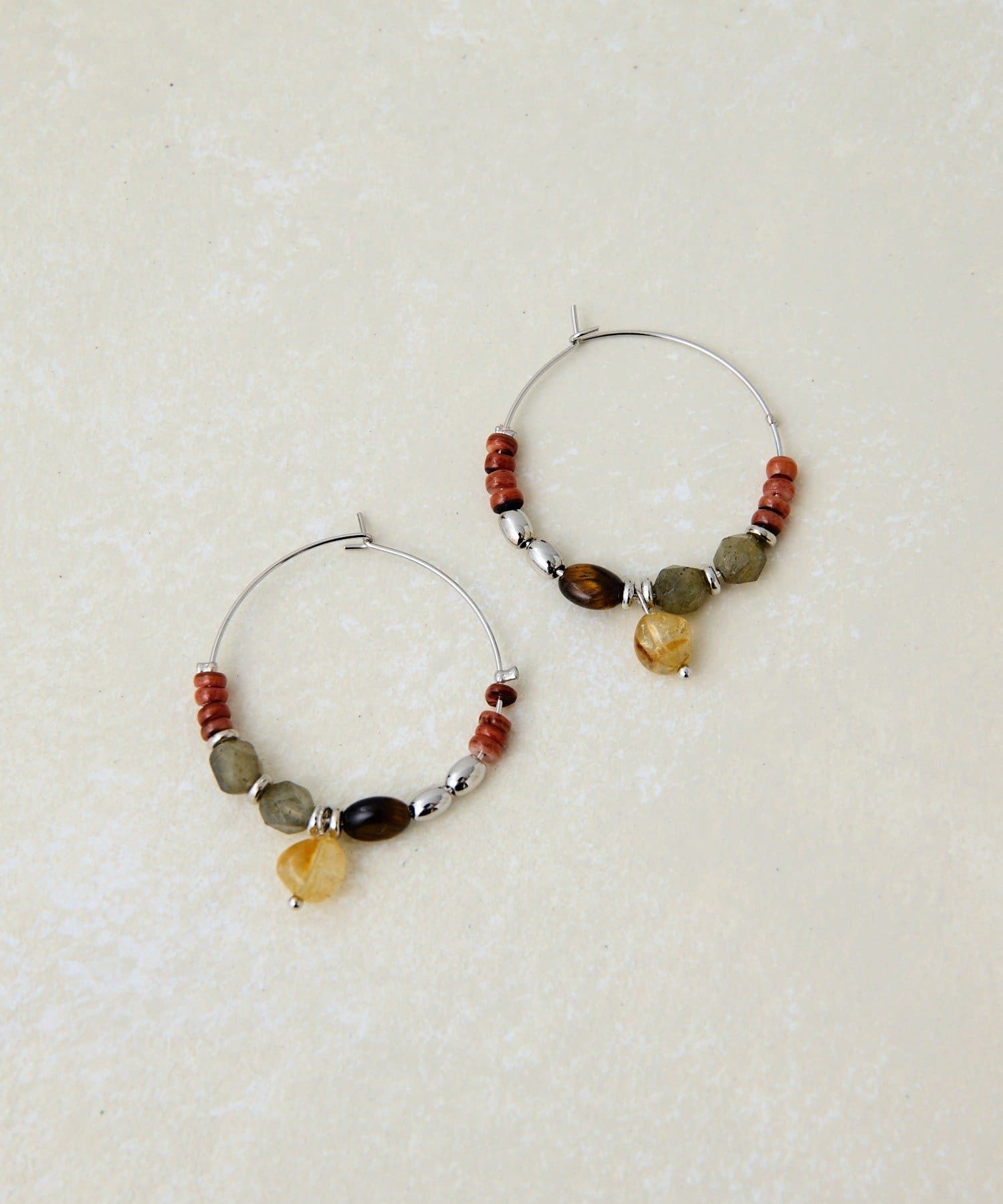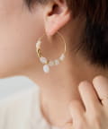 様々な天然石をあしらったフープピアスは、存在感のあるデザイン。