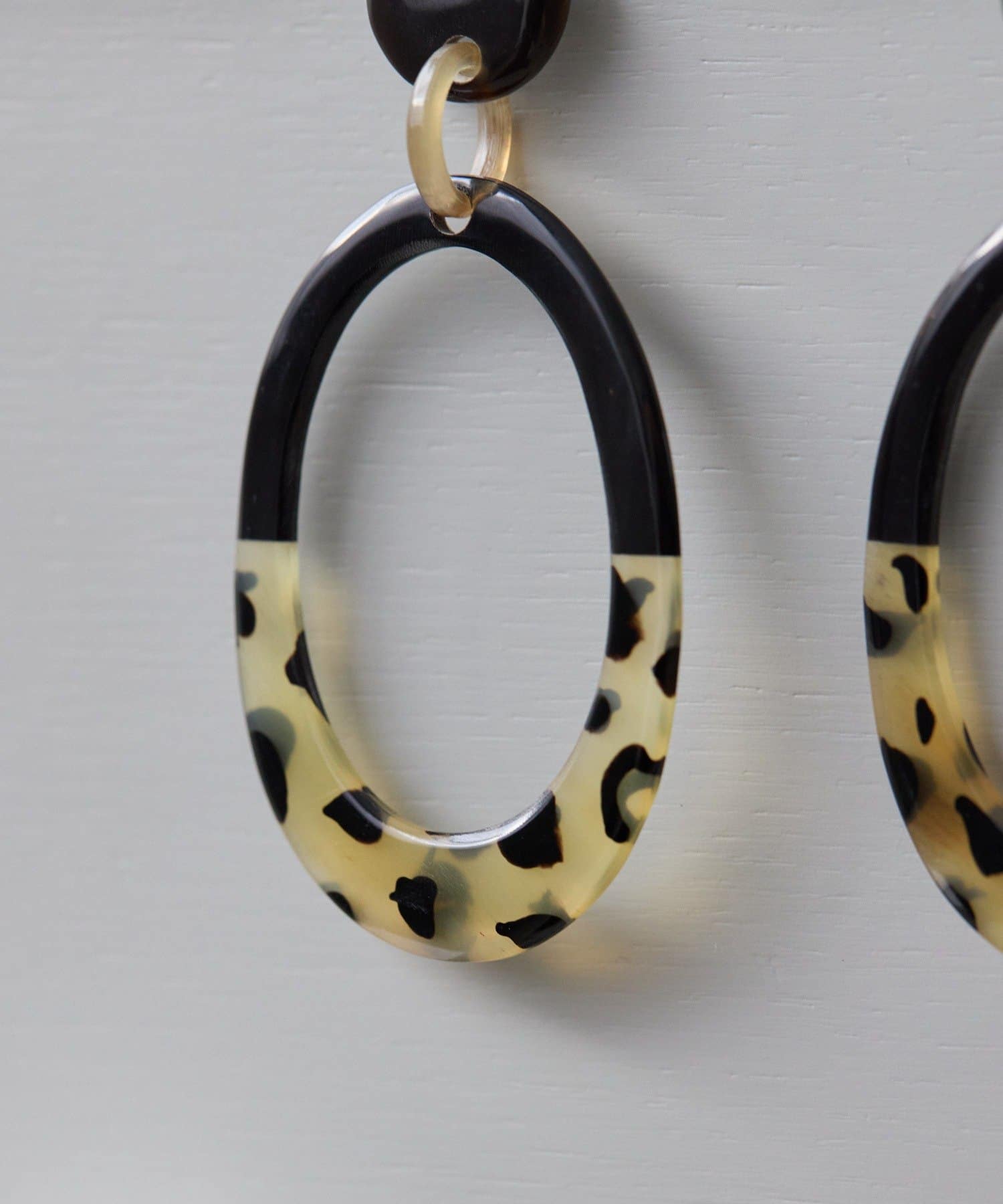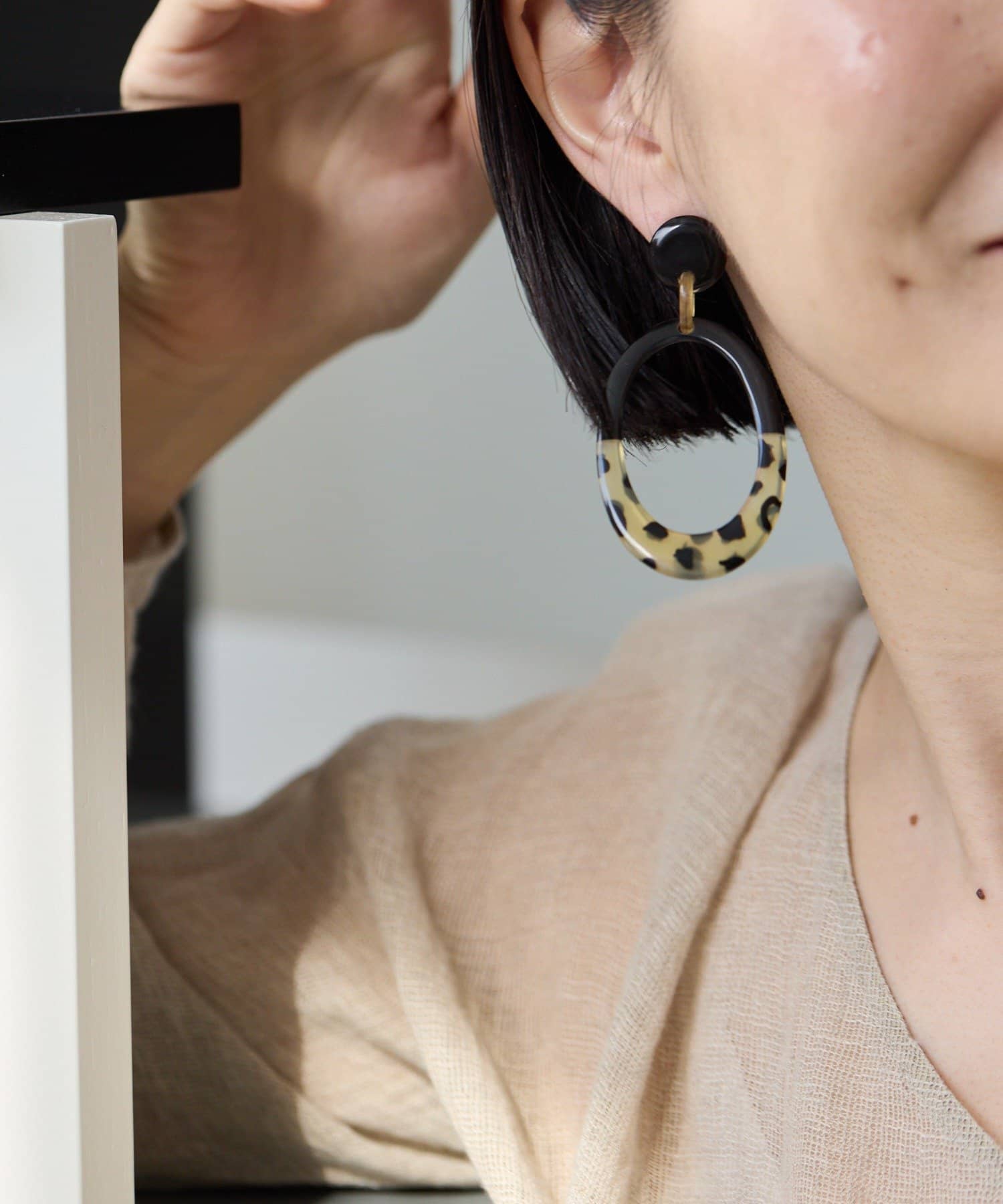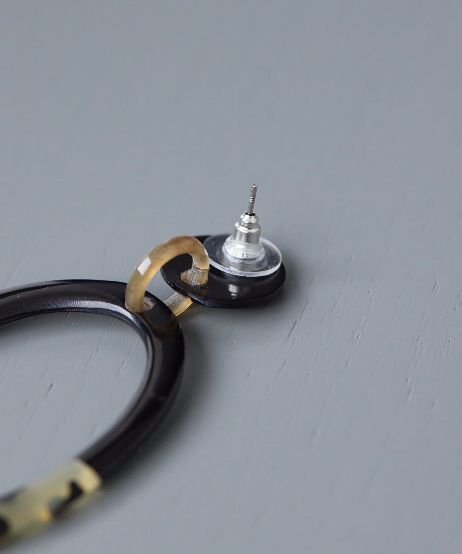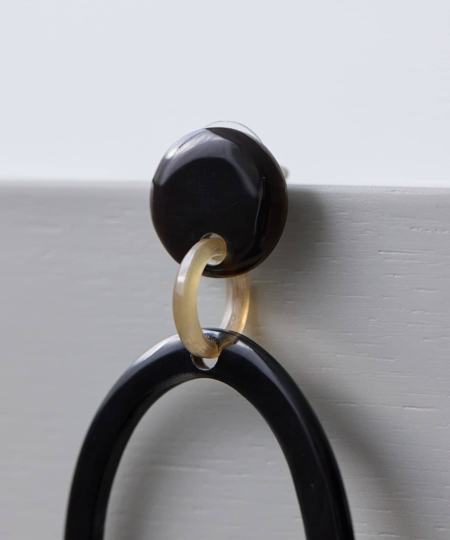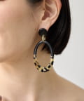 水牛角柄入りのオーバルピアスは、落ち着いた色味の中に遊び心を感じさせるデザイン。