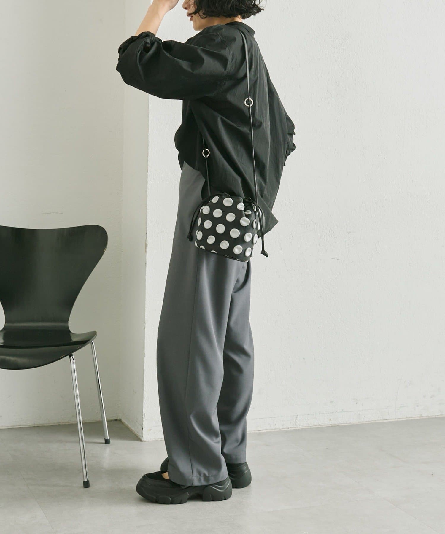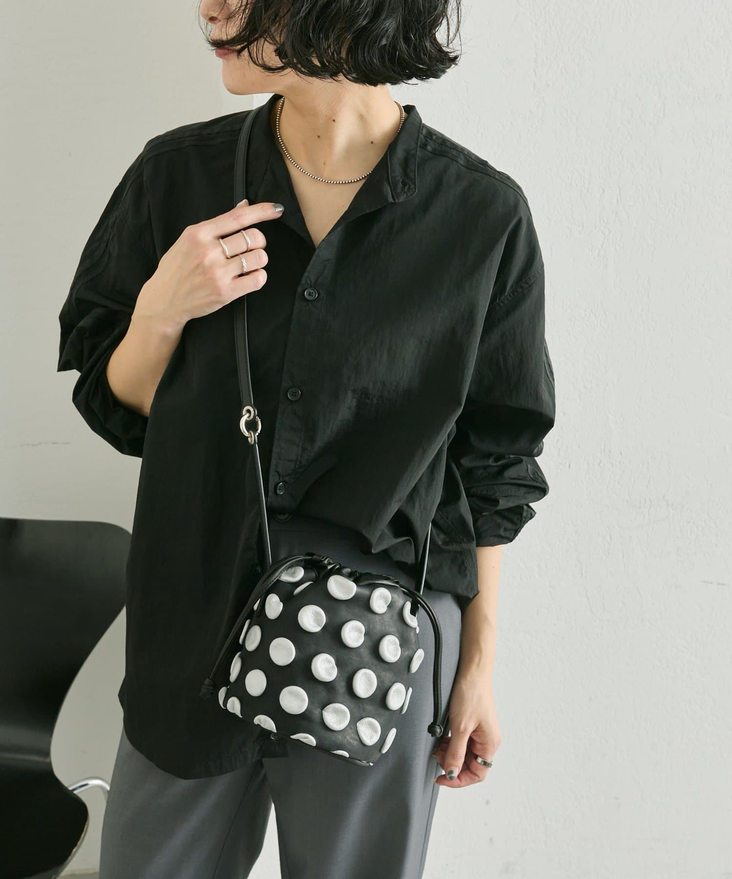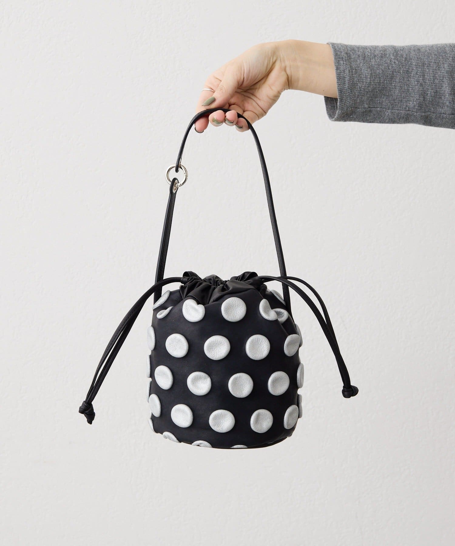 立体的な水玉模様が、装いにリズムと奥行きをもたらす巾着型の2WAYバッグ。