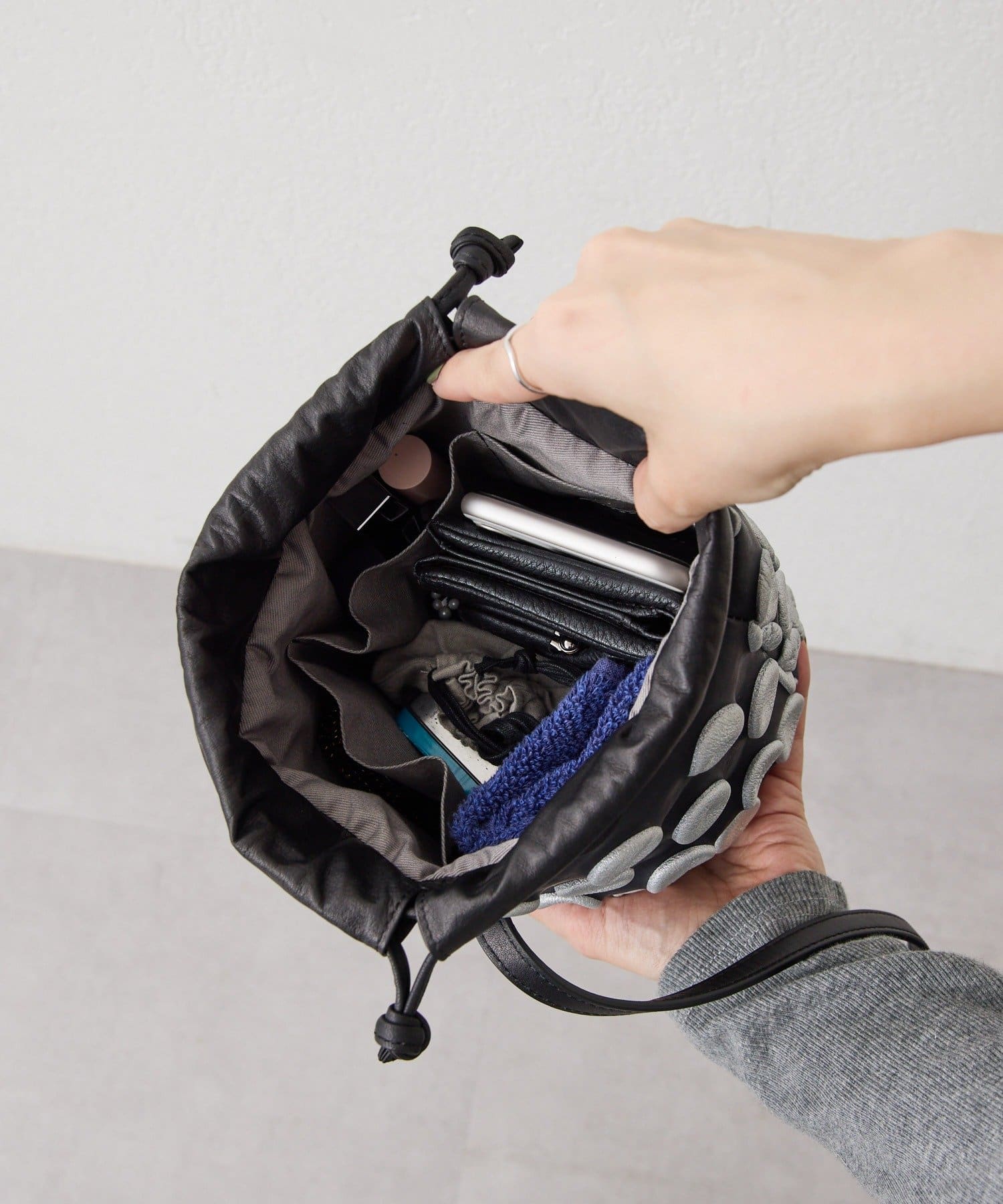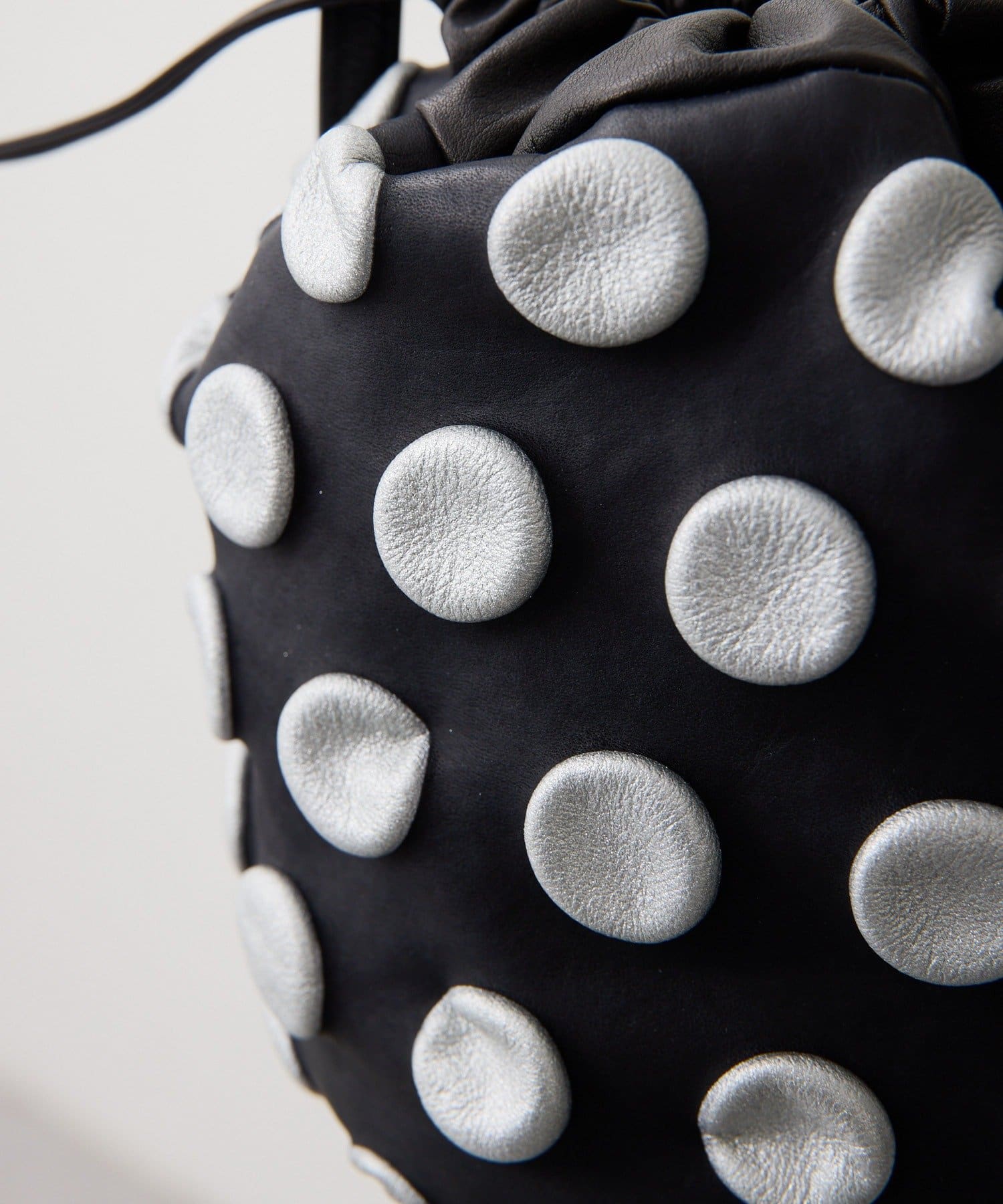 口元をキュッと絞ることで生まれる柔らかなレザーのドレープと、整然と並ぶドットの凹凸が絶妙なコントラストを描きます。