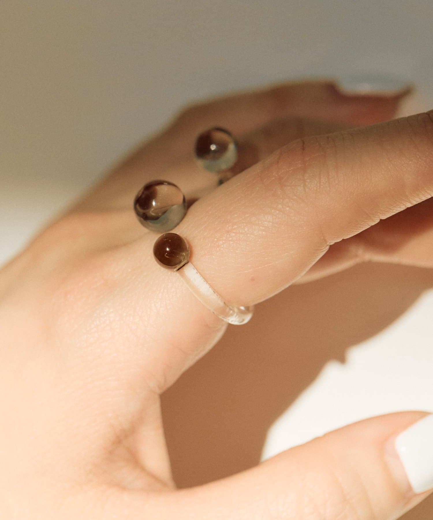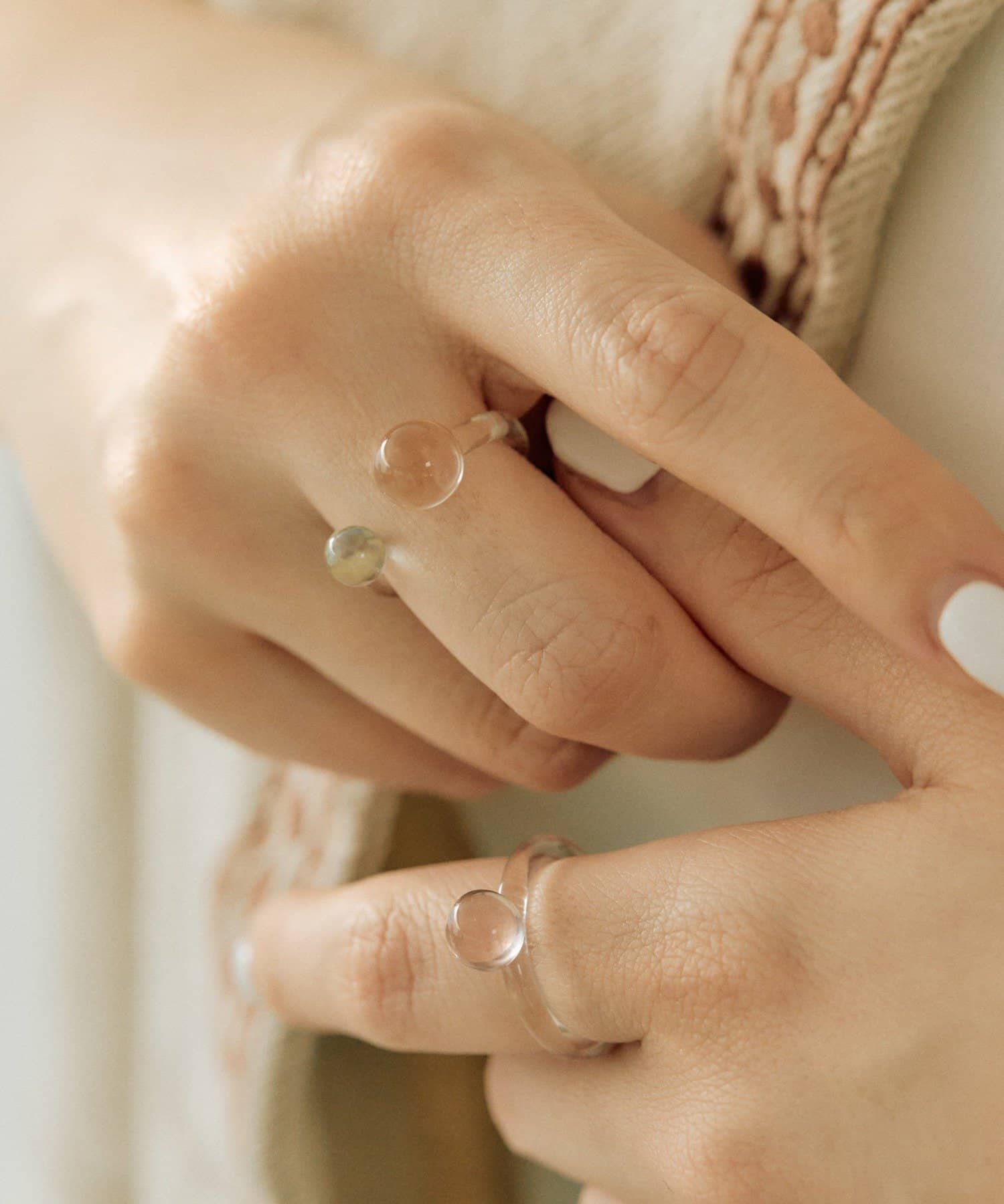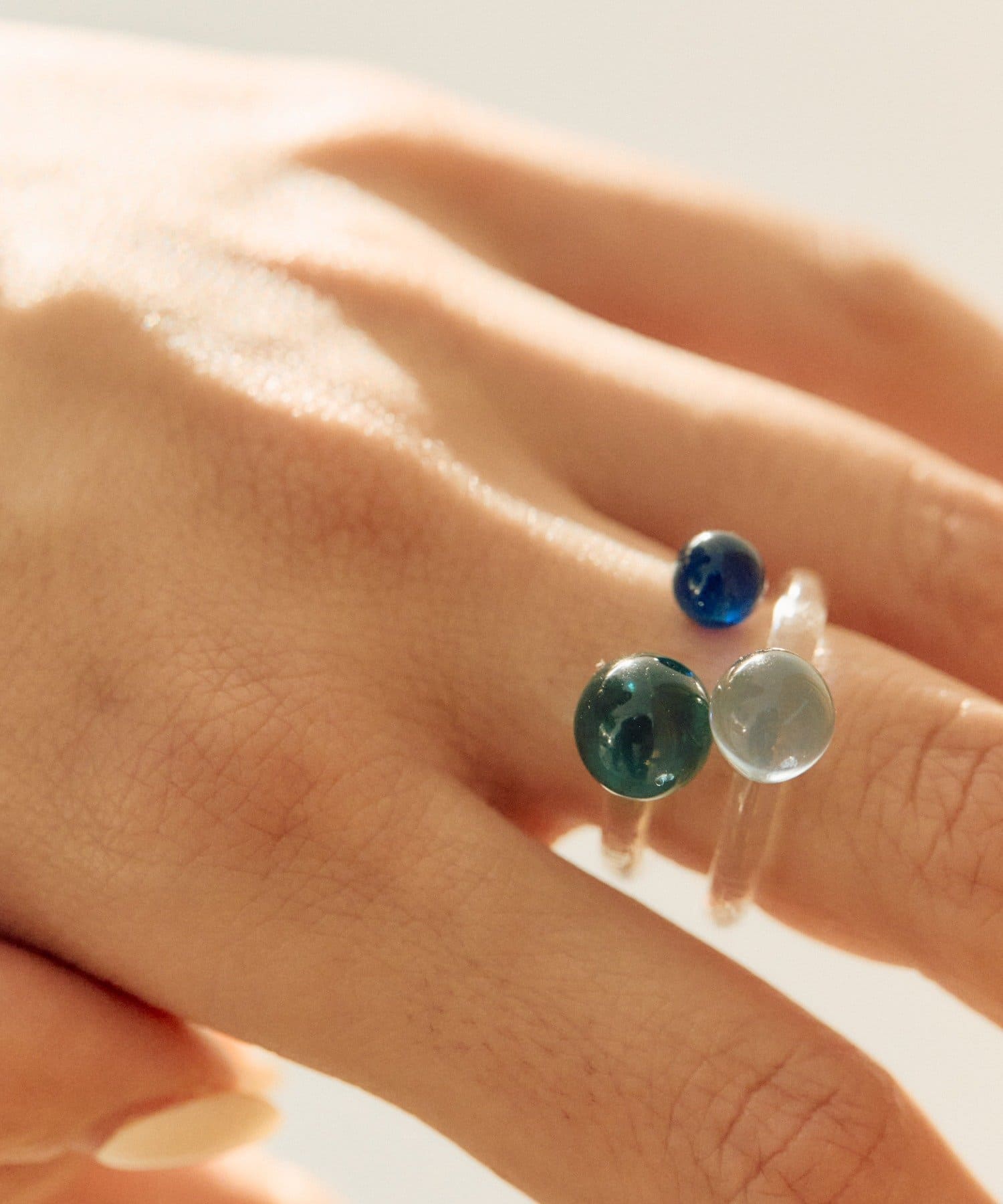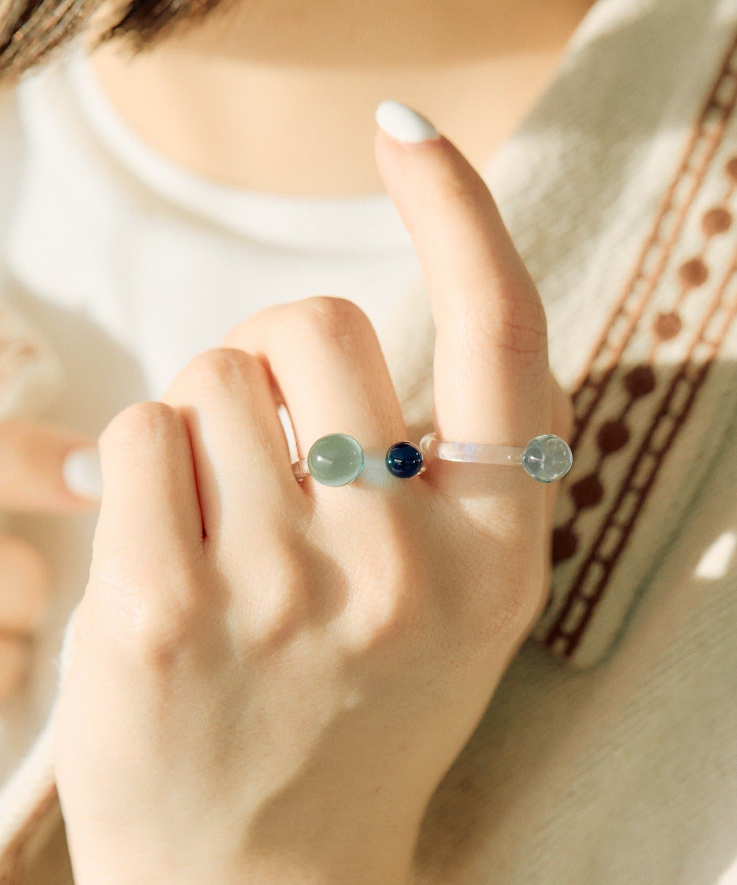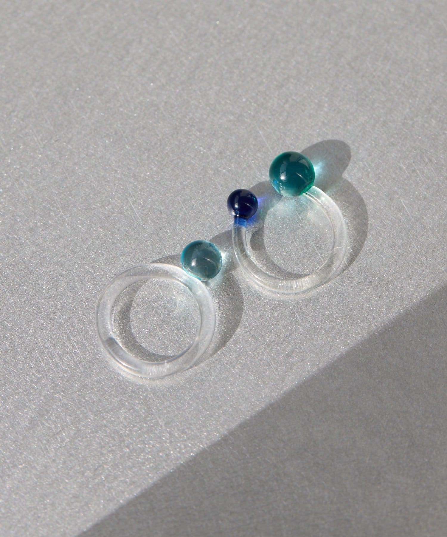 透明感あふれる樹脂が涼しげな、クリアボールセットリング。