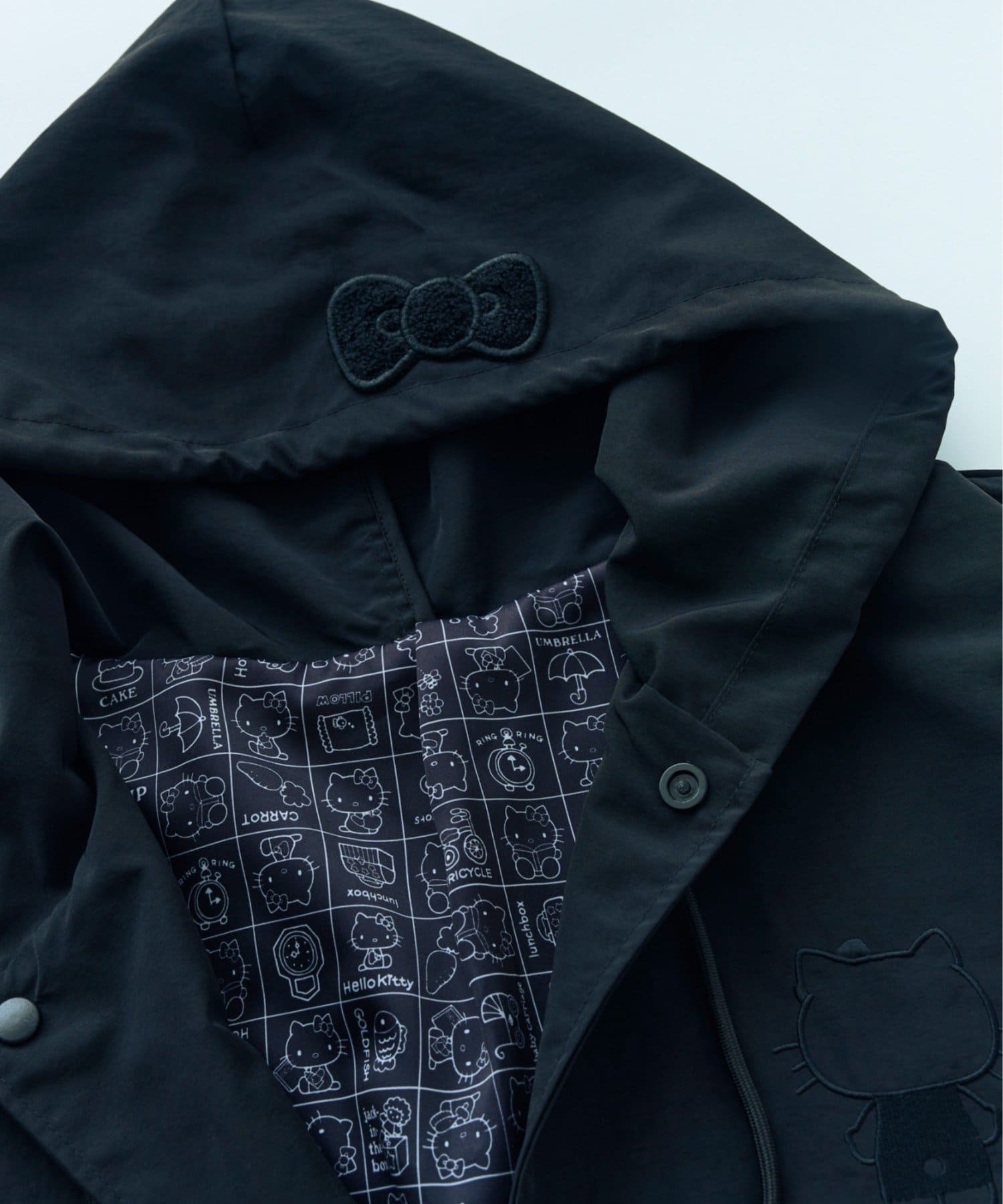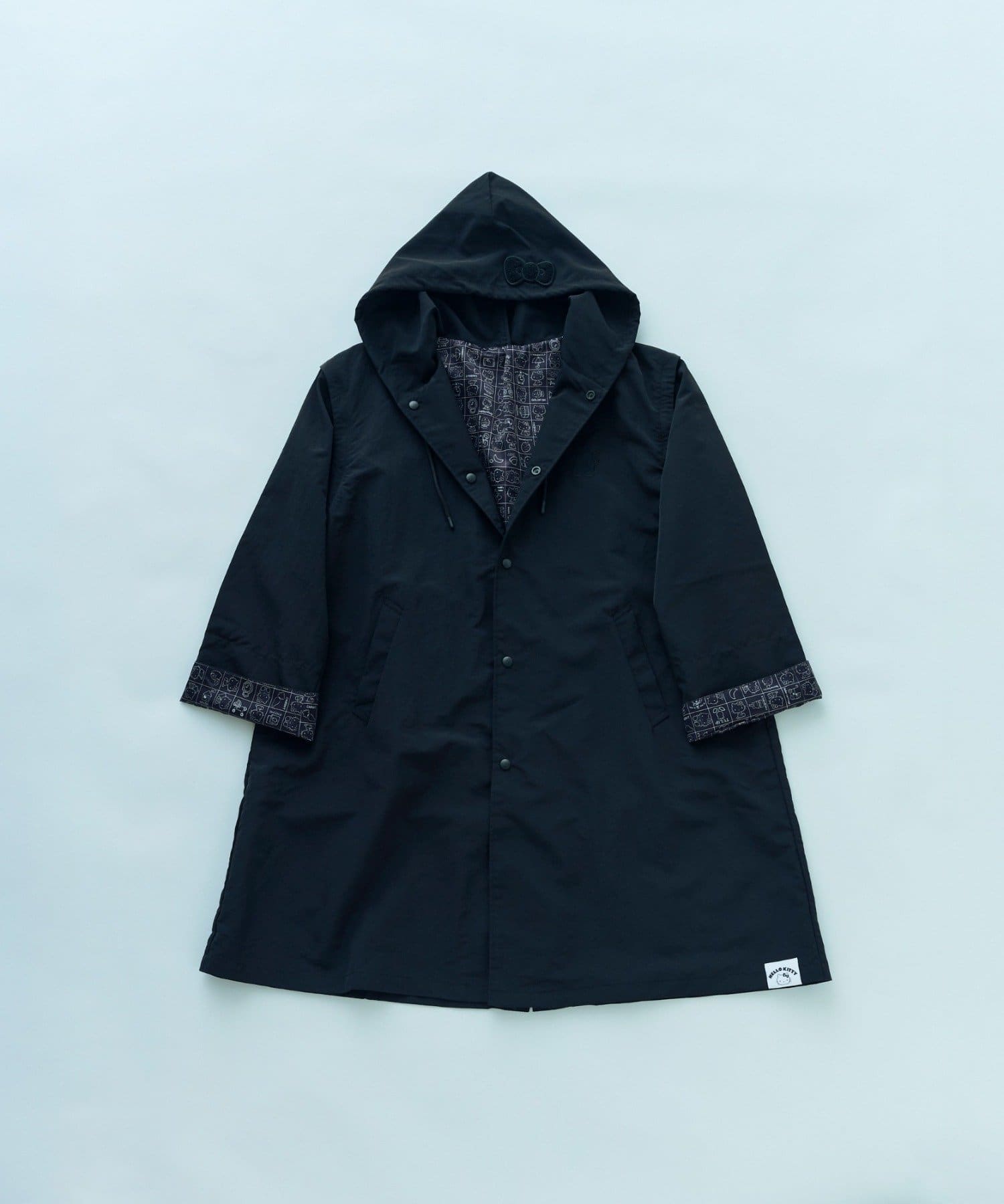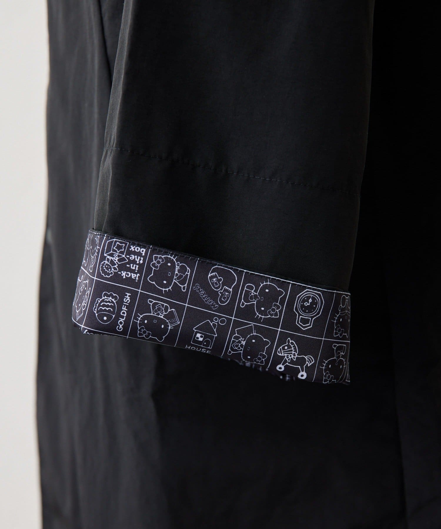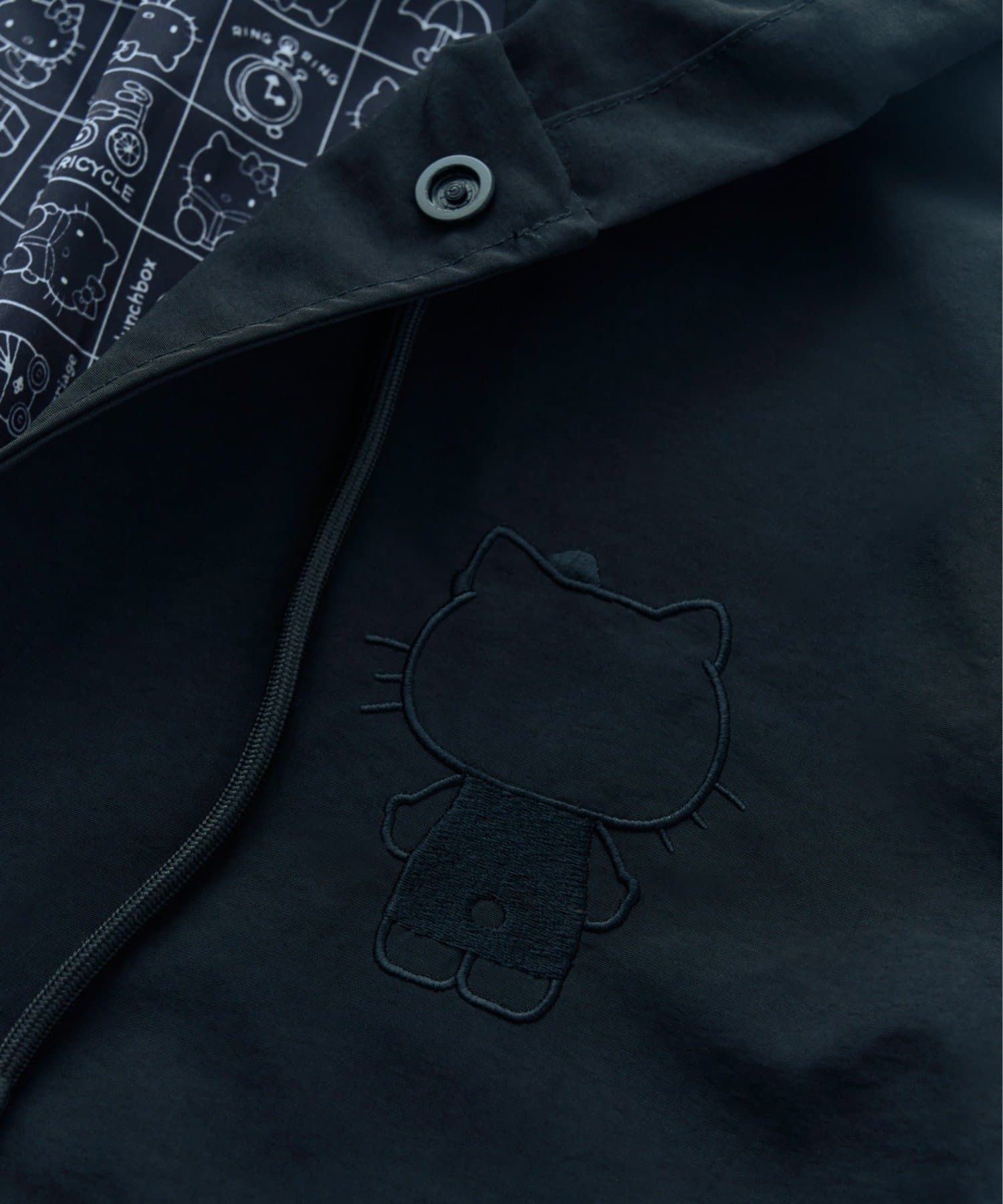 見頃の裏地と袖の裏地には、ブラックで落ち着いた印象のハローキティのプリント柄を使用。