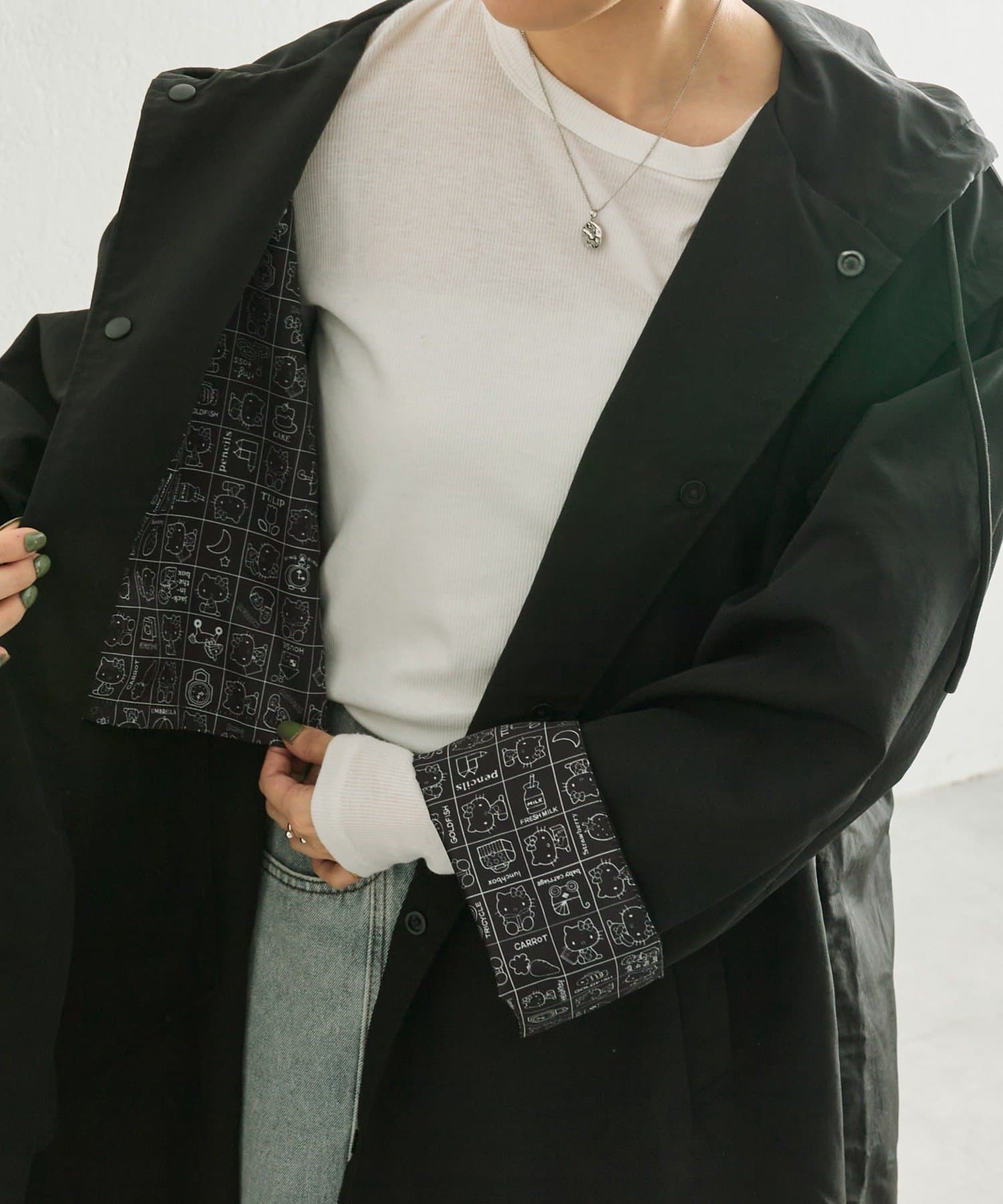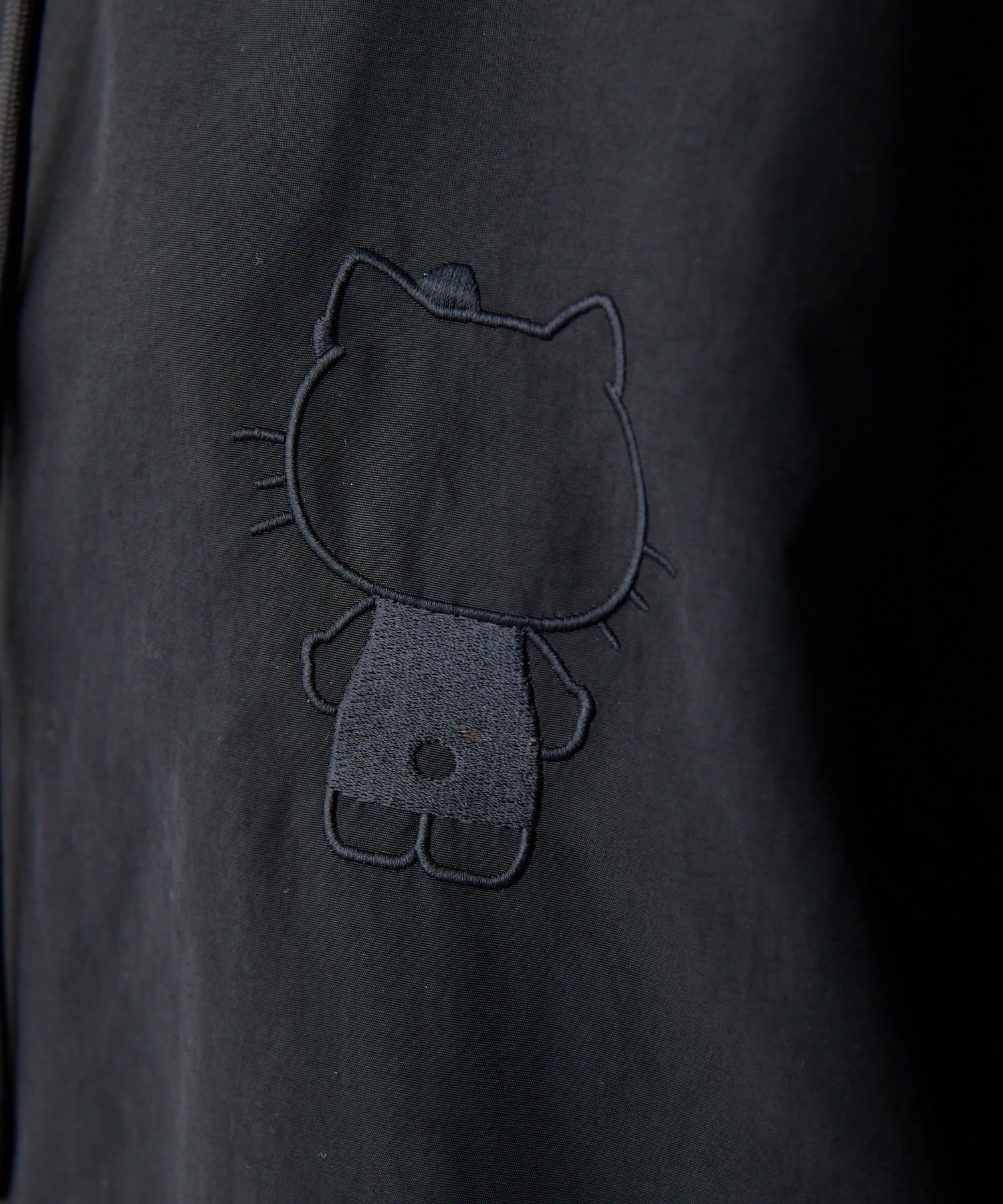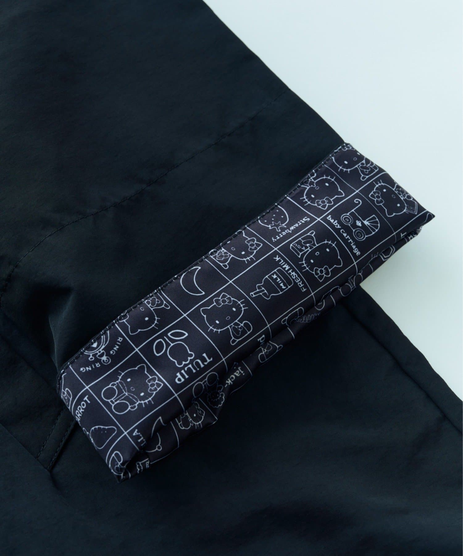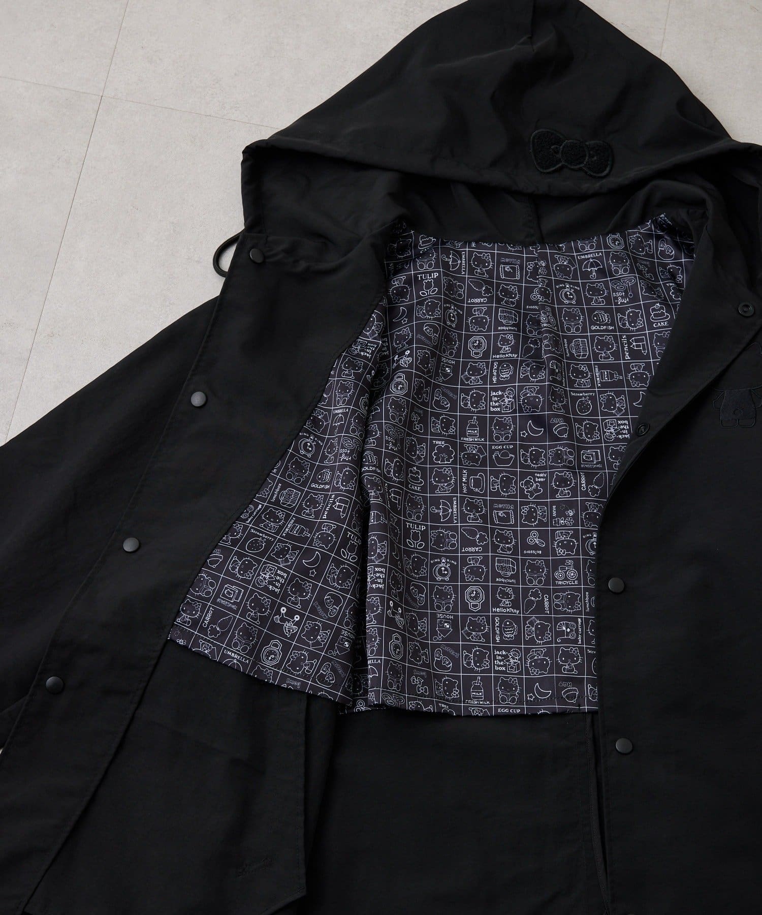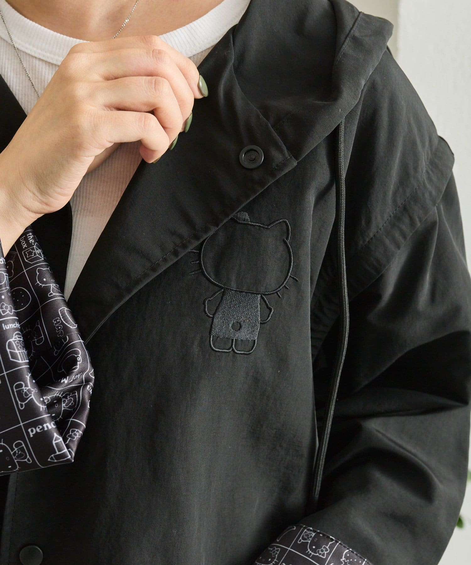見頃の裏地と袖の裏地には、ブラックで落ち着いた印象のハローキティのプリント柄を使用。