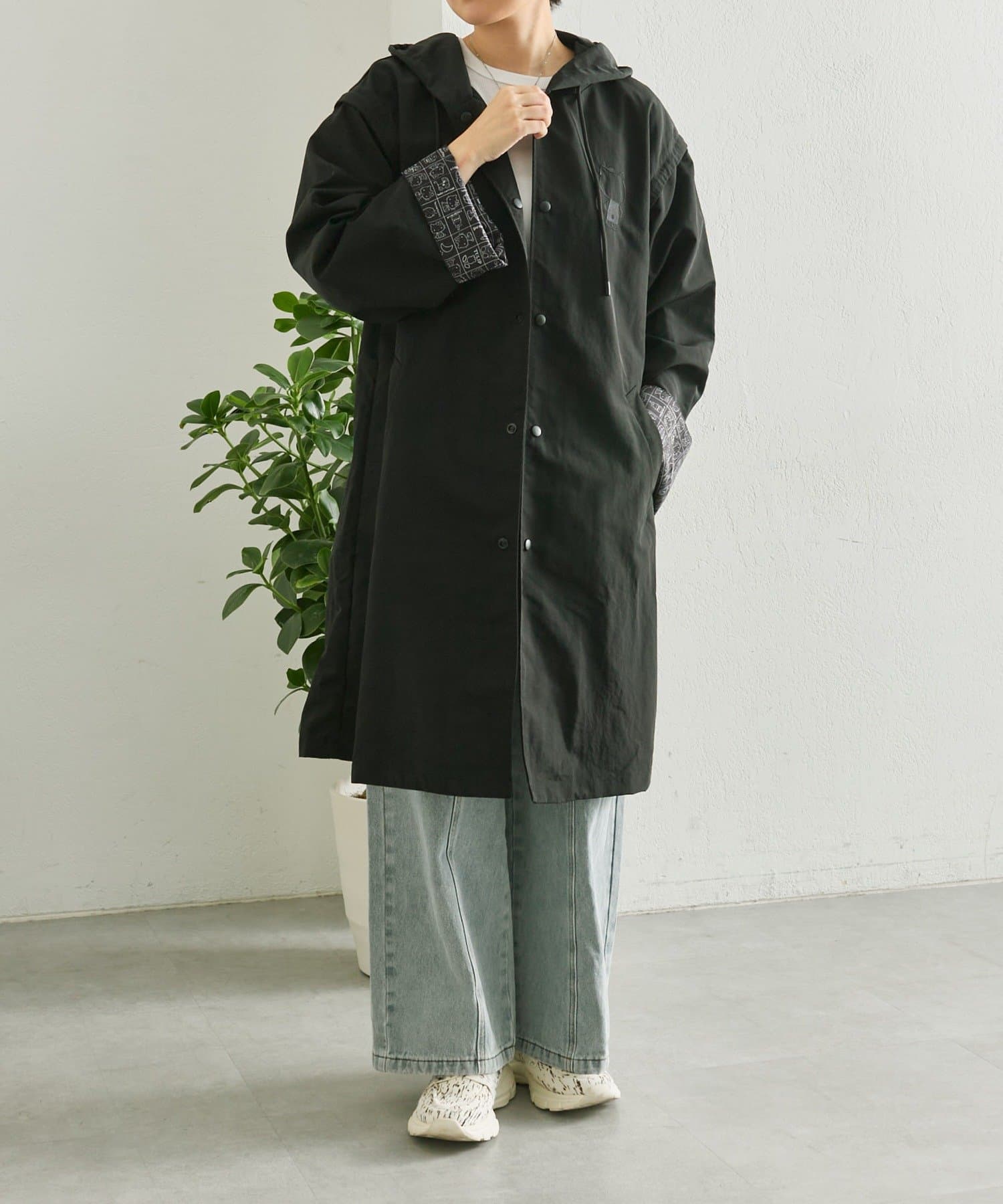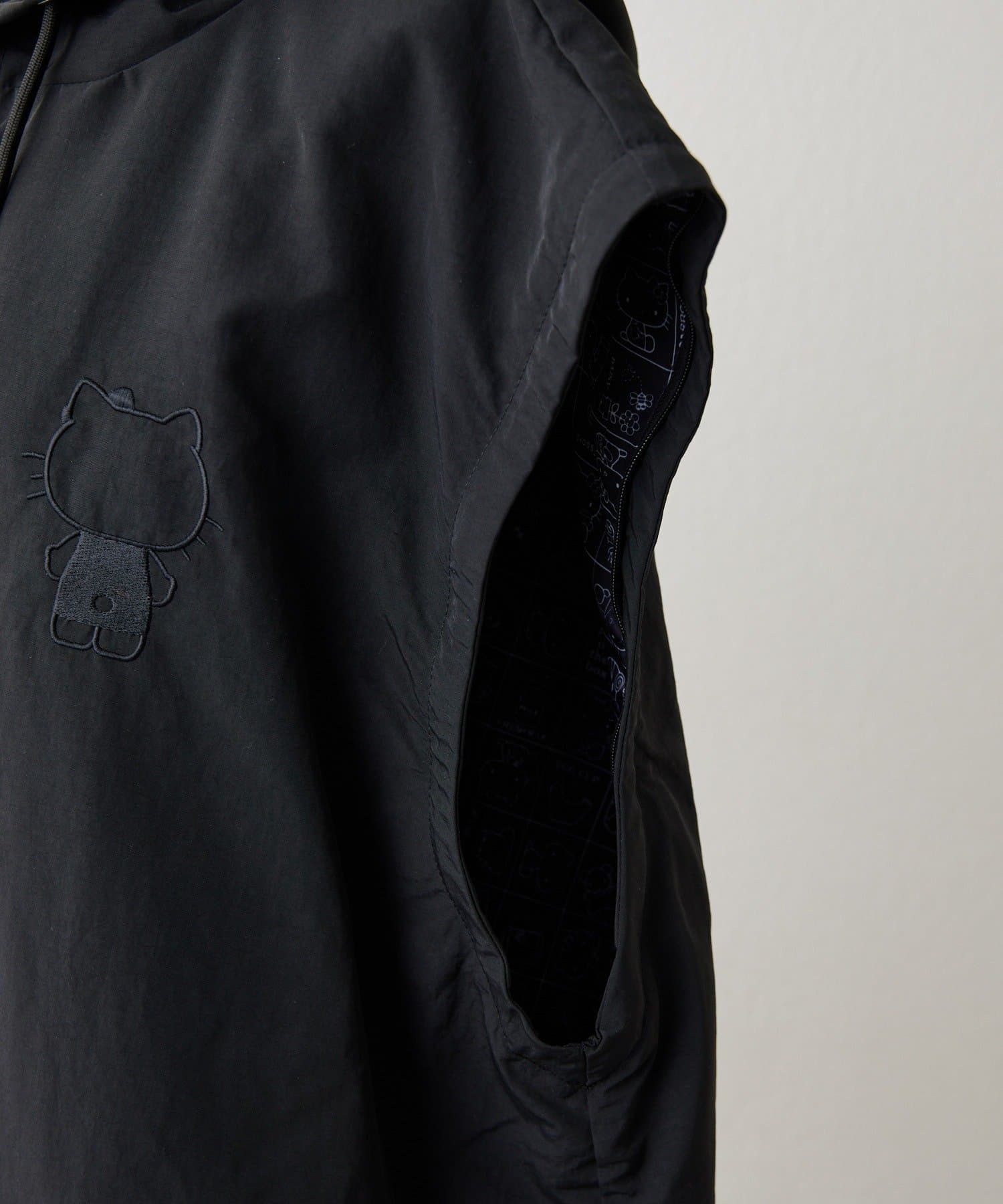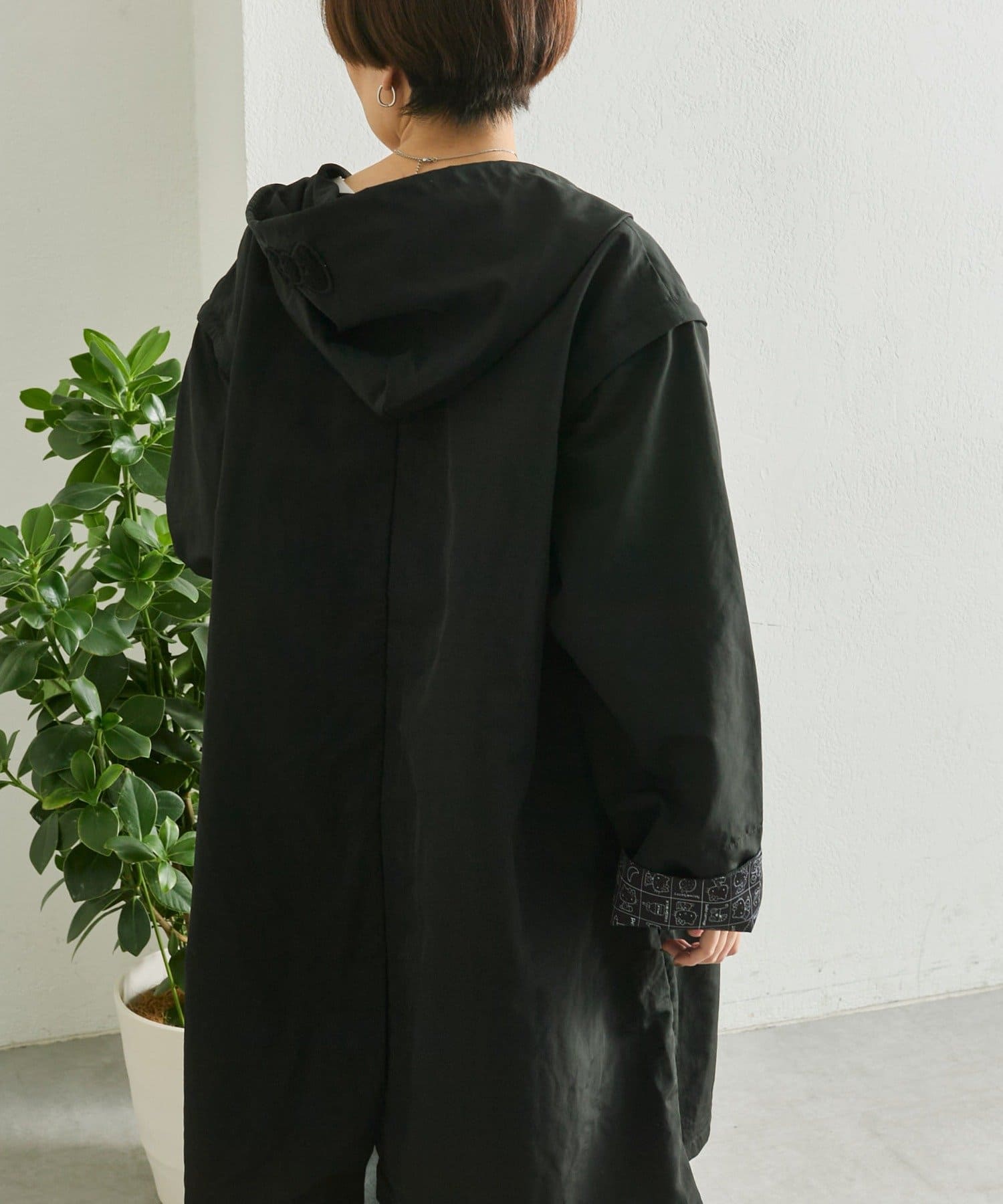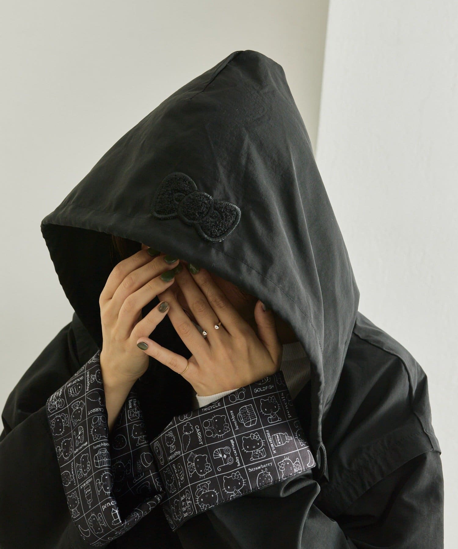 見頃の裏地と袖の裏地には、ブラックで落ち着いた印象のハローキティのプリント柄を使用。