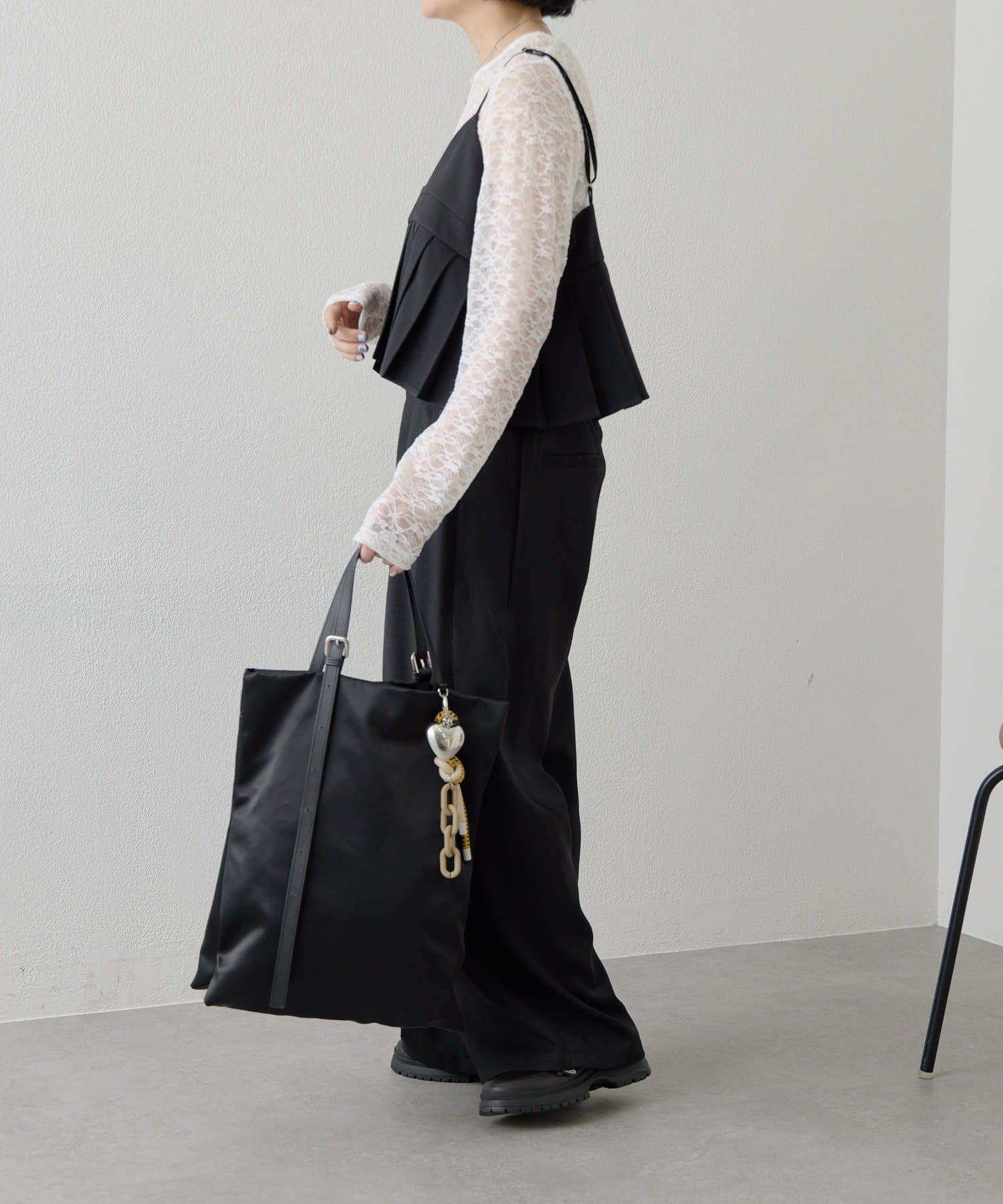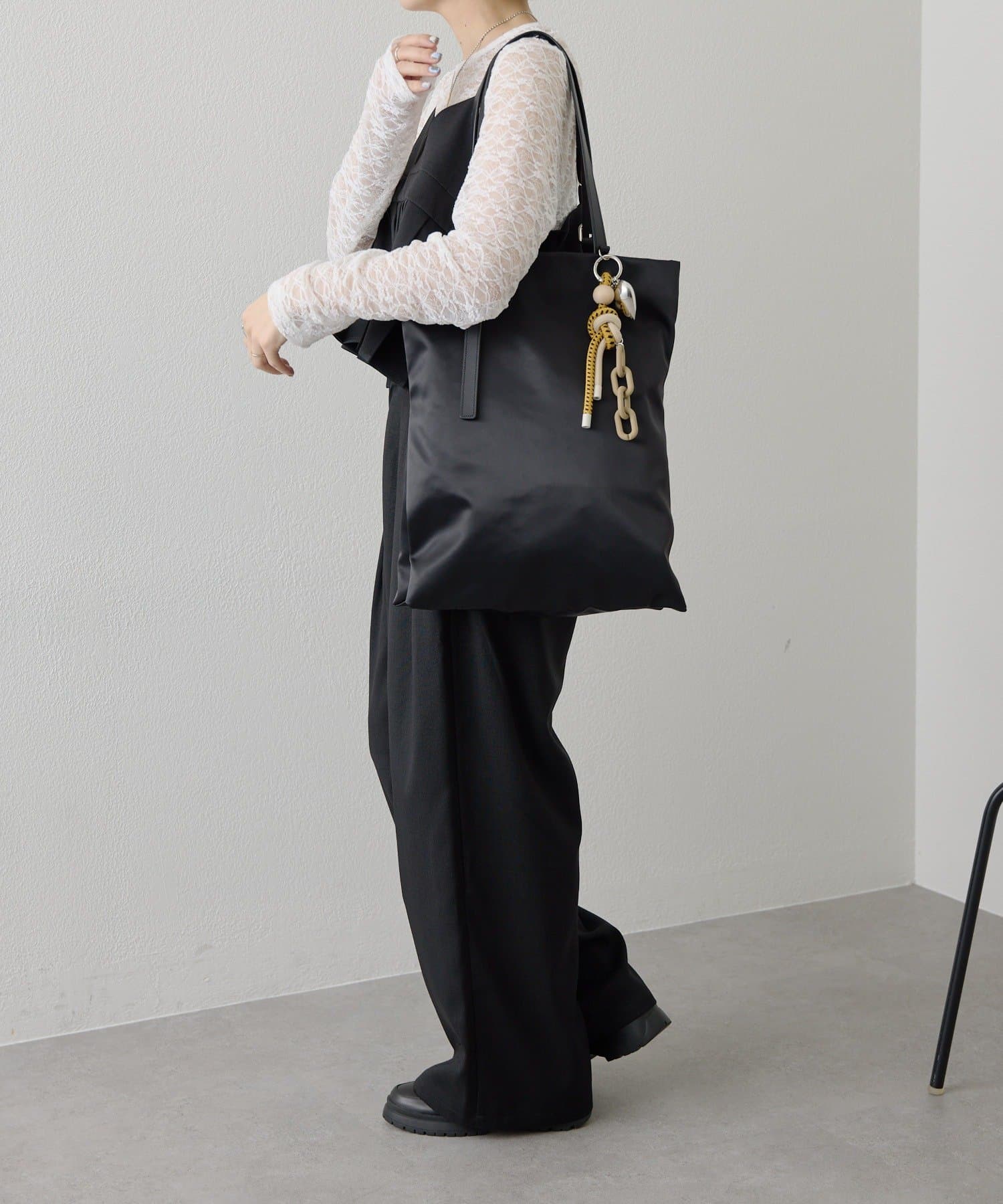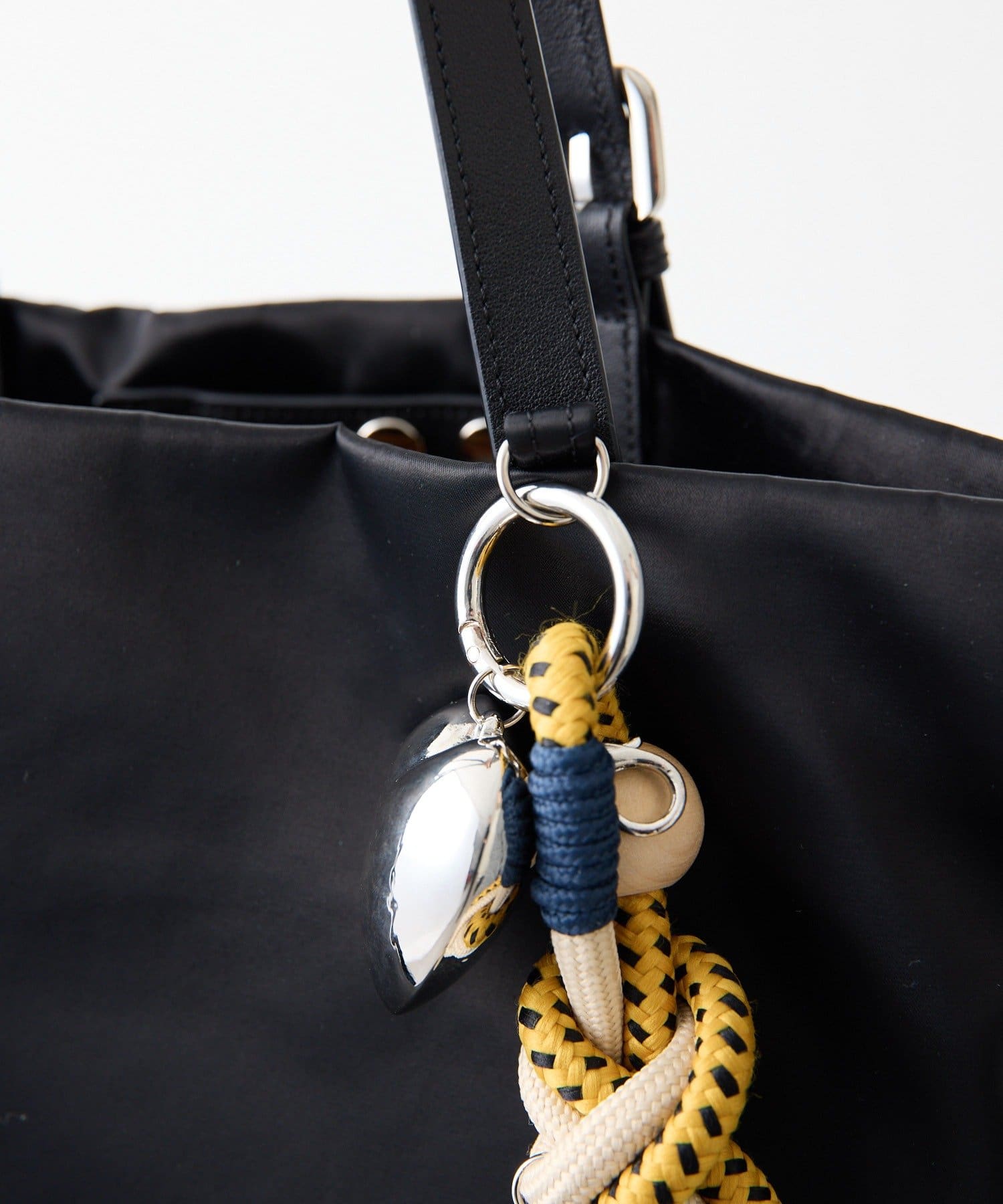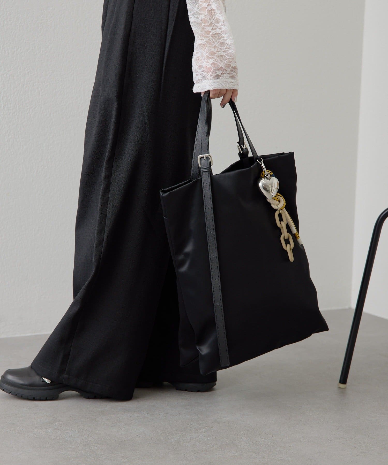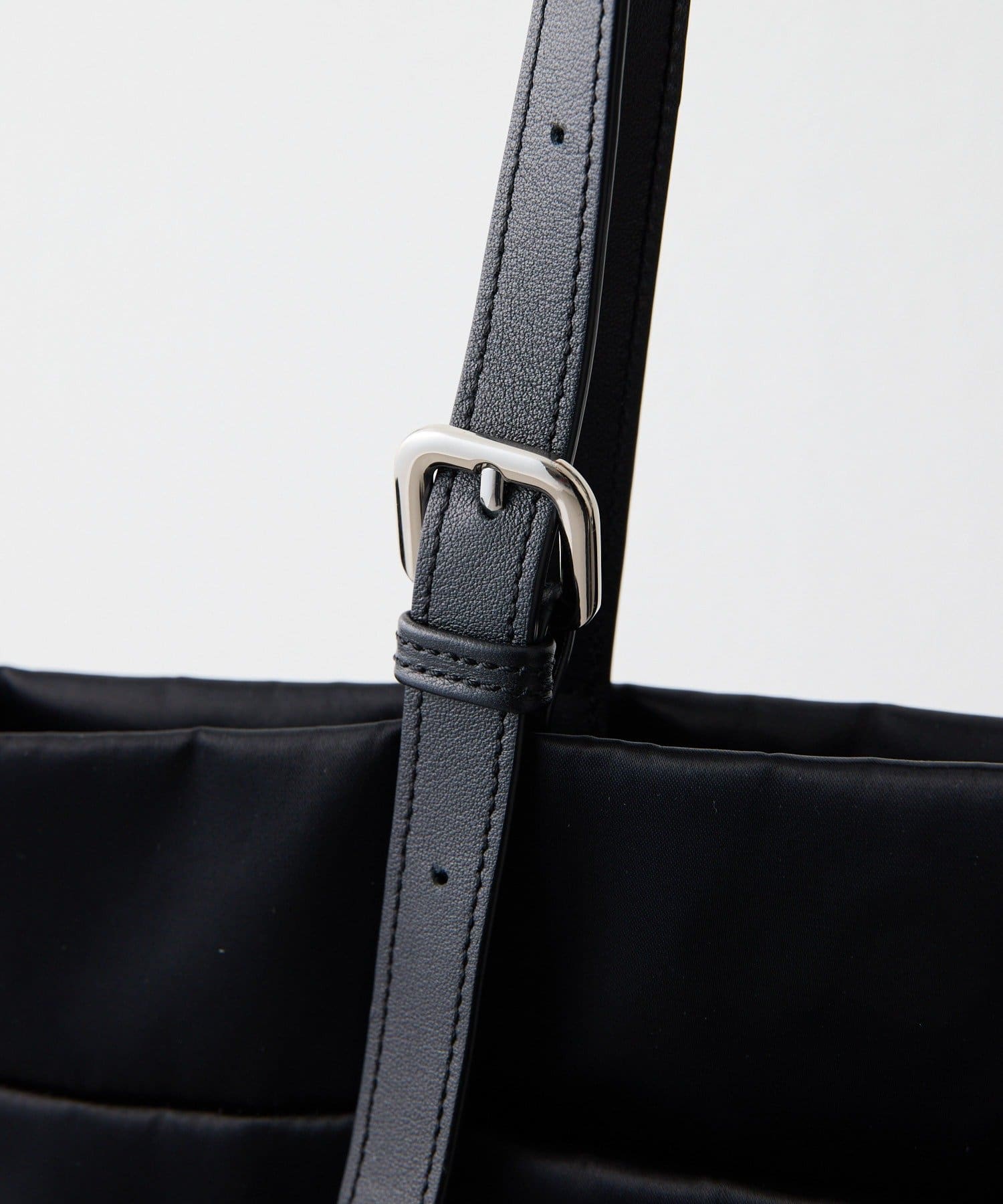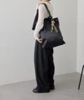 持ち手のベルトは片方が垂れ下がるアシンメトリーな仕様に、