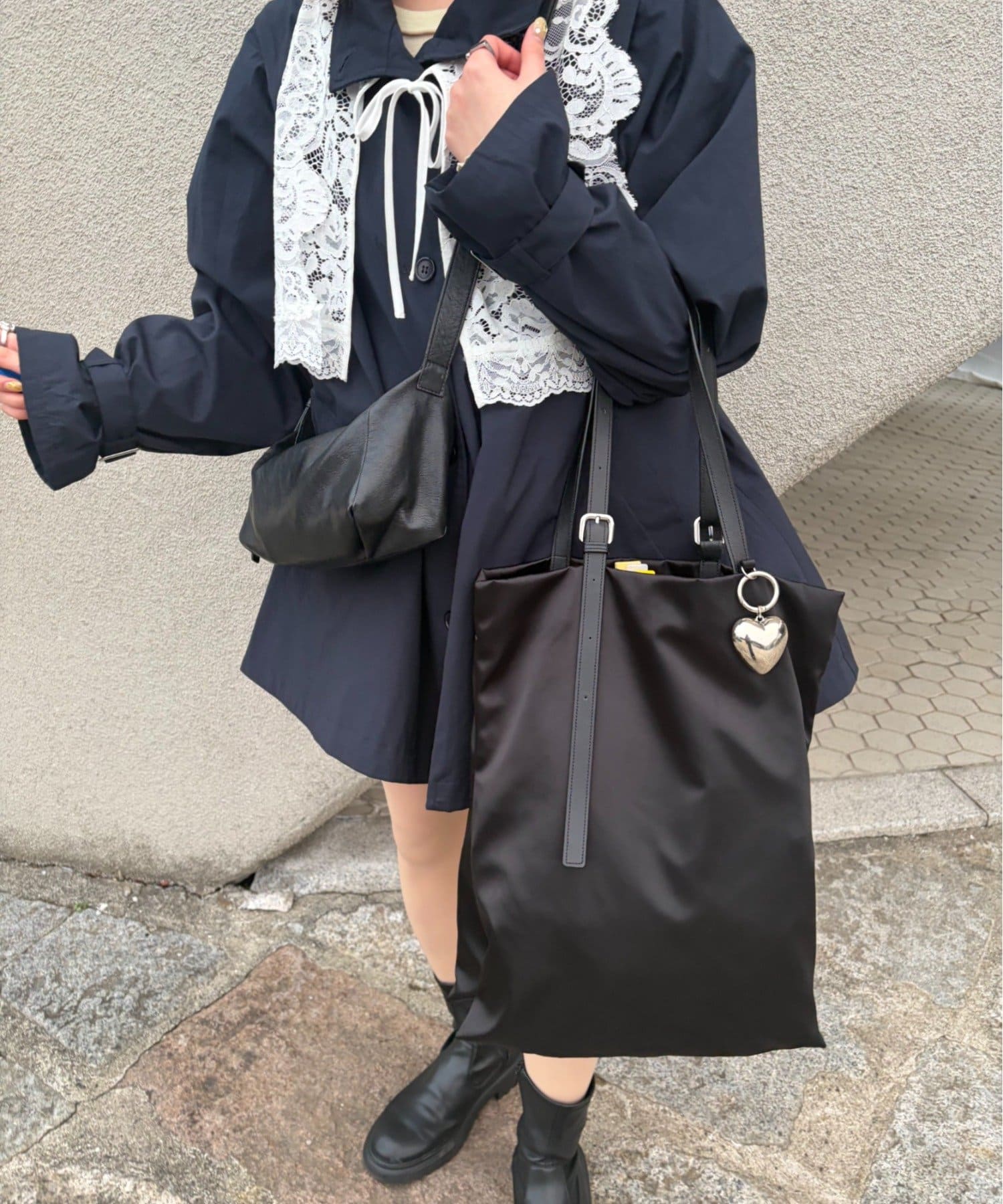 ⑤持ち手のベルトは片方が垂れ下がるアシンメトリーなデザイン