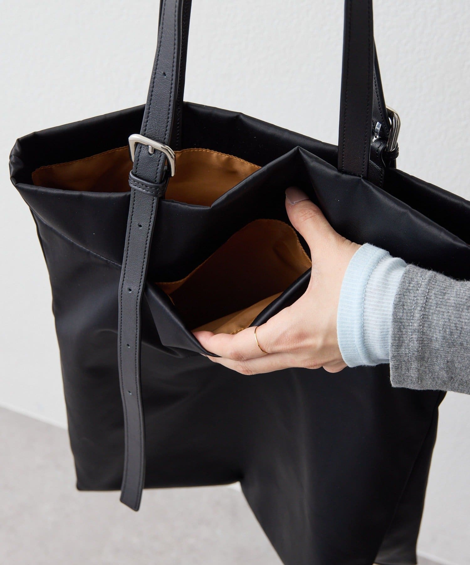 バッグ内側にはスナップボタン付きのベルトを付属、